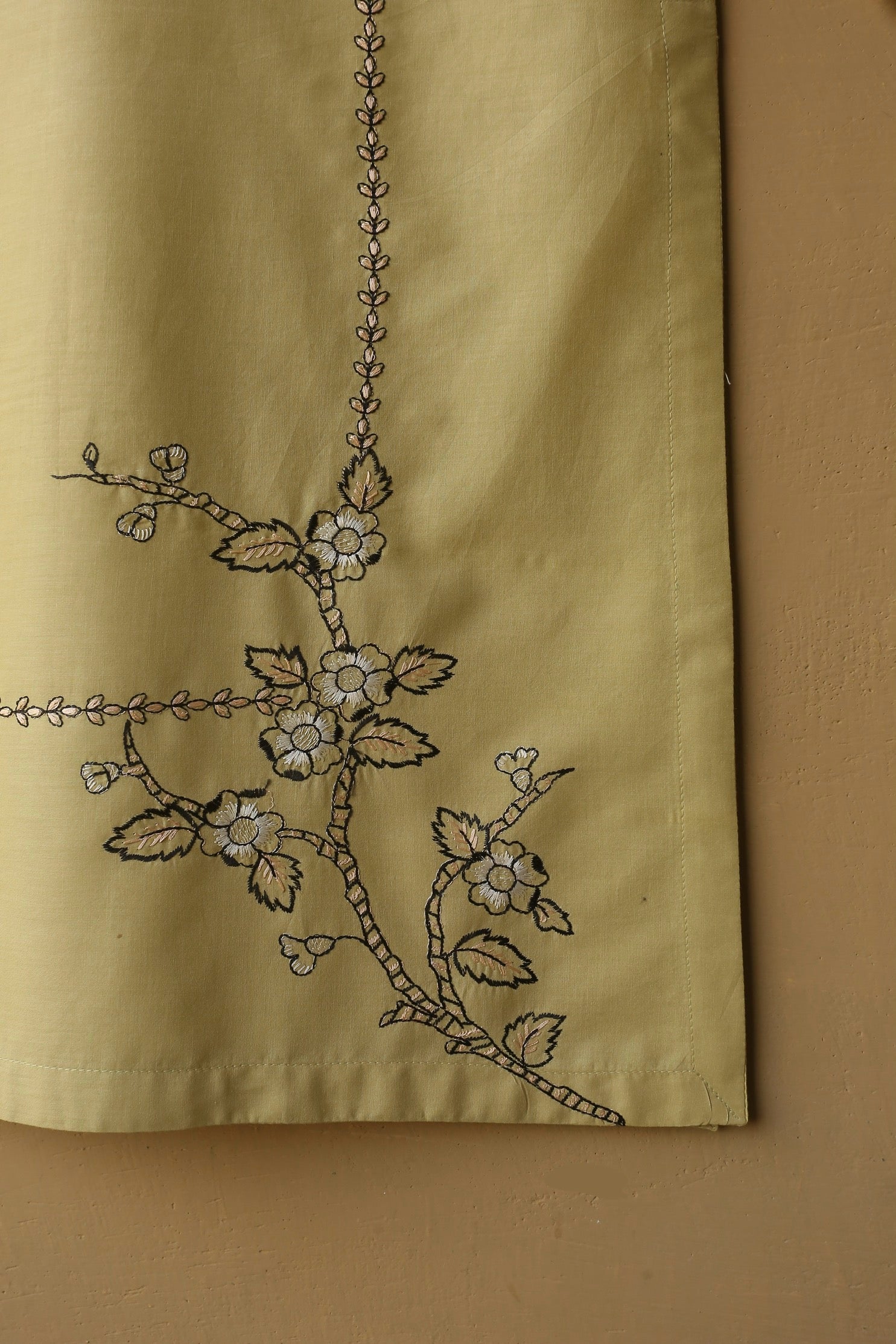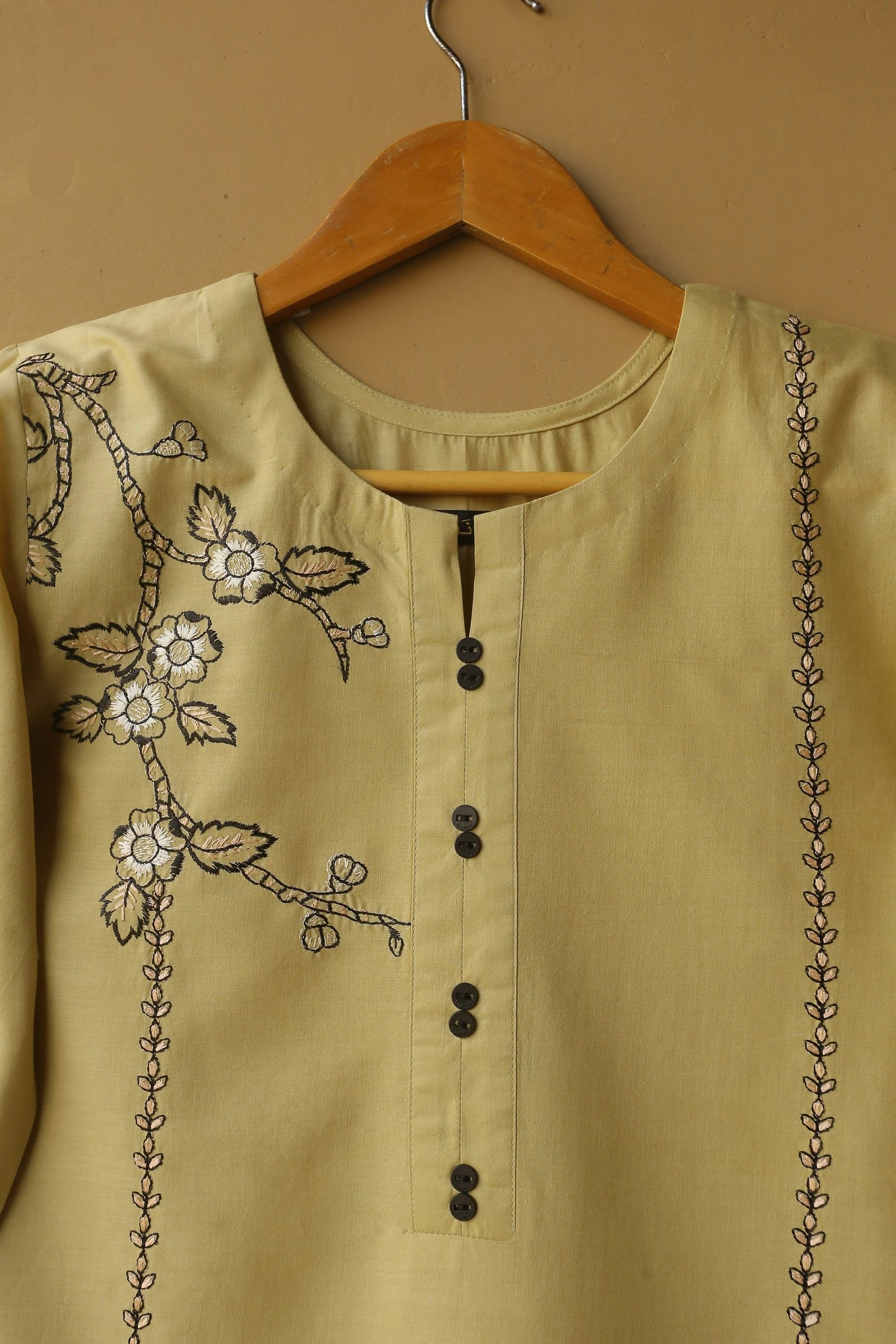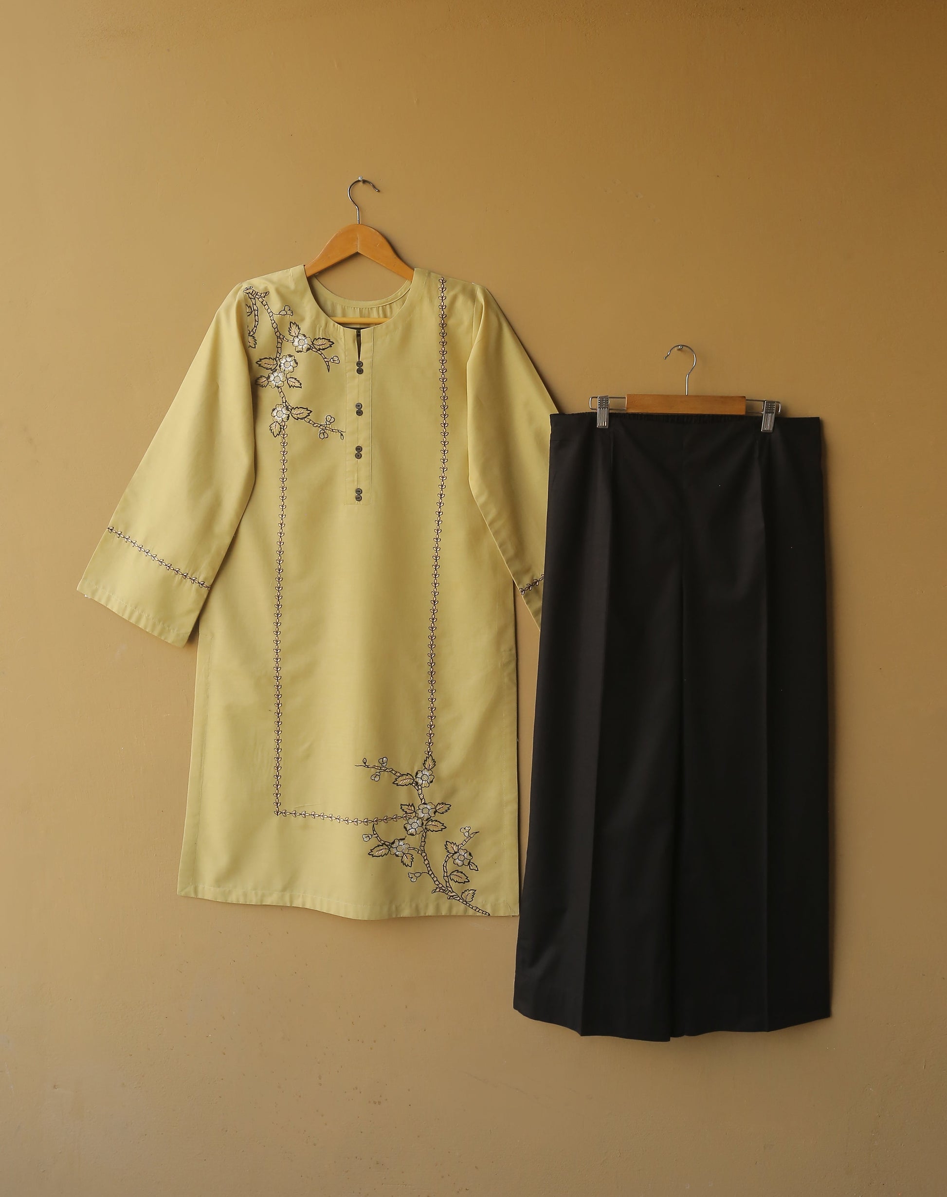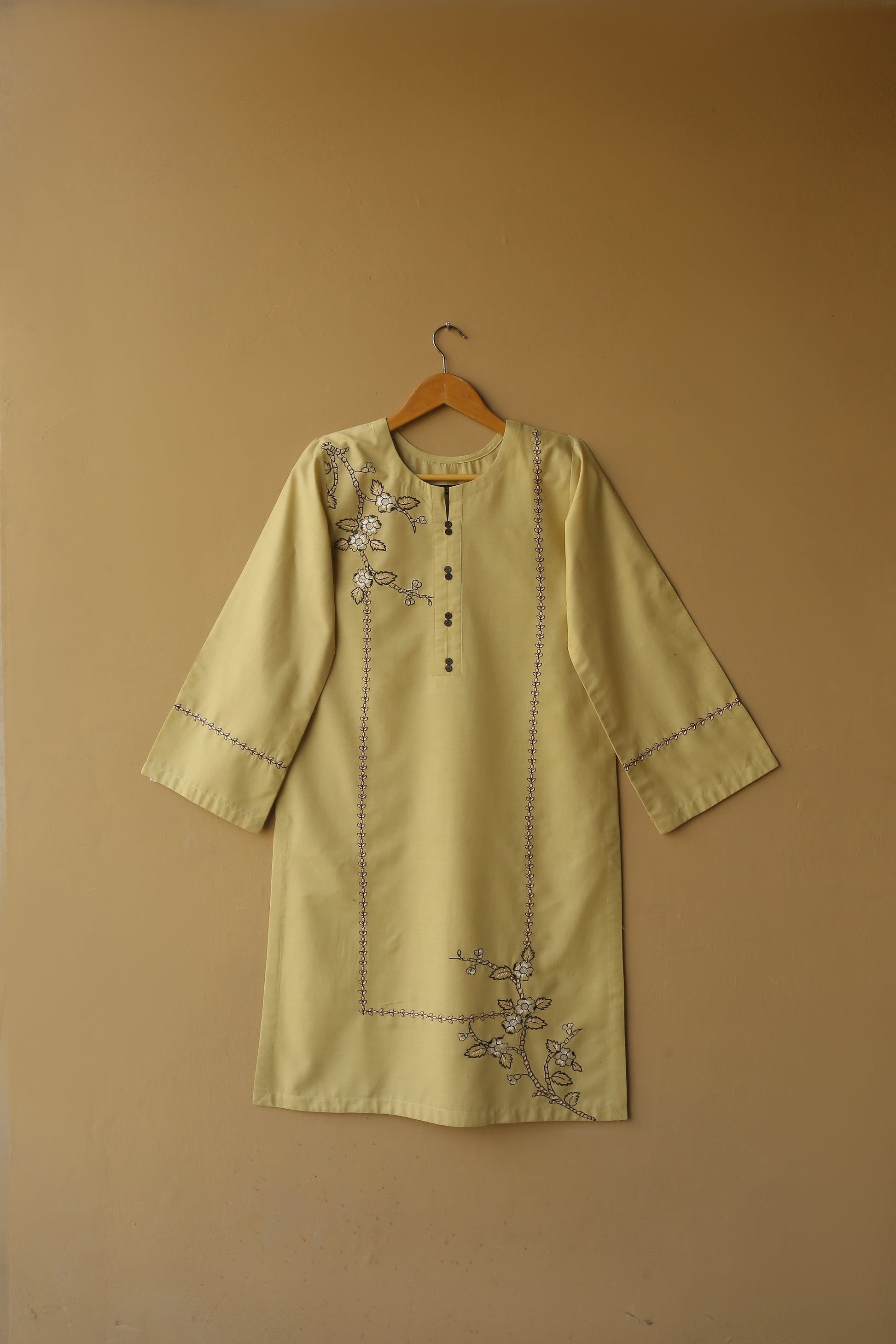 - Light pastel yellow embroidered kurta with delicate floral detailing