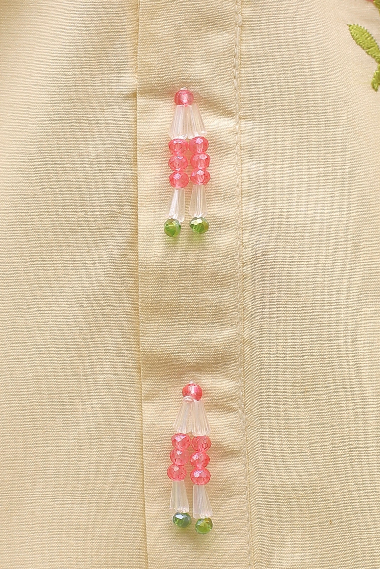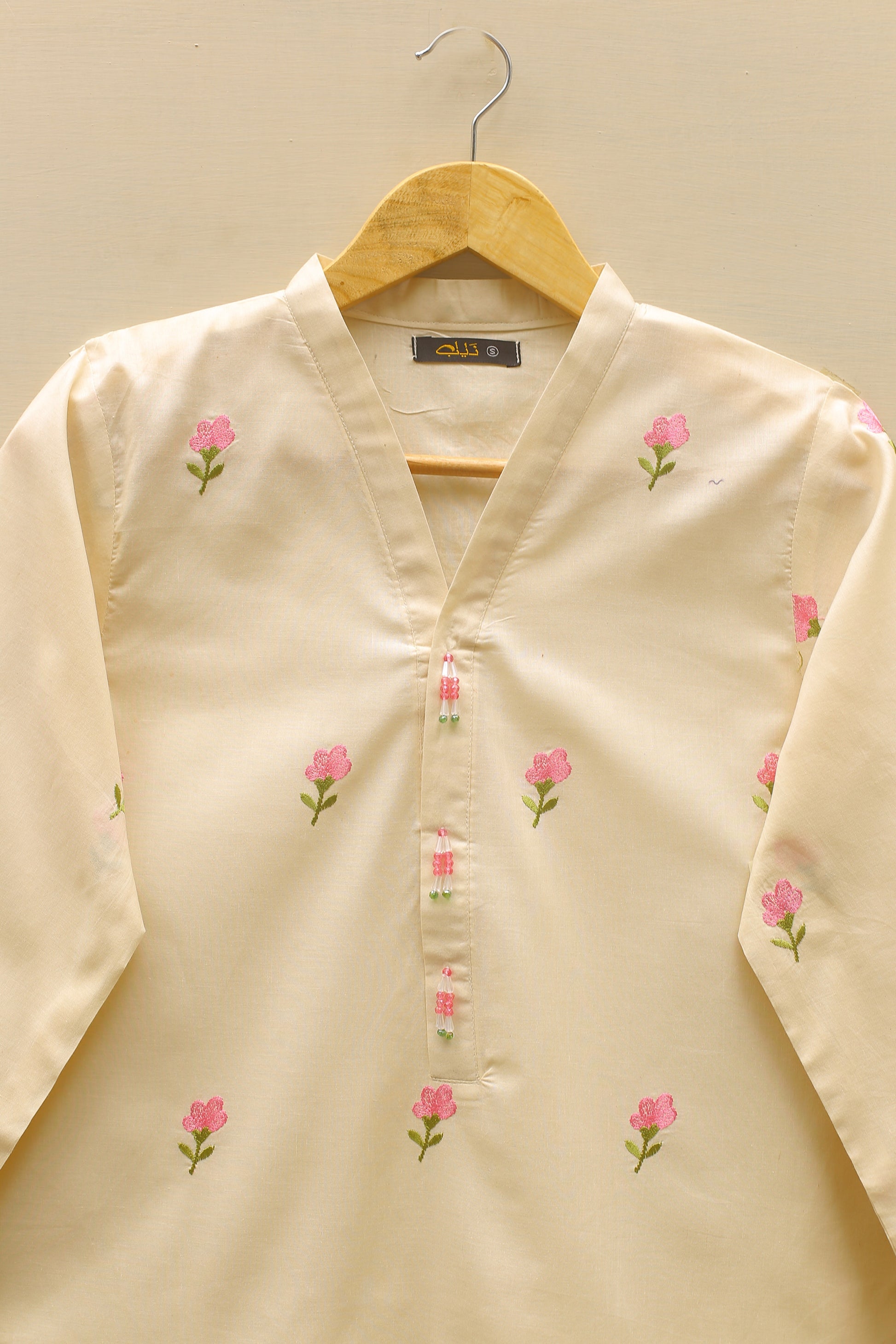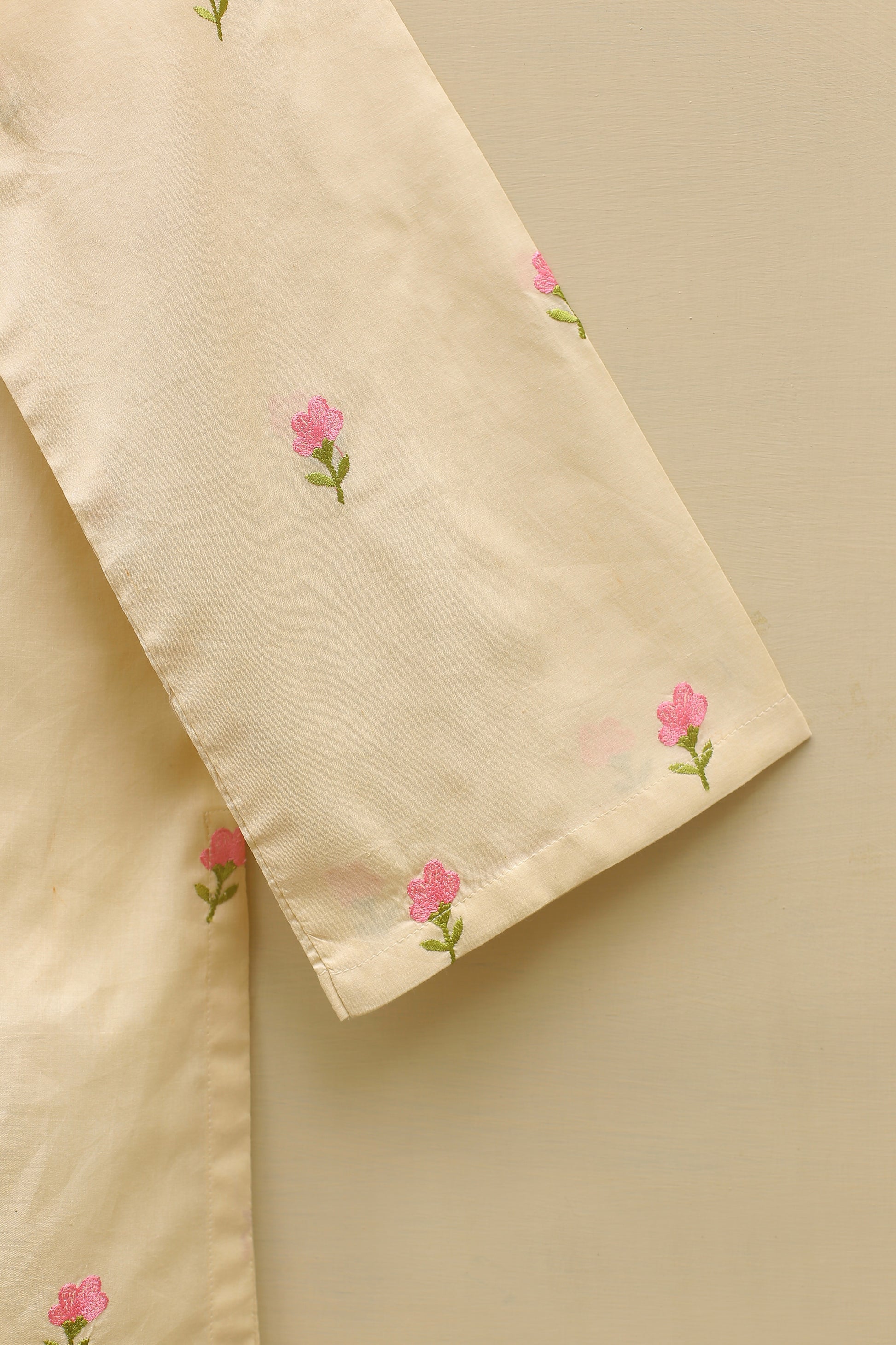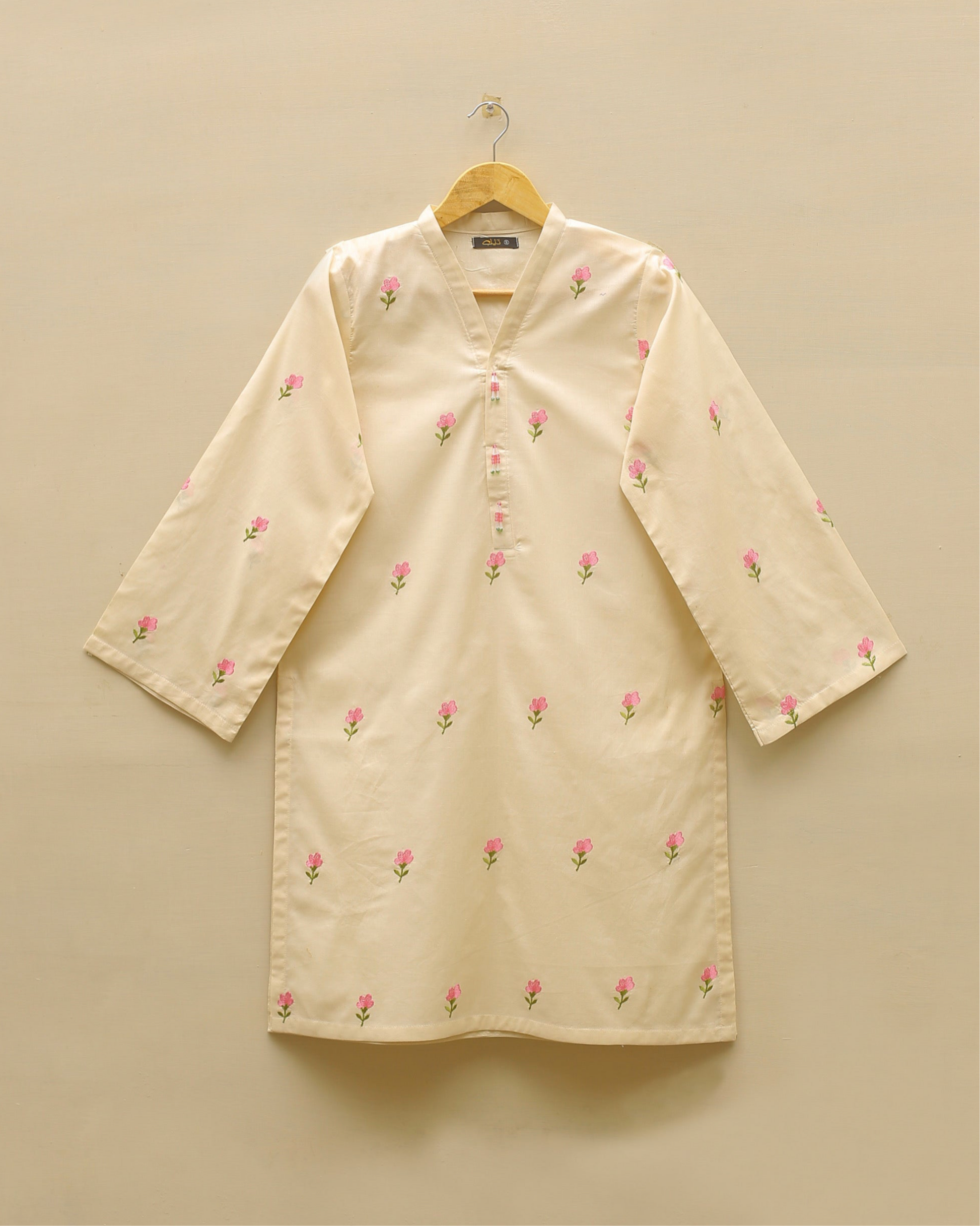 This is a beige-colored, long-sleeved cotton kurta featuring delicate pink floral embroidery. It has a V-neckline with a short button placket, offering a blend of traditional charm and casual elegance—perfect for everyday wear or light festive occasions.