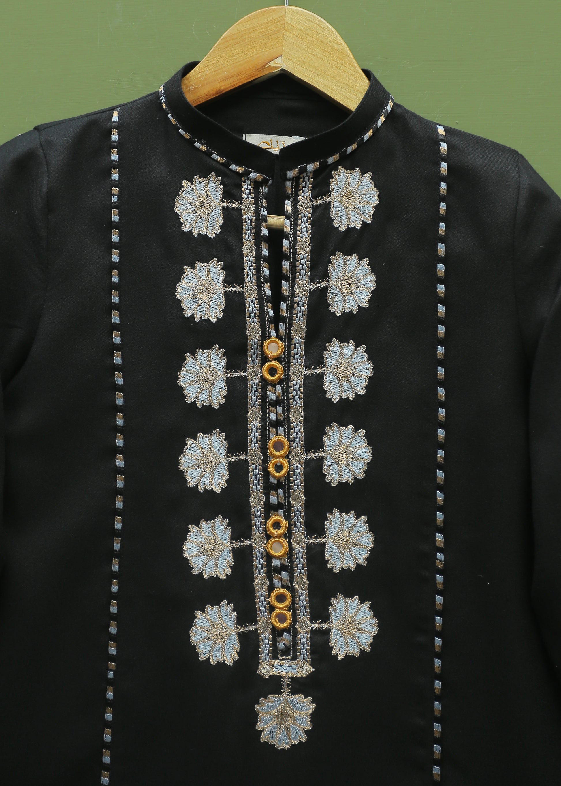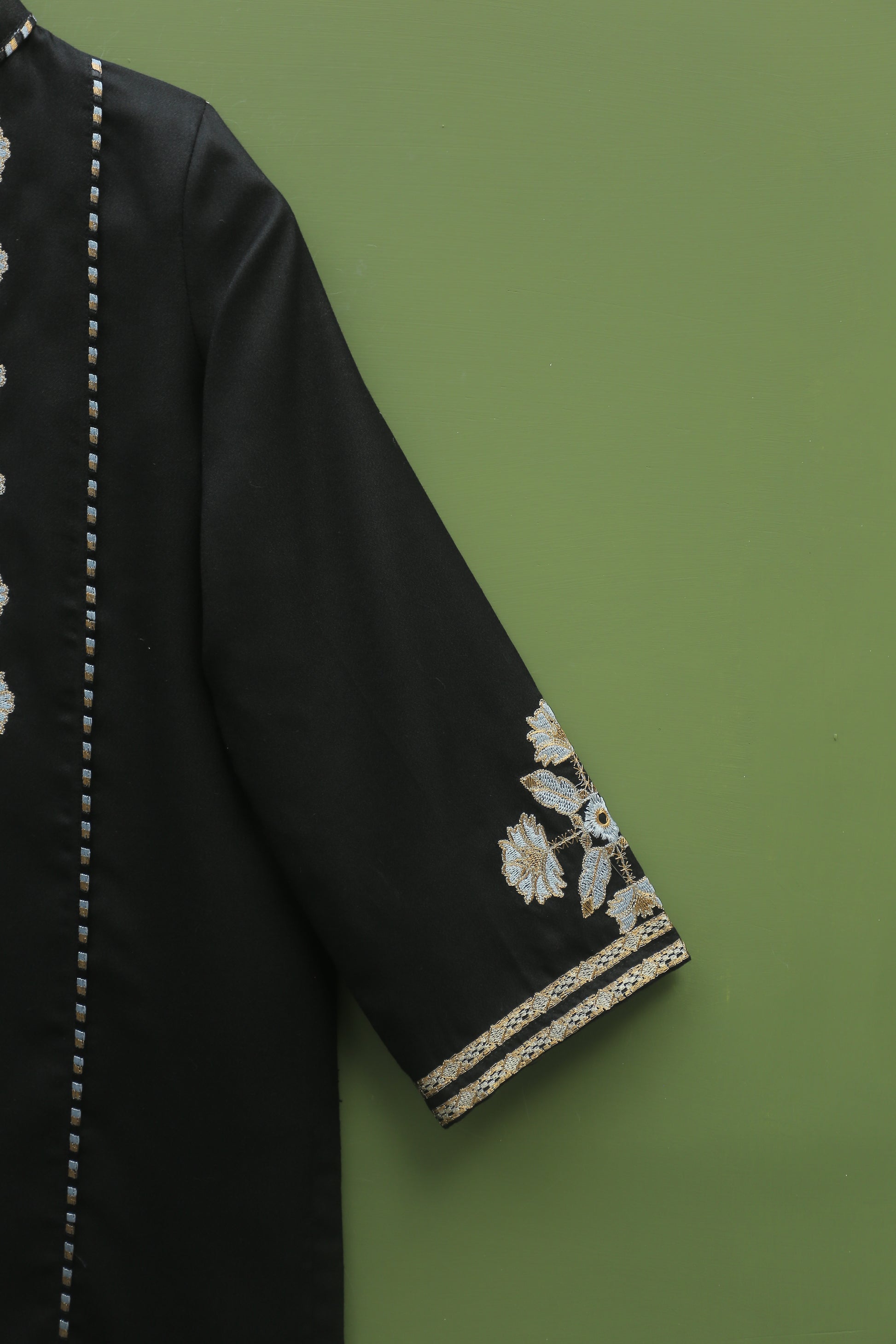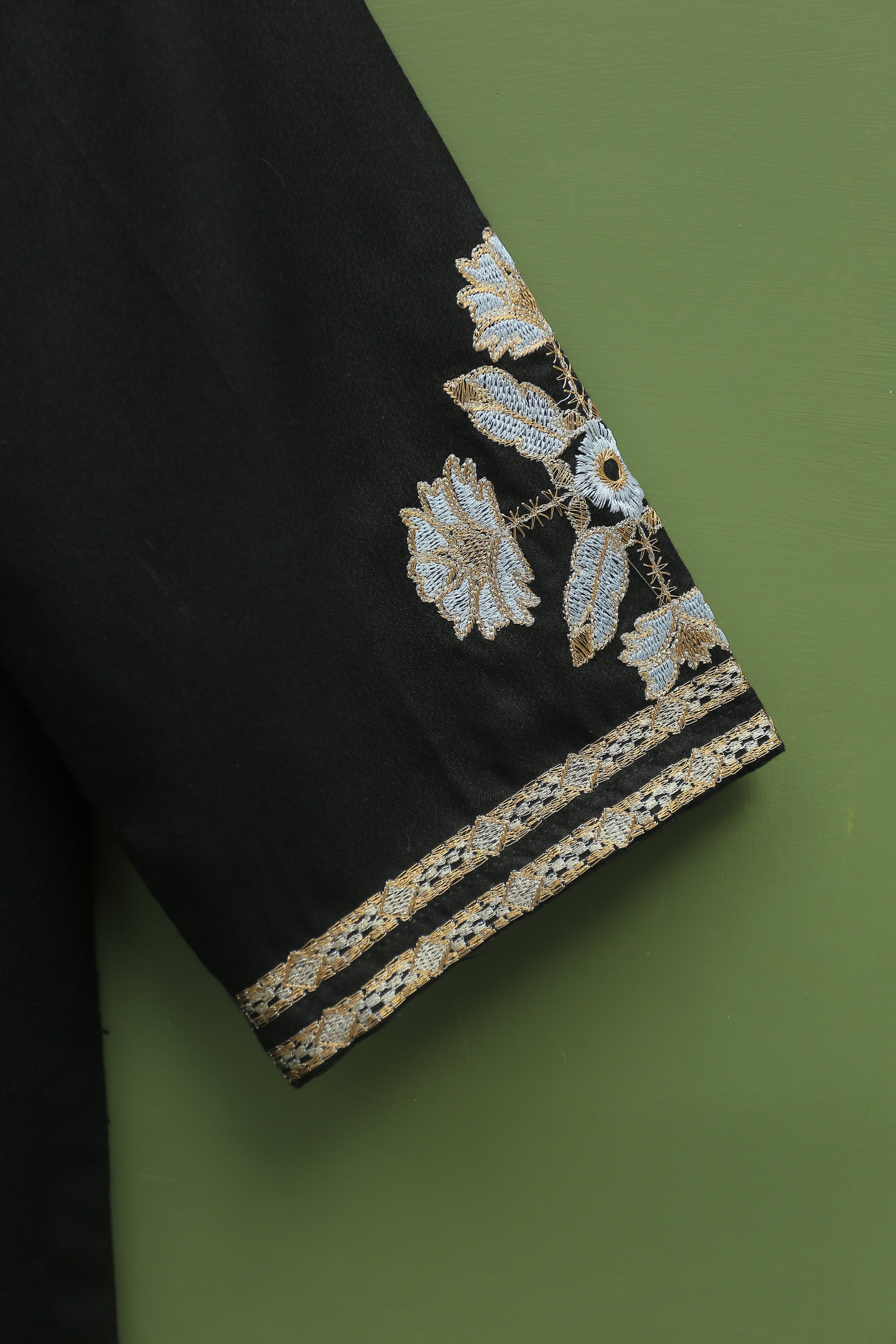 This stunning black A-line kurta features exquisite tilla and thread embroidery adorning the neckline and sleeves, adding a touch of elegance and sophistication. The flowing silhouette enhances comfort while maintaining a chic look. Paired with a matching flapper, this ensemble is perfect for both festive occasions and casual gatherings, making it a versatile addition to your wardrobe.