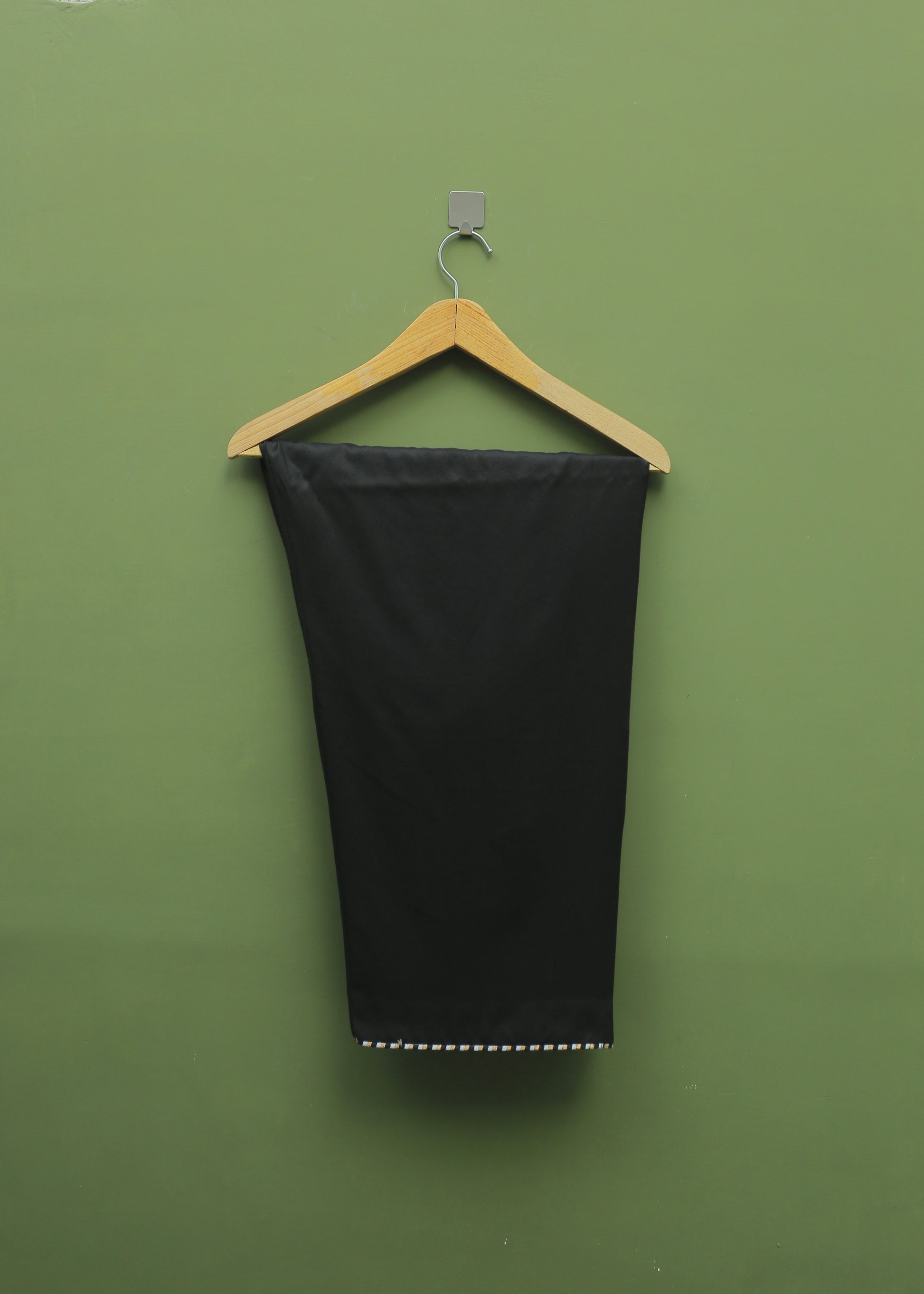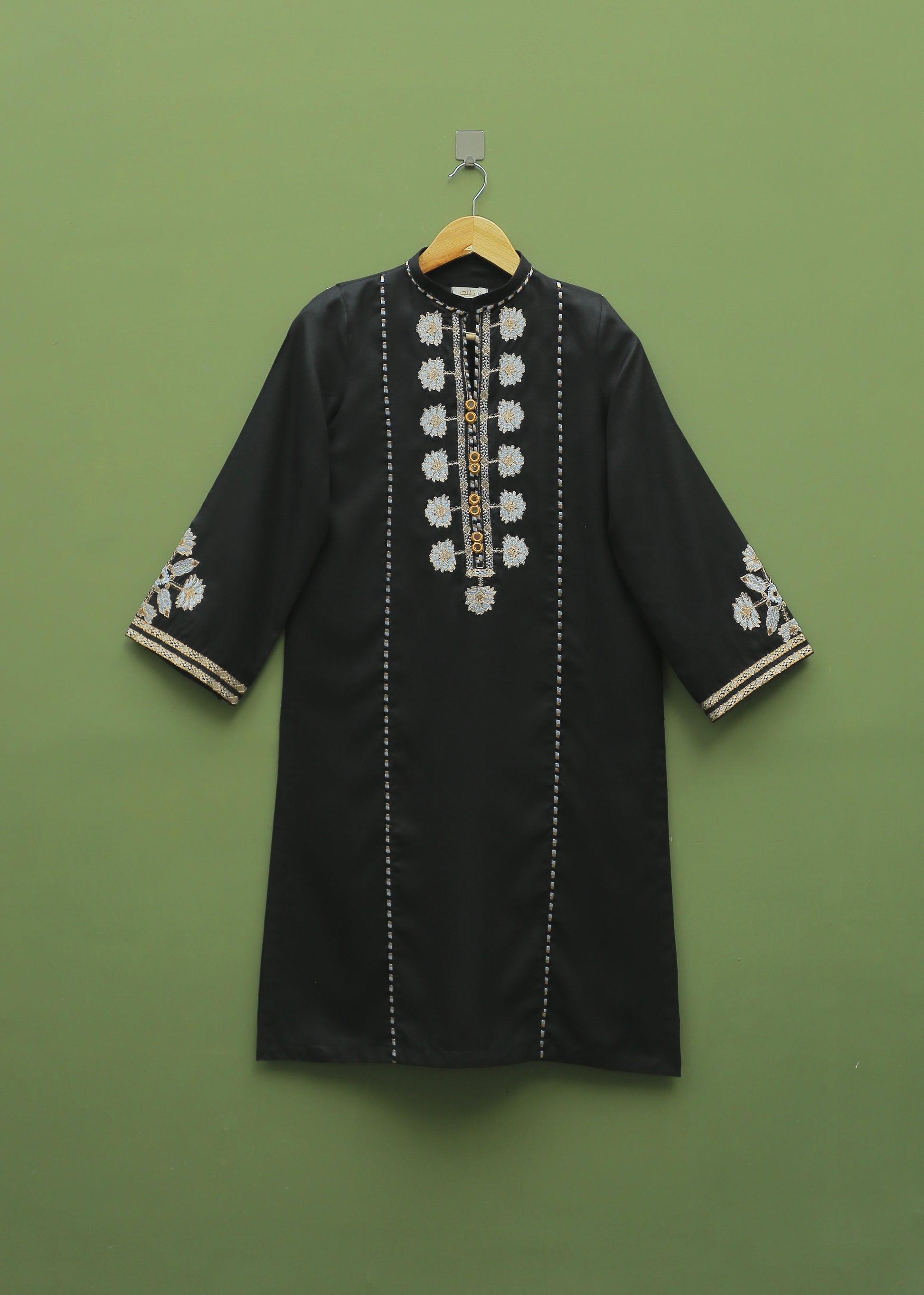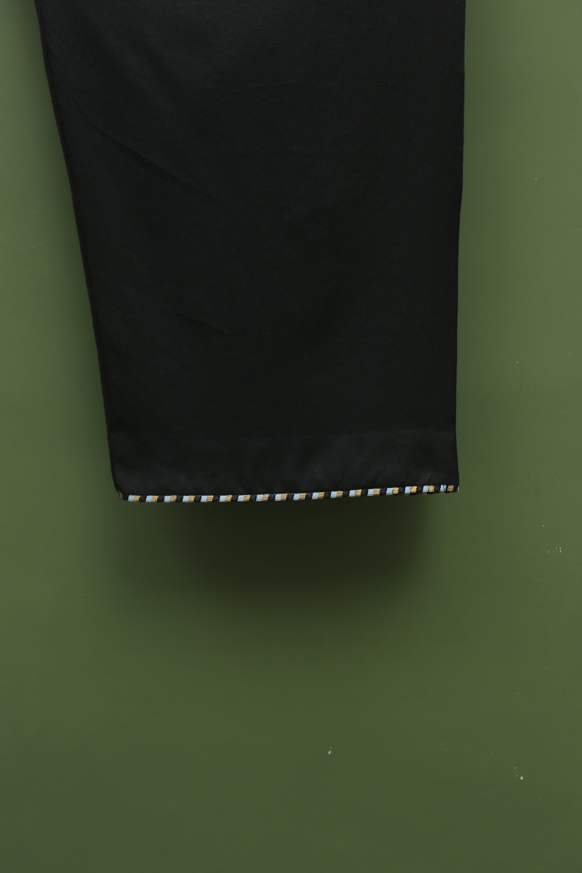 This stunning black A-line kurta features exquisite tilla and thread embroidery adorning the neckline and sleeves, adding a touch of elegance and sophistication. The flowing silhouette enhances comfort while maintaining a chic look. Paired with a matching flapper, this ensemble is perfect for both festive occasions and casual gatherings, making it a versatile addition to your wardrobe.