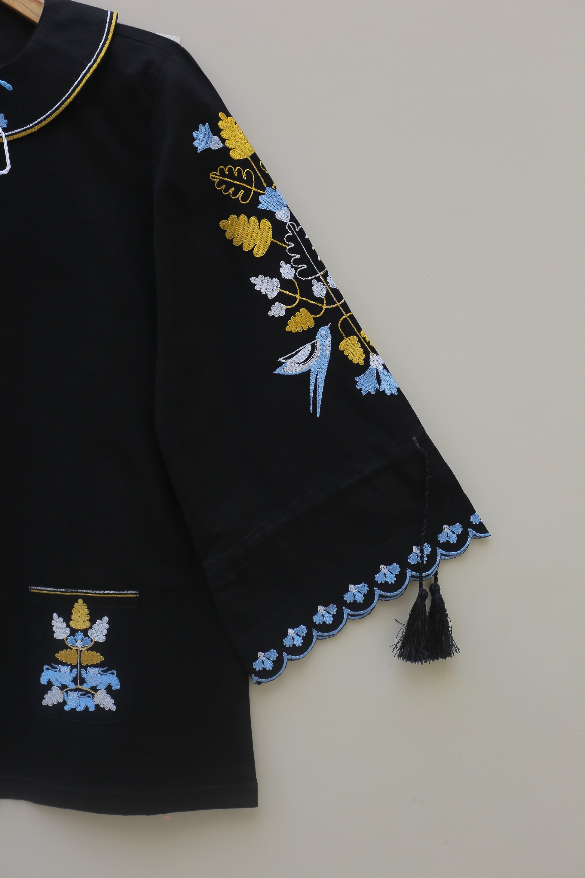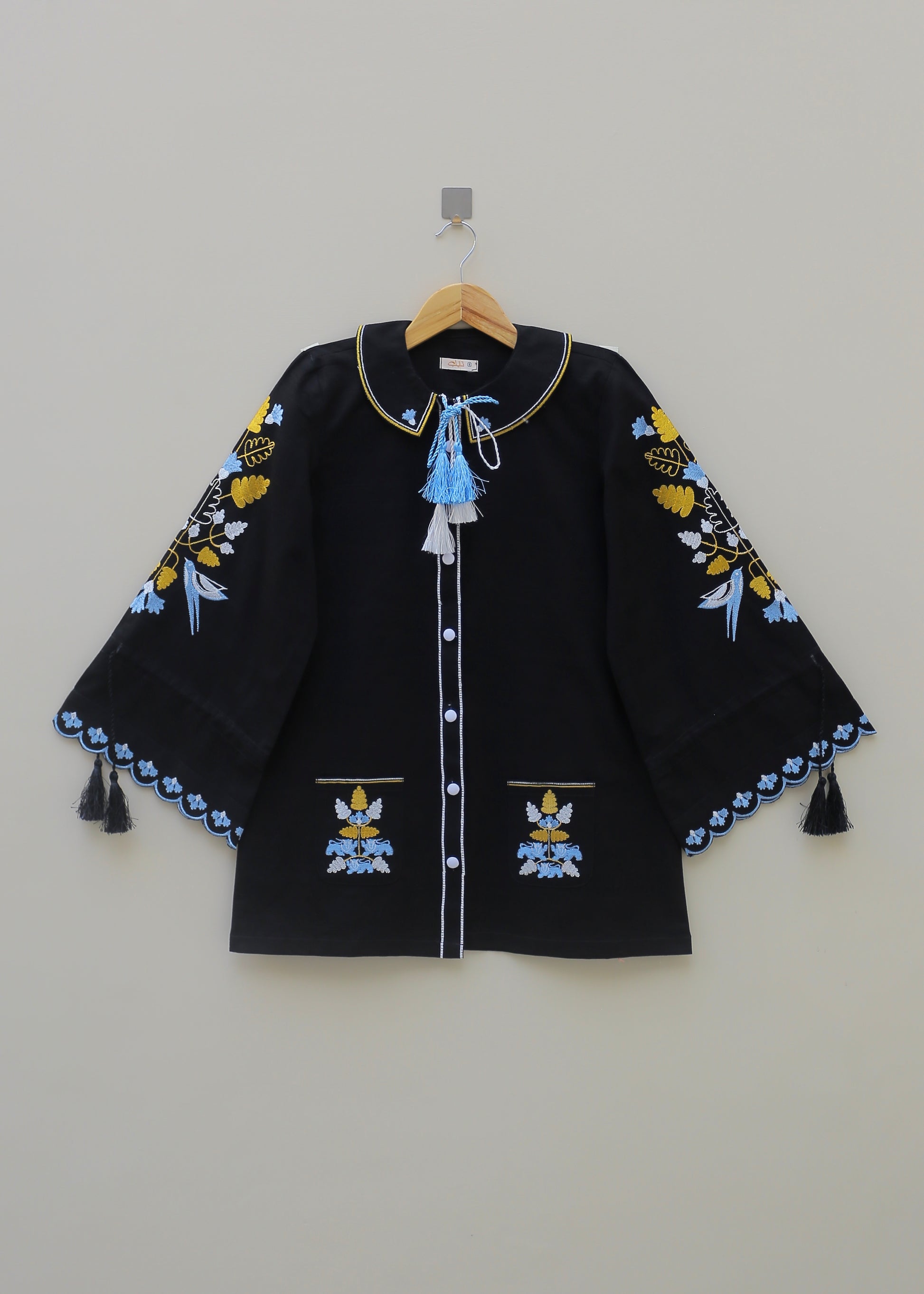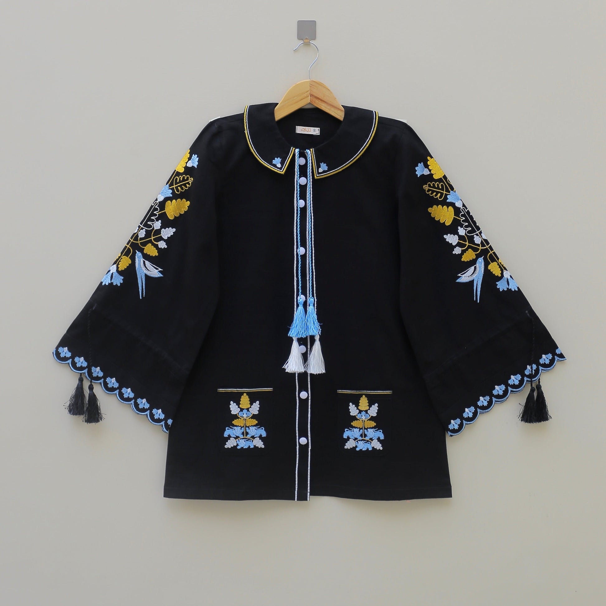 This chic black button-down top features a beautifully embroidered front, accentuated by pockets adorned with vibrant multi-colored embroidery. The shirt showcases voluminous sleeves with elegant cutwork at the sleeve openings, adding a touch of sophistication. Complete with a charming doll collar, this top effortlessly combines style and comfort, making it a versatile addition to your wardrobe.