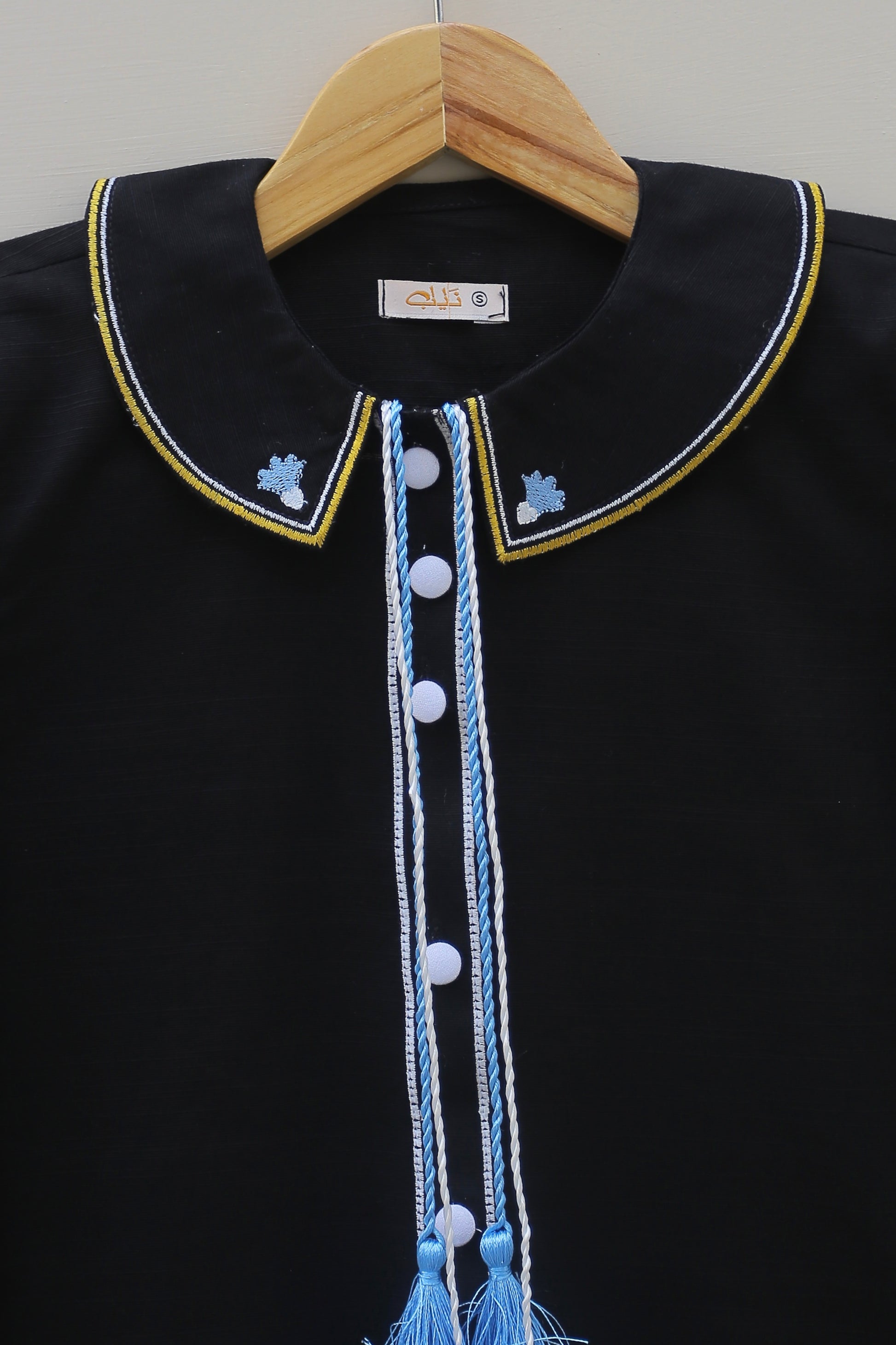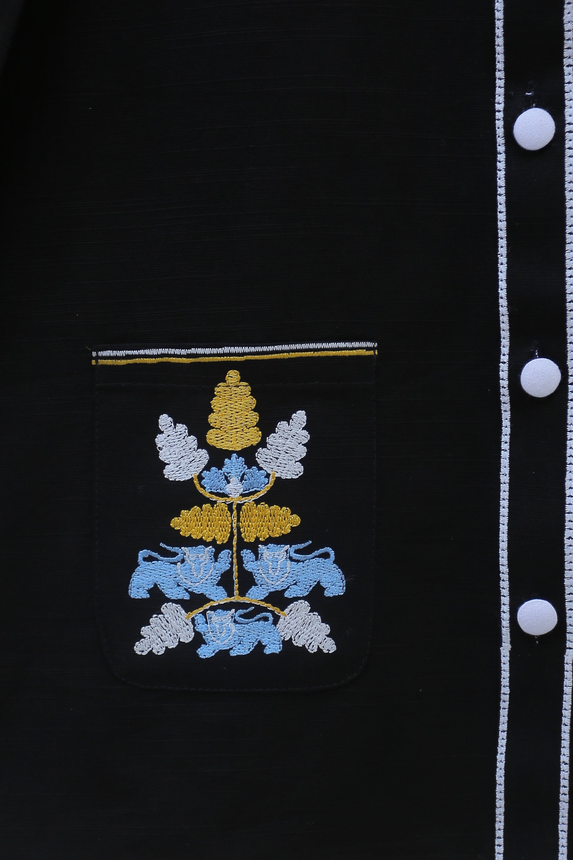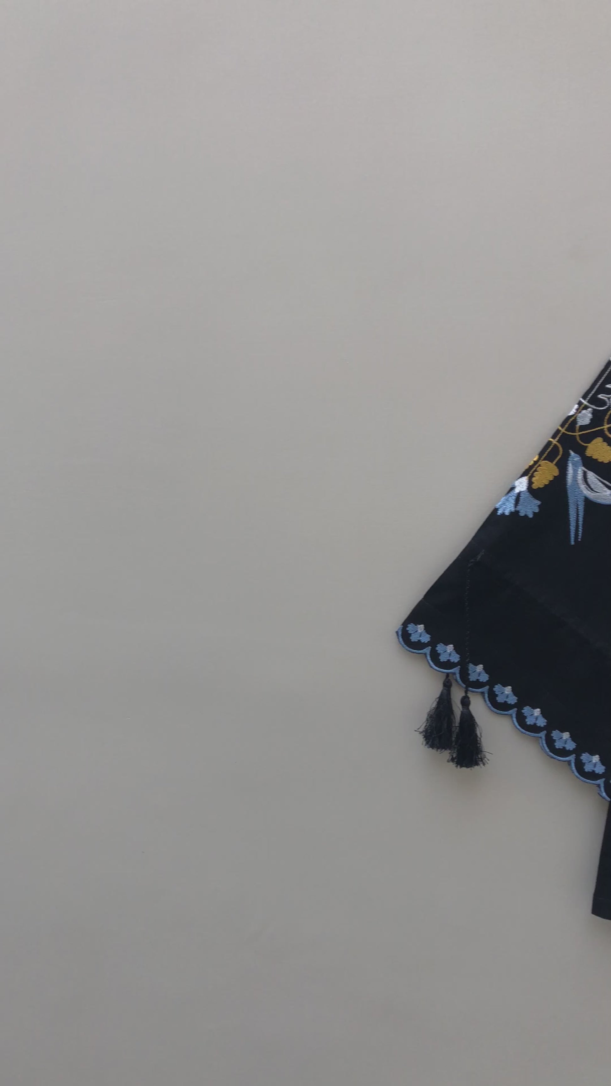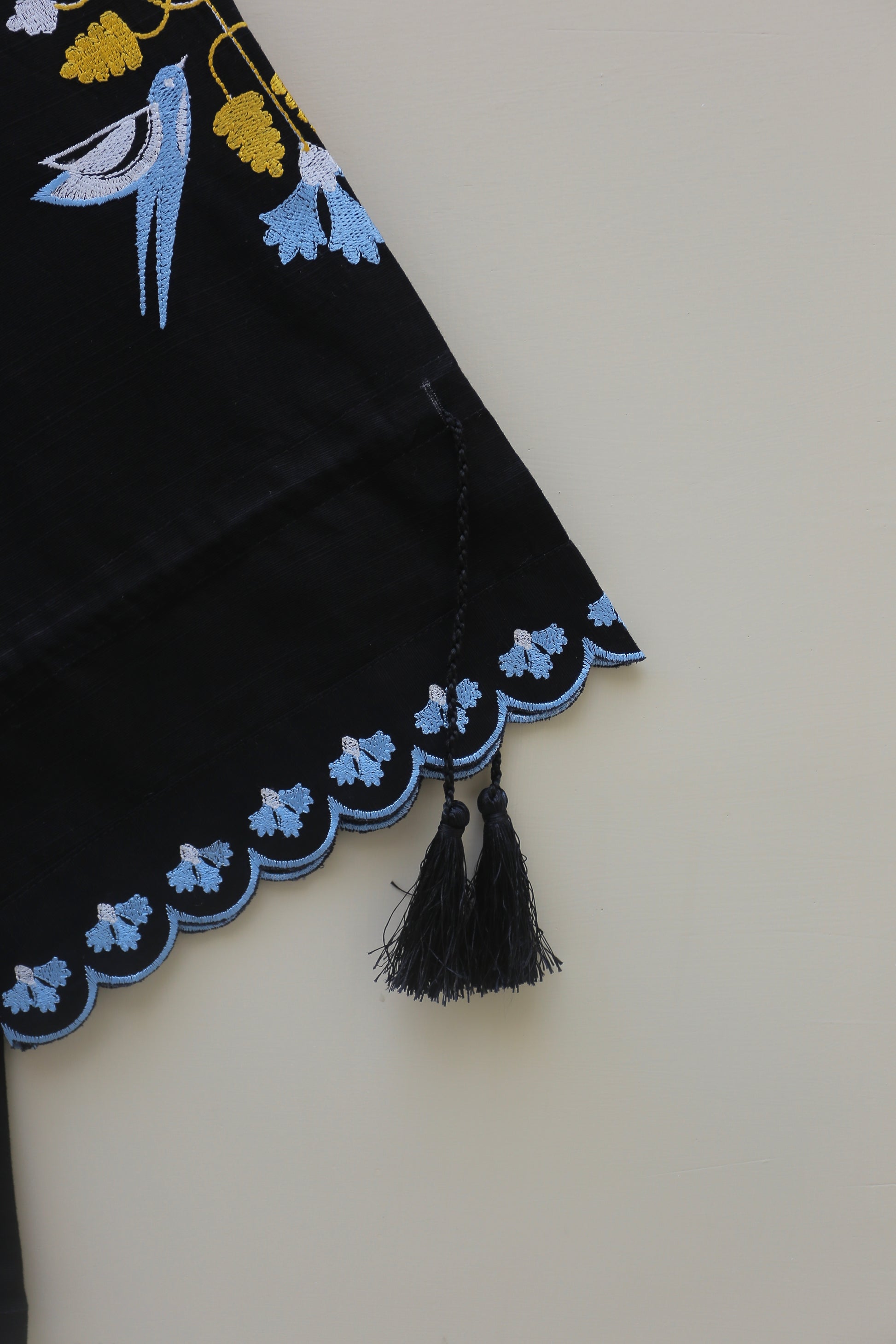 This chic black button-down top features a beautifully embroidered front, accentuated by pockets adorned with vibrant multi-colored embroidery. The shirt showcases voluminous sleeves with elegant cutwork at the sleeve openings, adding a touch of sophistication. Complete with a charming doll collar, this top effortlessly combines style and comfort, making it a versatile addition to your wardrobe.