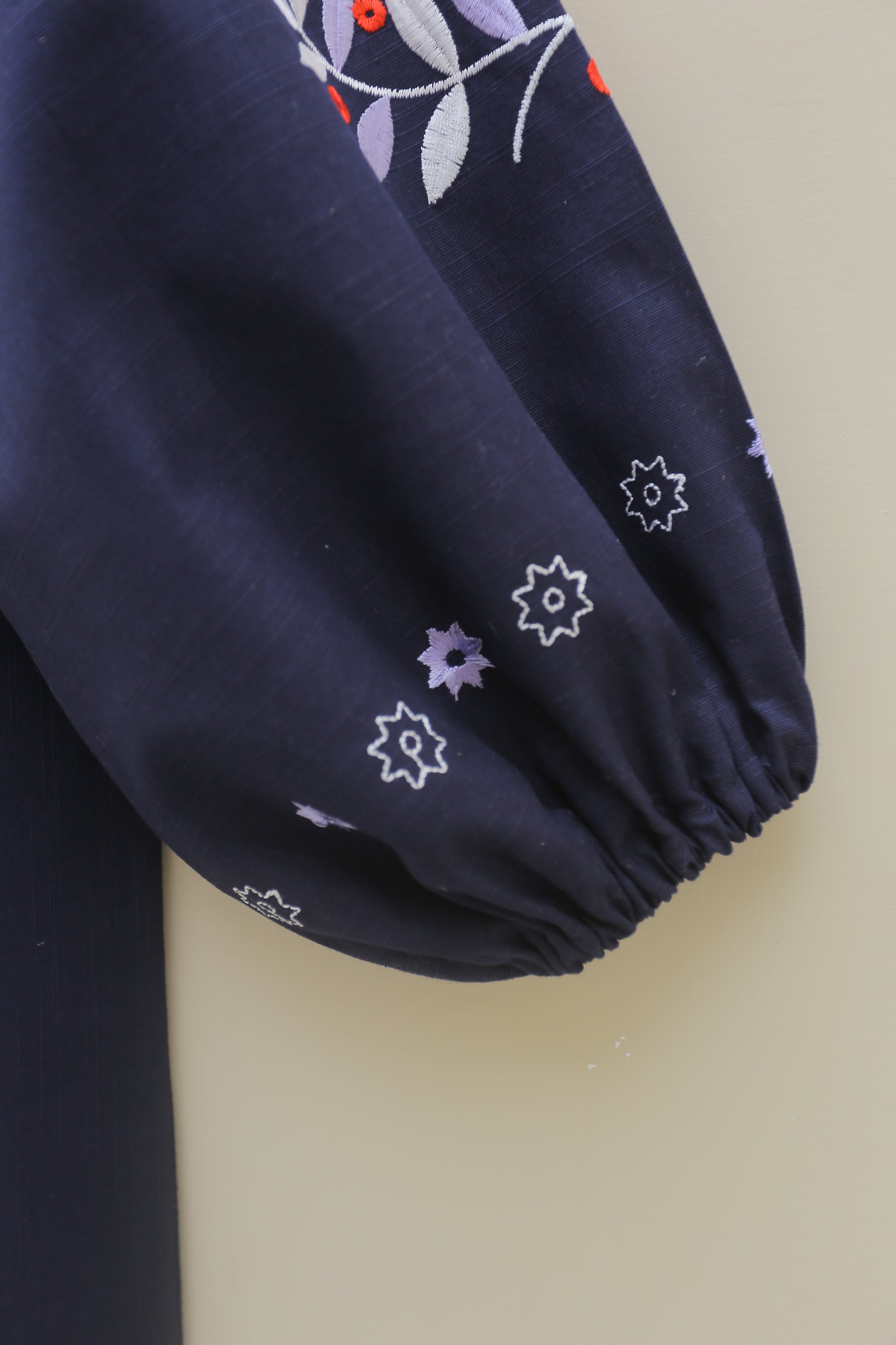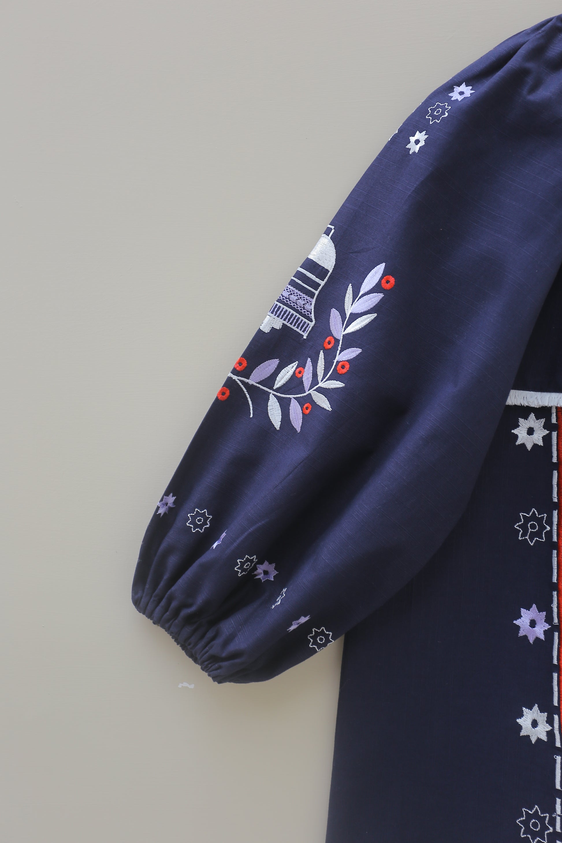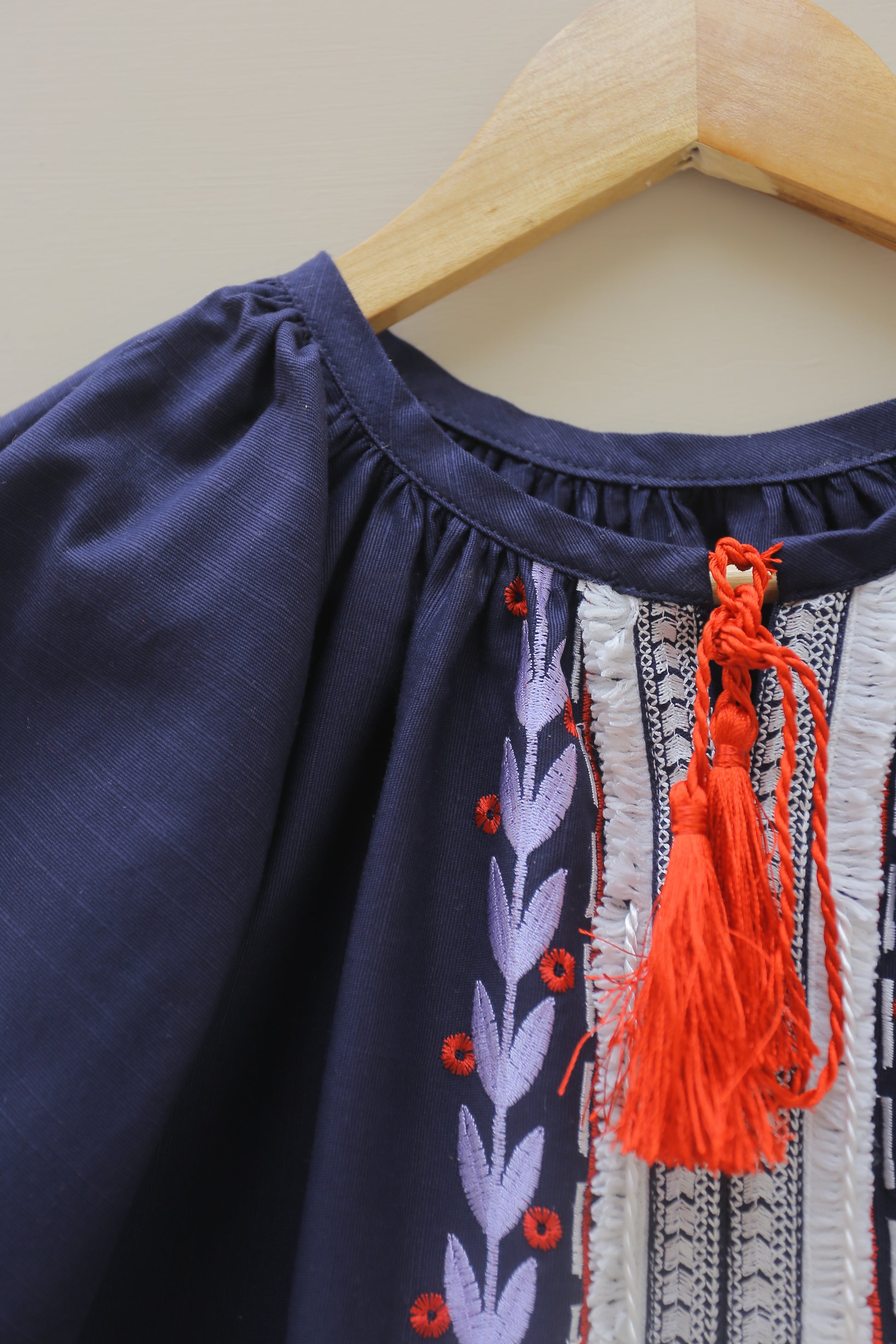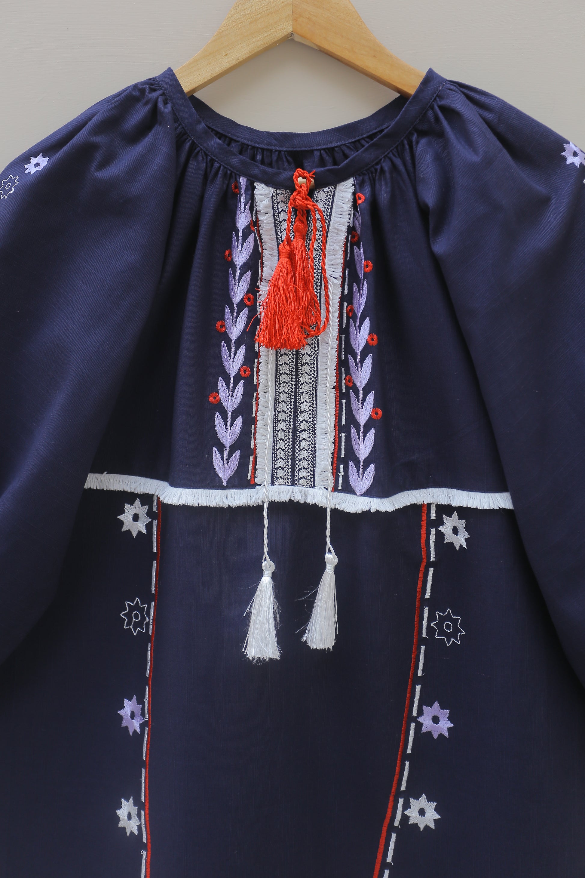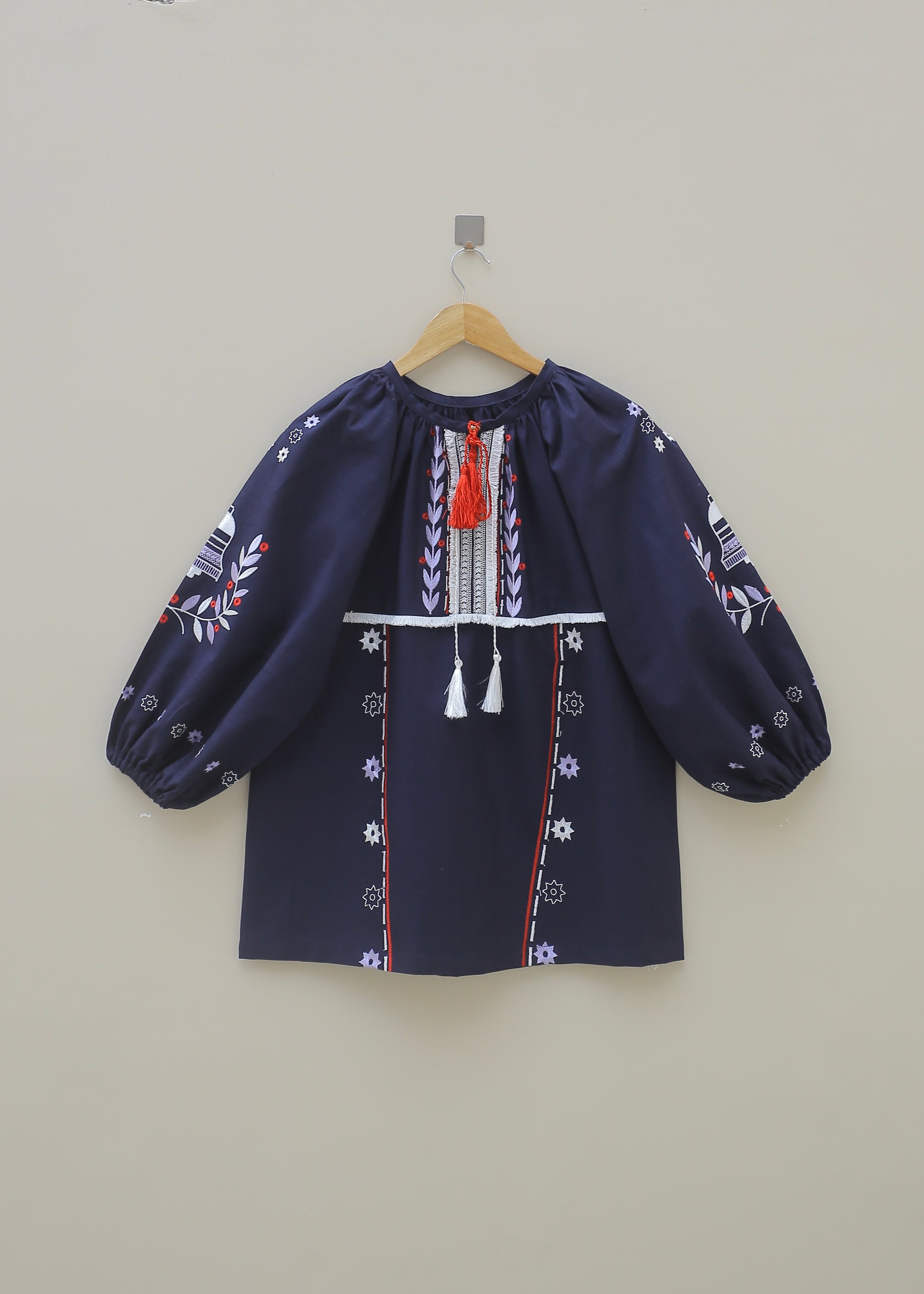 Introducing a chic women’s navy top featuring an embroidered neckline adorned with lace and playful tassels. This shirt has a ban collar that adds a stylish touch, complemented by voluminous embroidered sleeves gathered with elastic bands at the bottom for both style and comfort. Perfect for any occasion, this blouse is a versatile addition to your wardrobe!