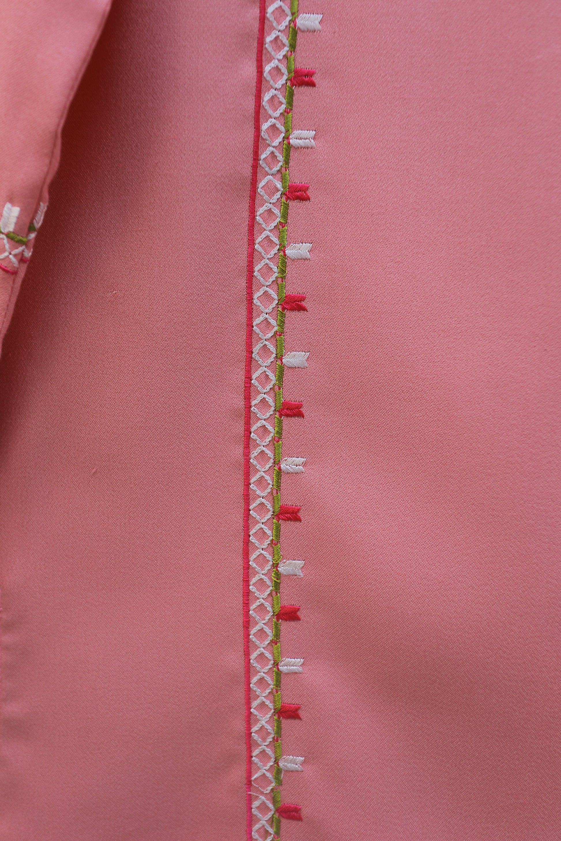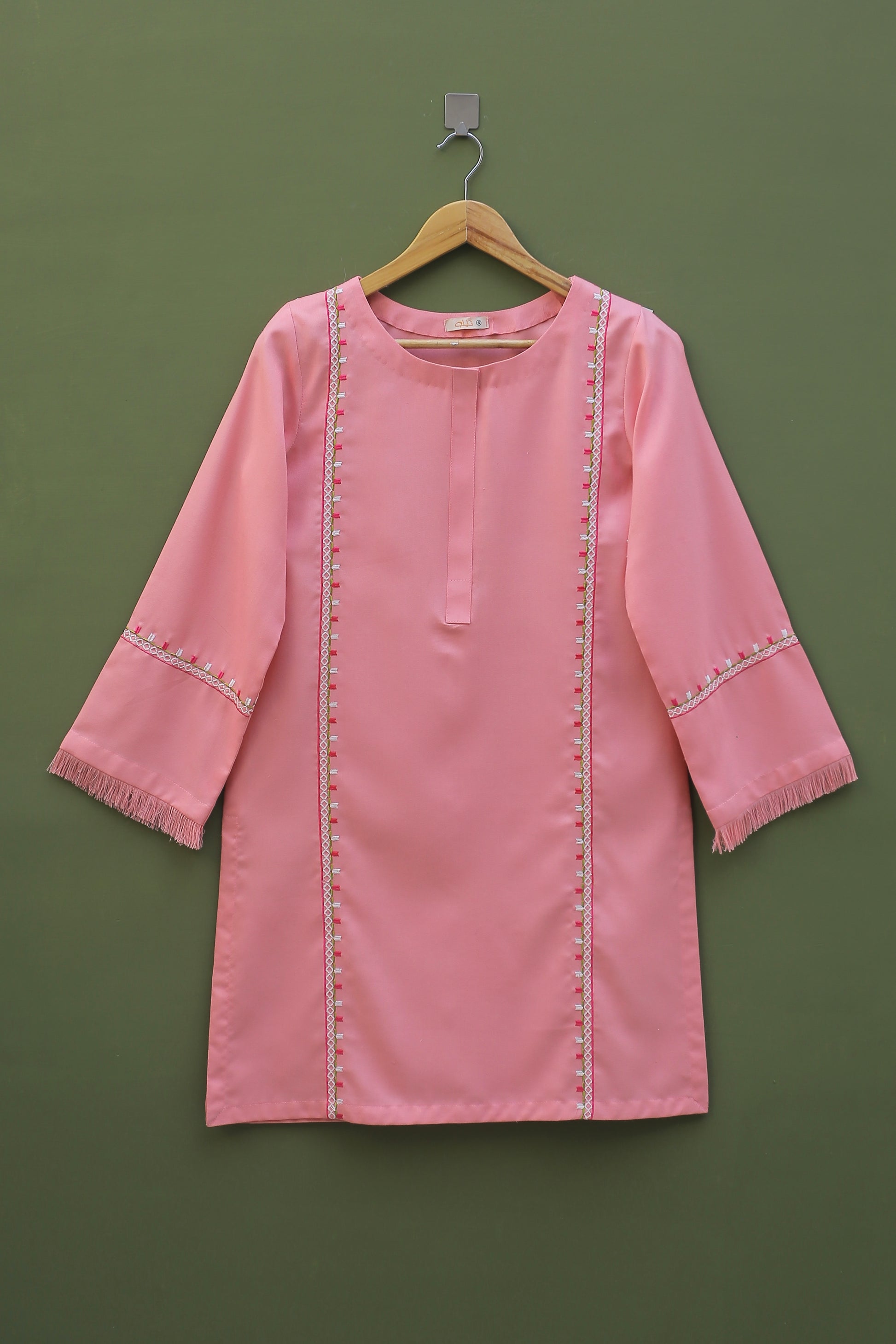 This beautiful blush pink kurta features an embroidered panel on the front and embroidered sleeves with trendy fray edges. Its stylish design makes it easy to pair with any of your favorite bottoms, perfect for adding a touch of elegance to your wardrobe.