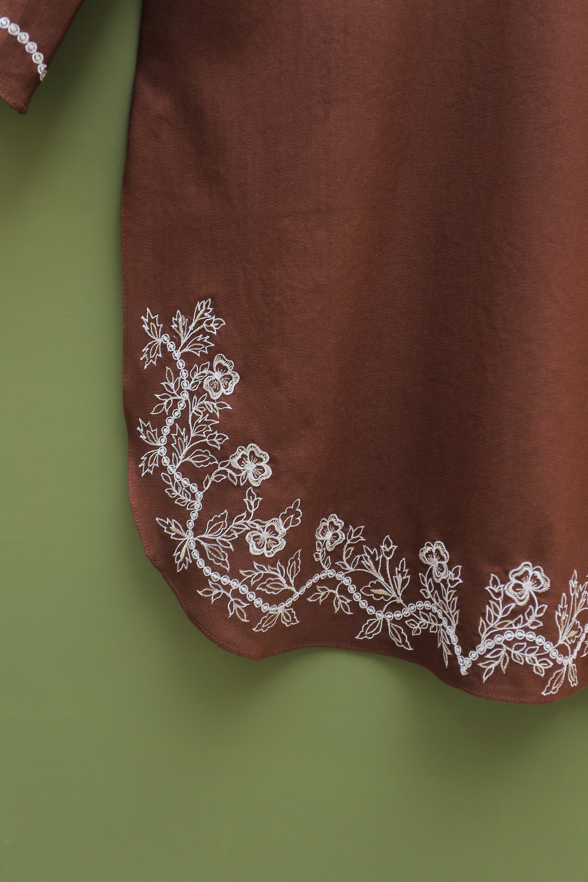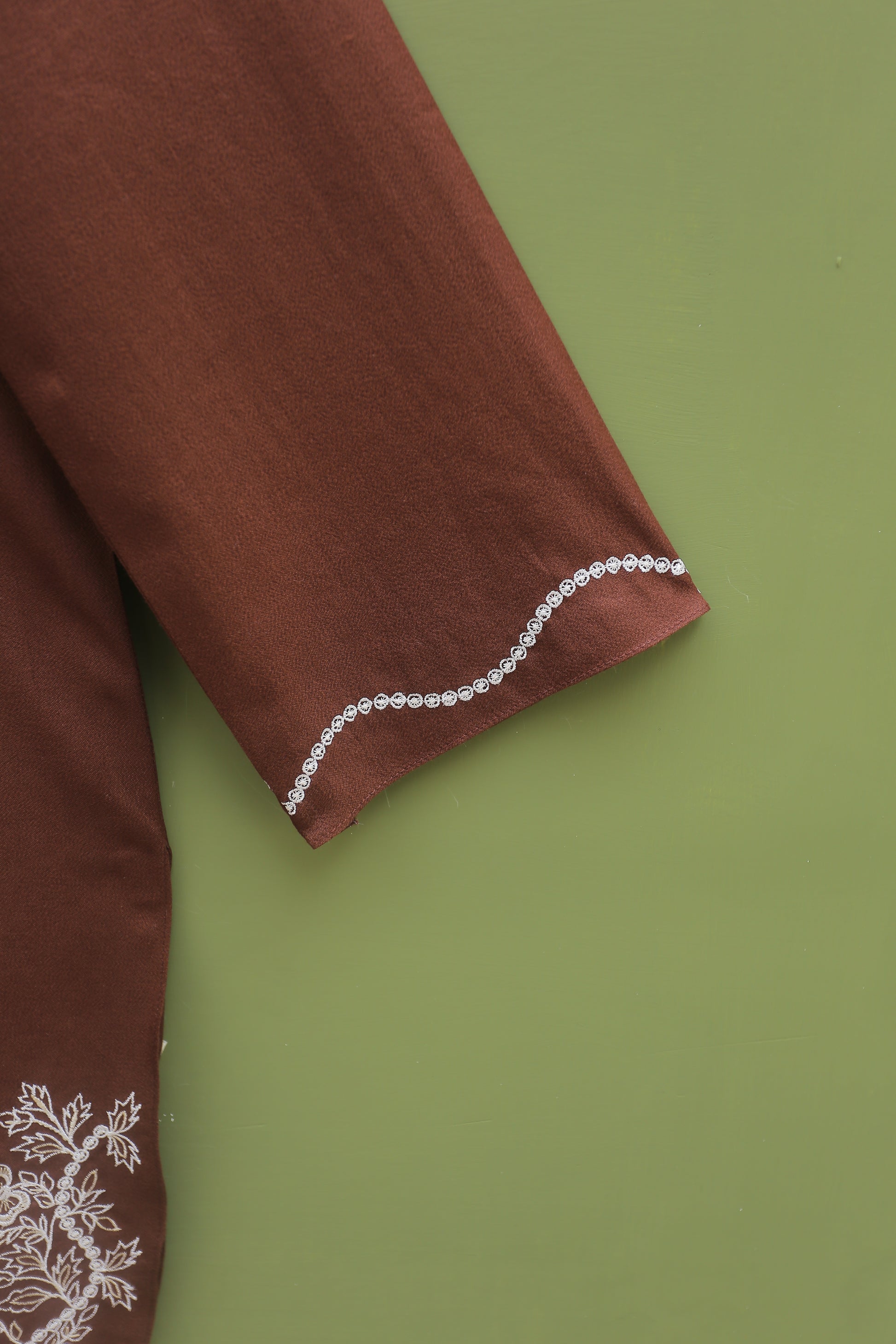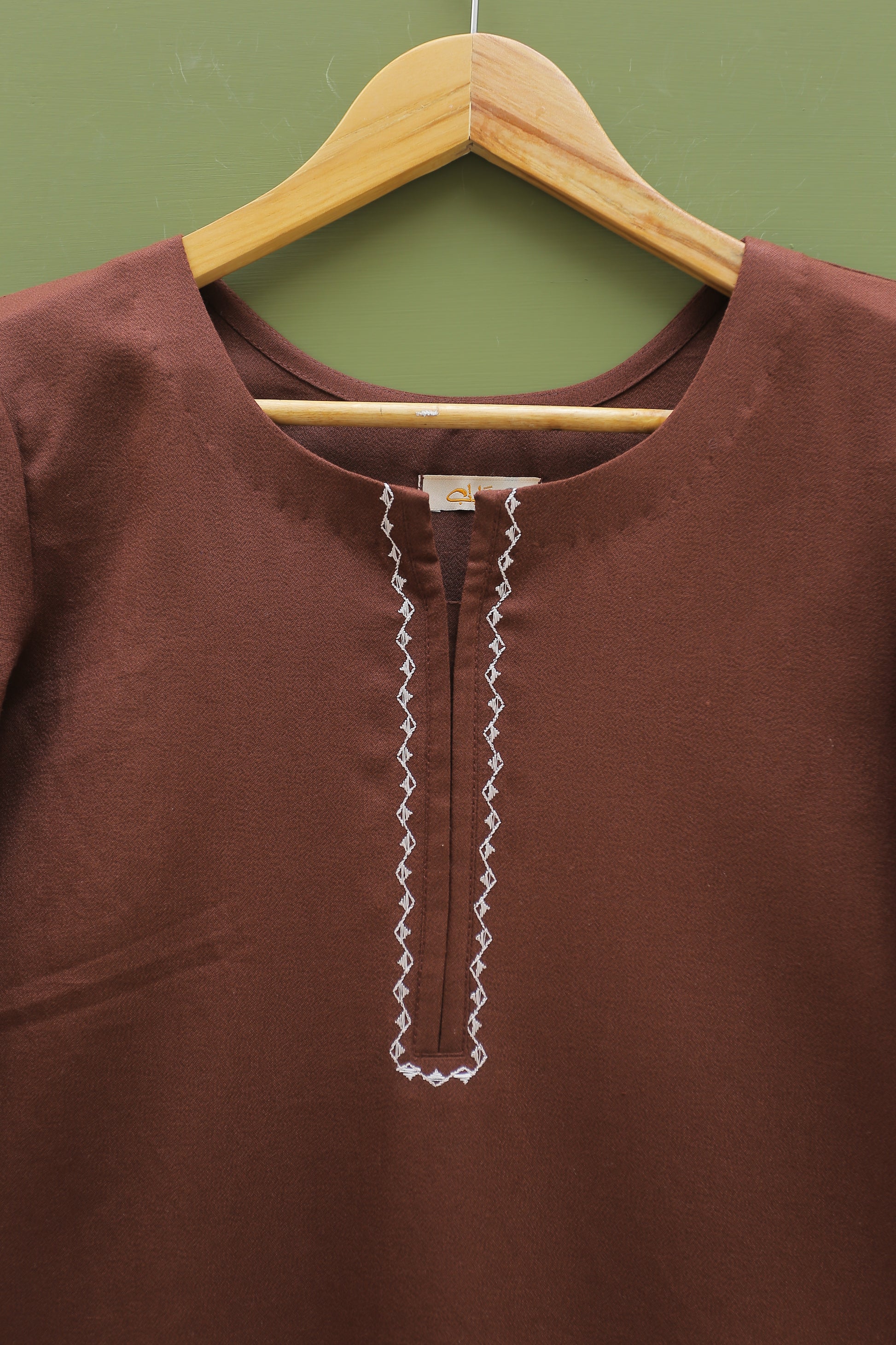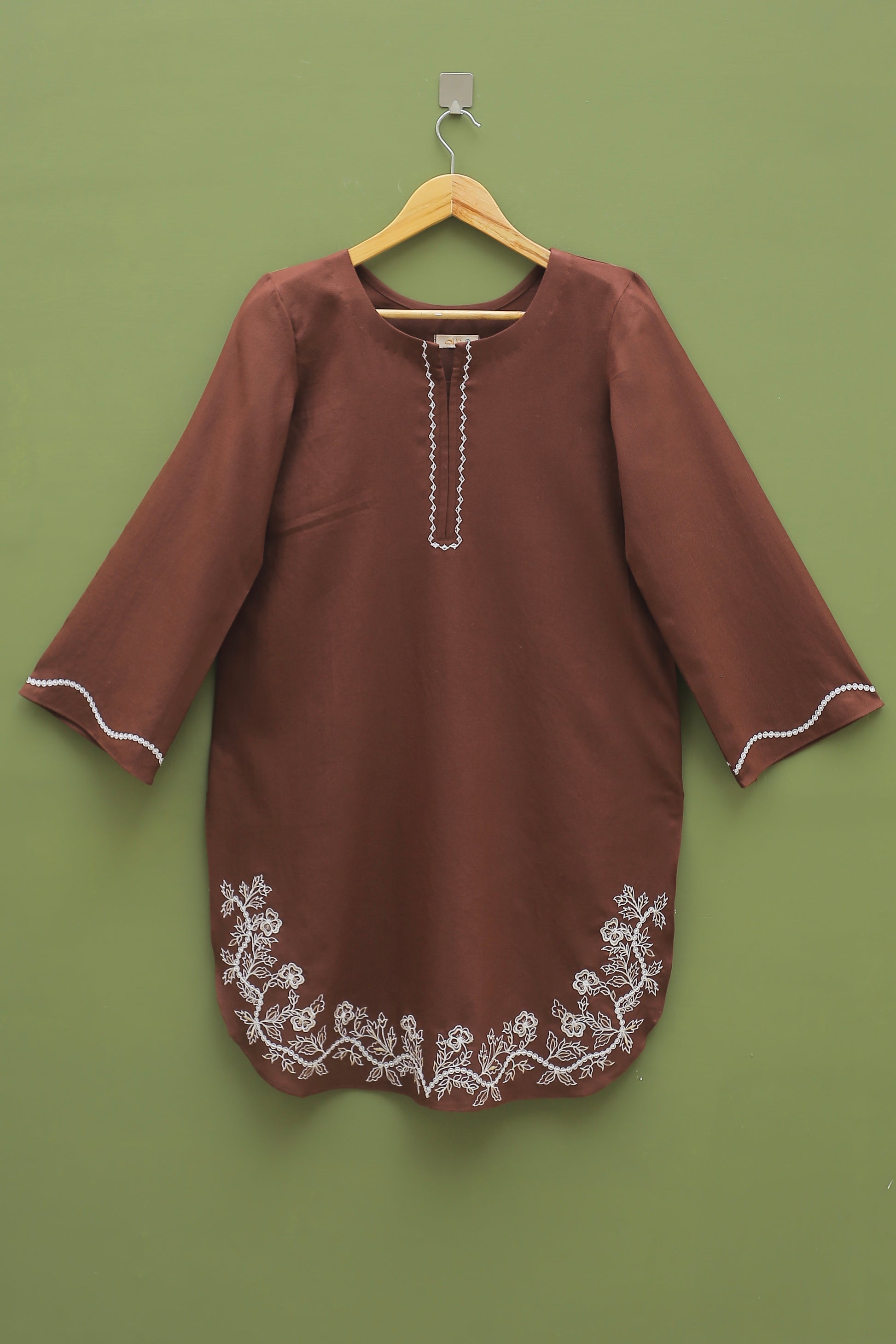 This exquisite chocolate-colored embroidered kurta features a beautifully detailed embroidered neckline and hem, along with elegantly embroidered sleeves. It is perfectly paired with a shalwar, creating a sophisticated and stylish ensemble for any occasion.
