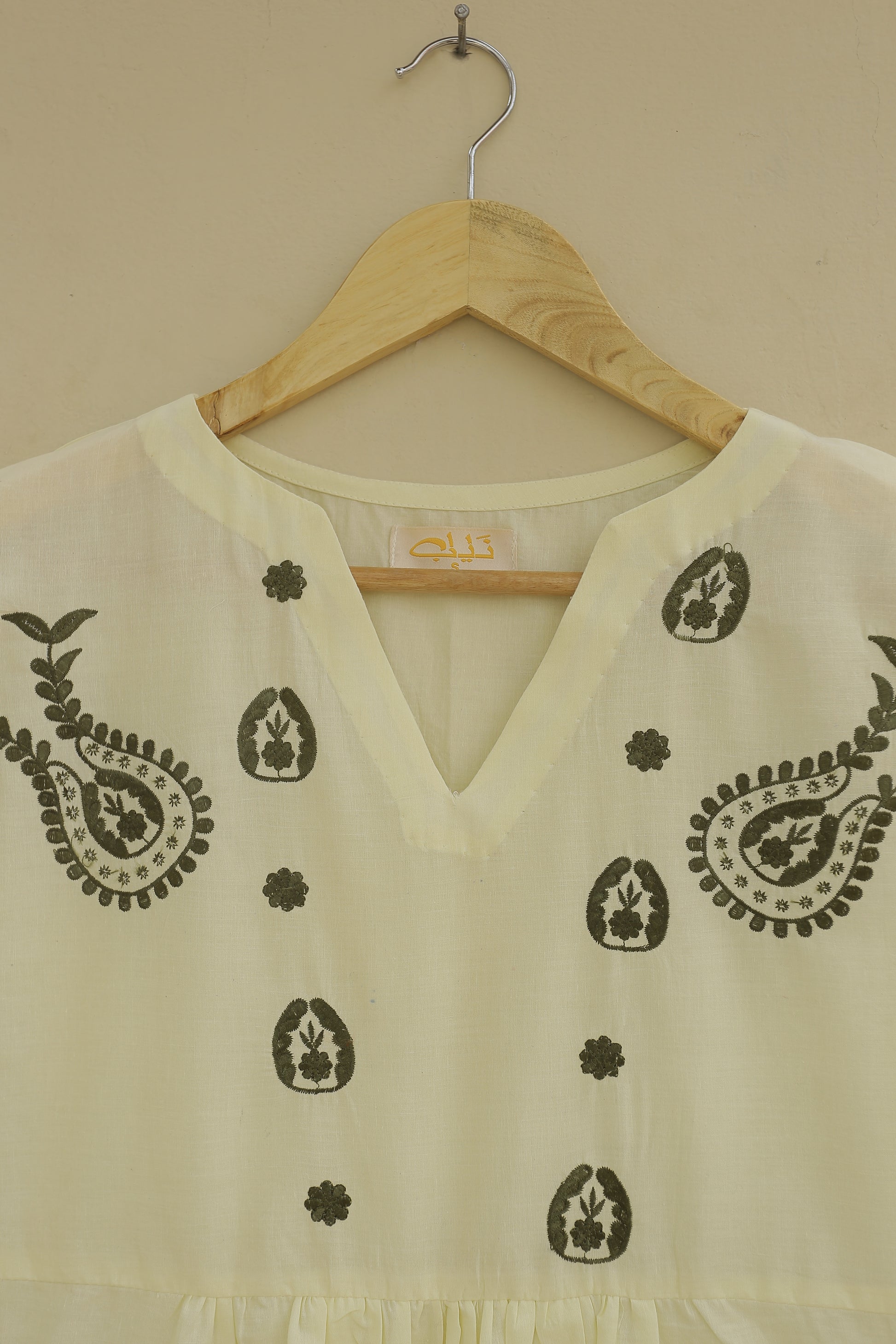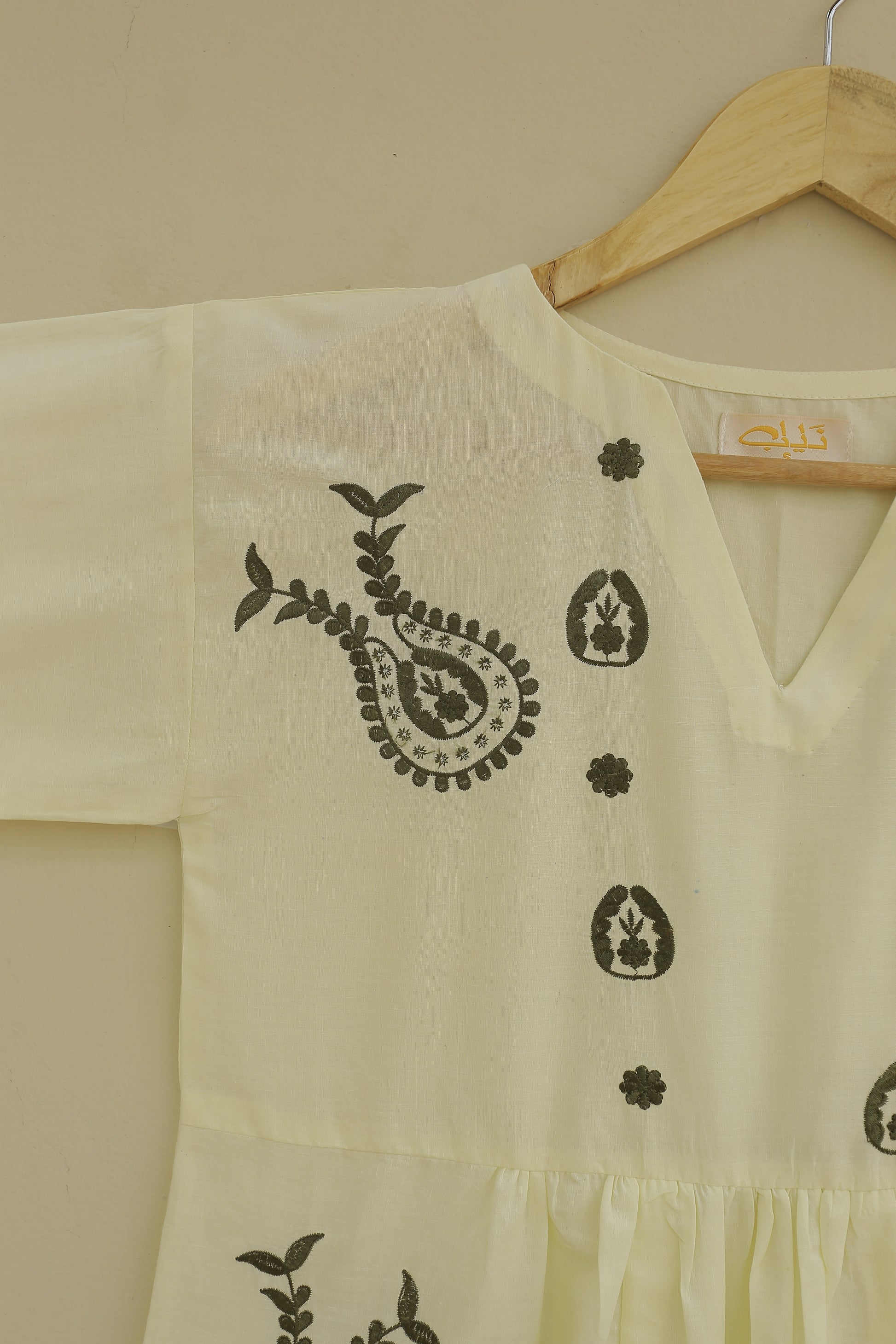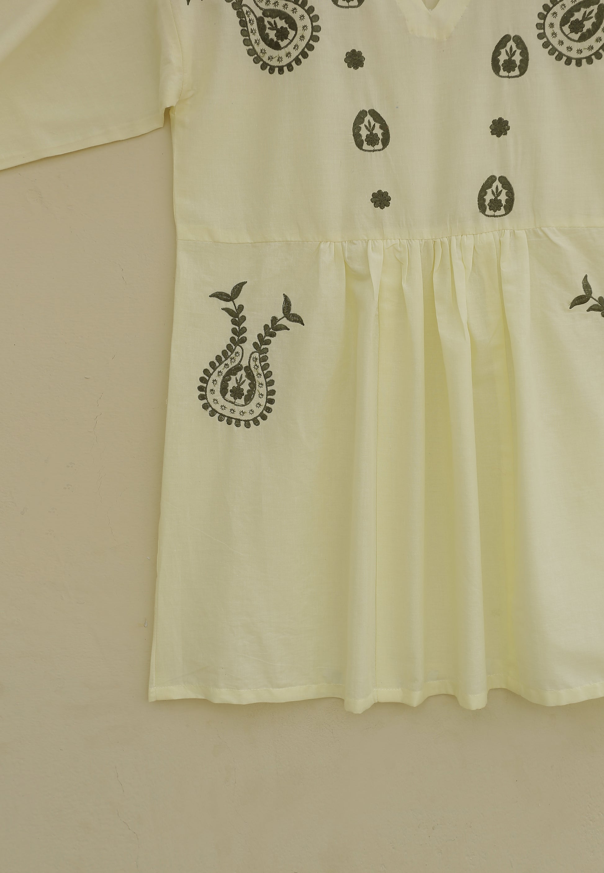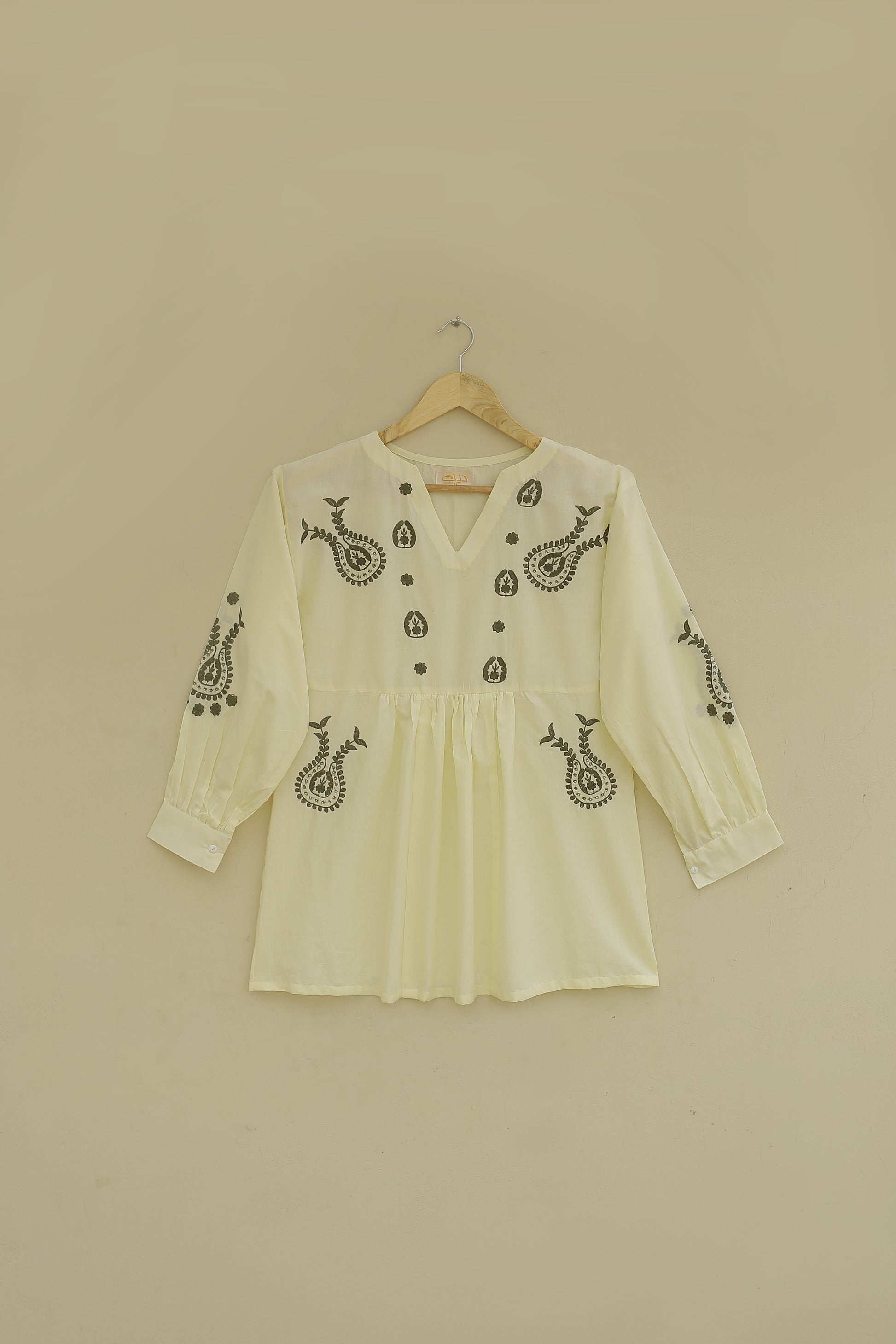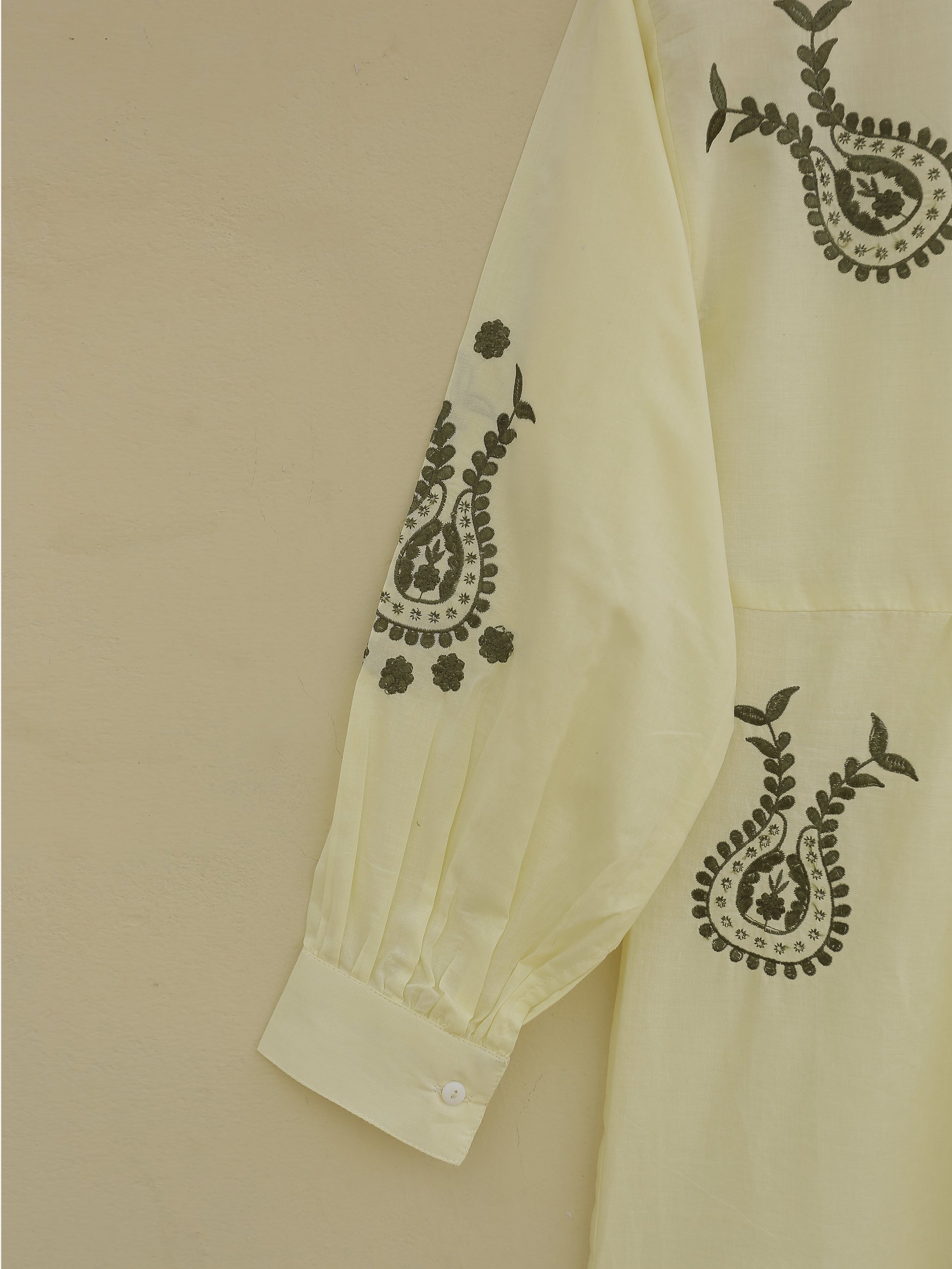 This shirt features intricate embroidered motifs on the front and sleeves, adding a touch of elegance and detail. The gathering details on the front create a flattering and feminine silhouette. The cuff sleeves complete the look with a classic and polished touch.