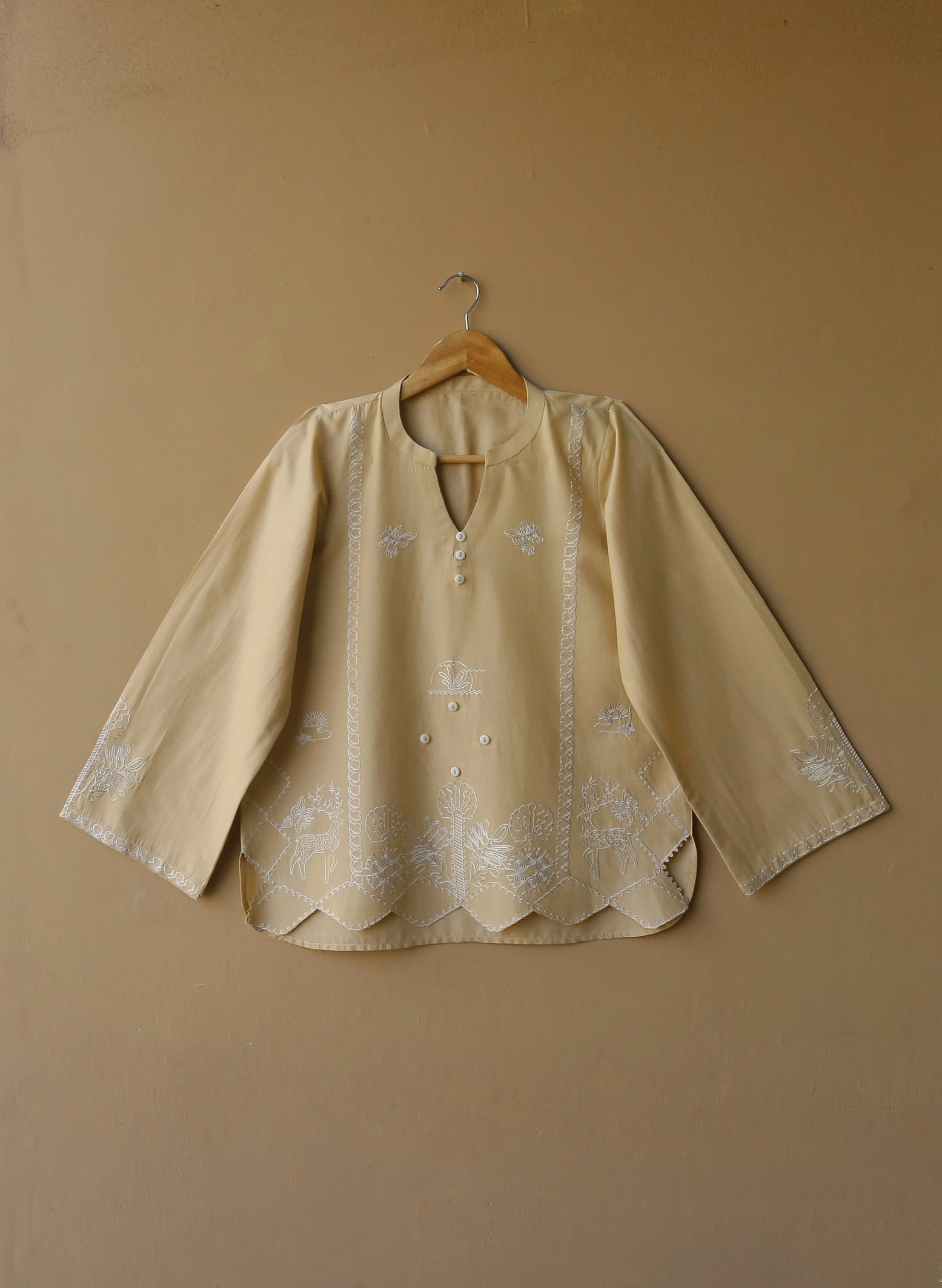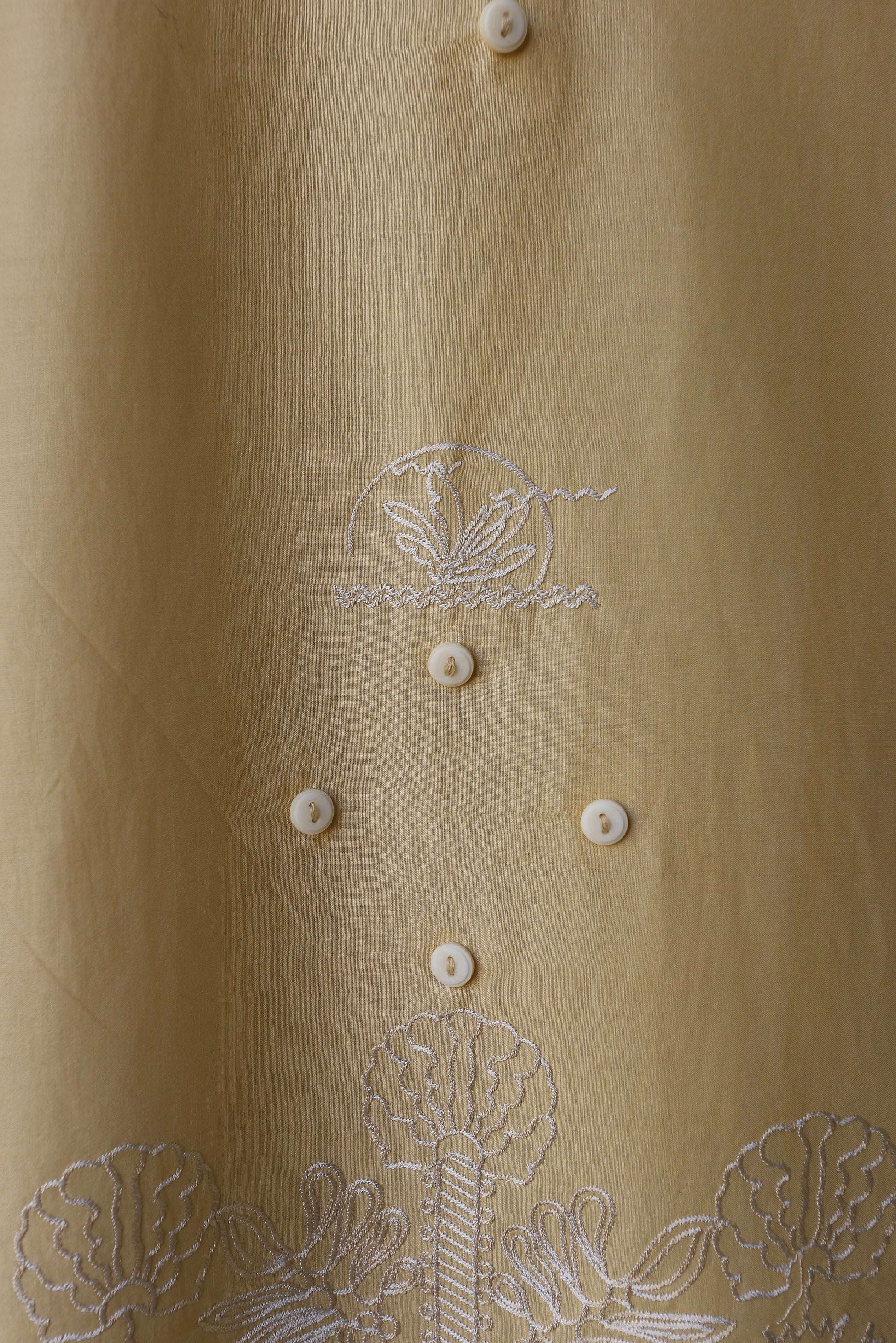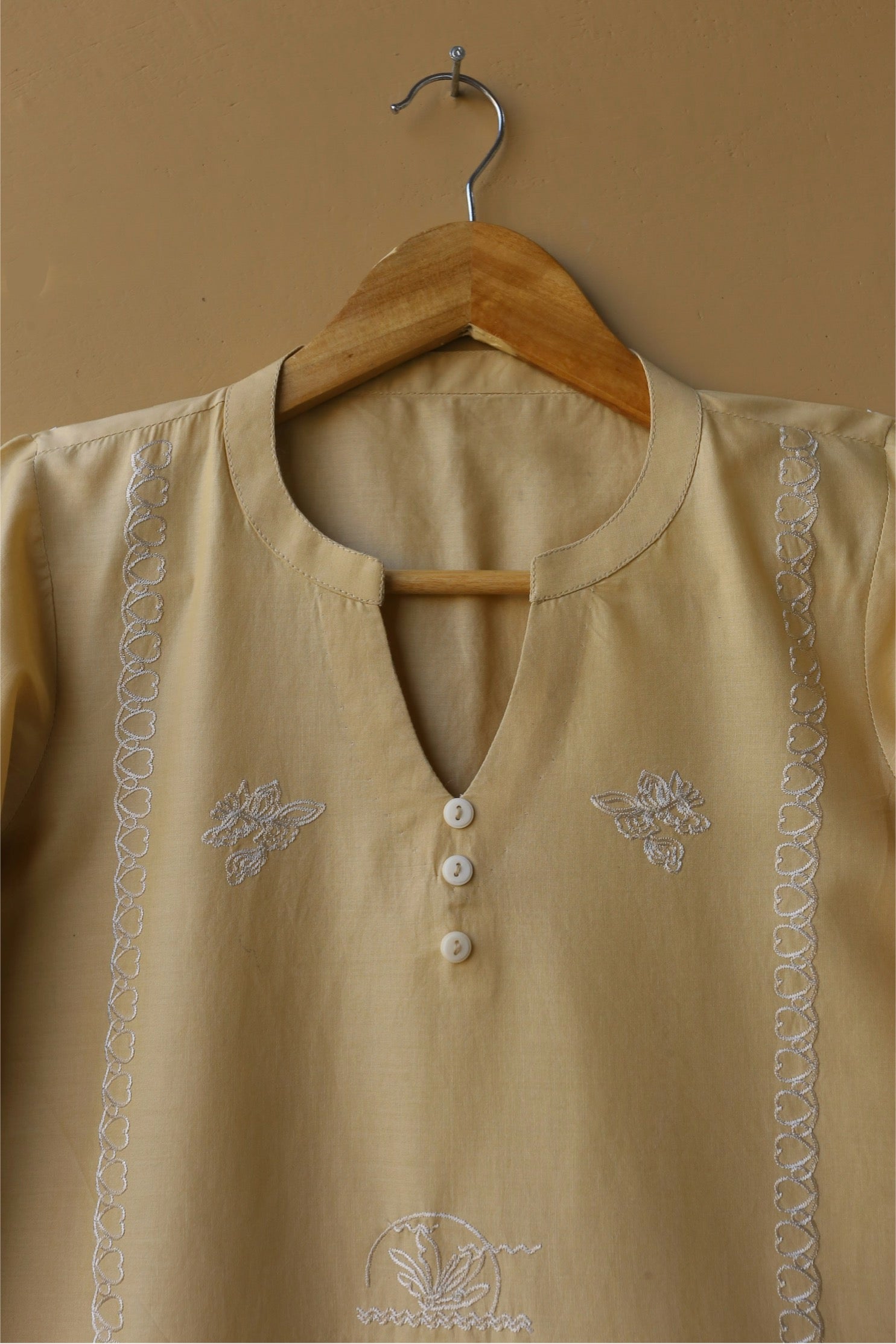 - Intricate white embroidery beautifully spread across the front and sleeves