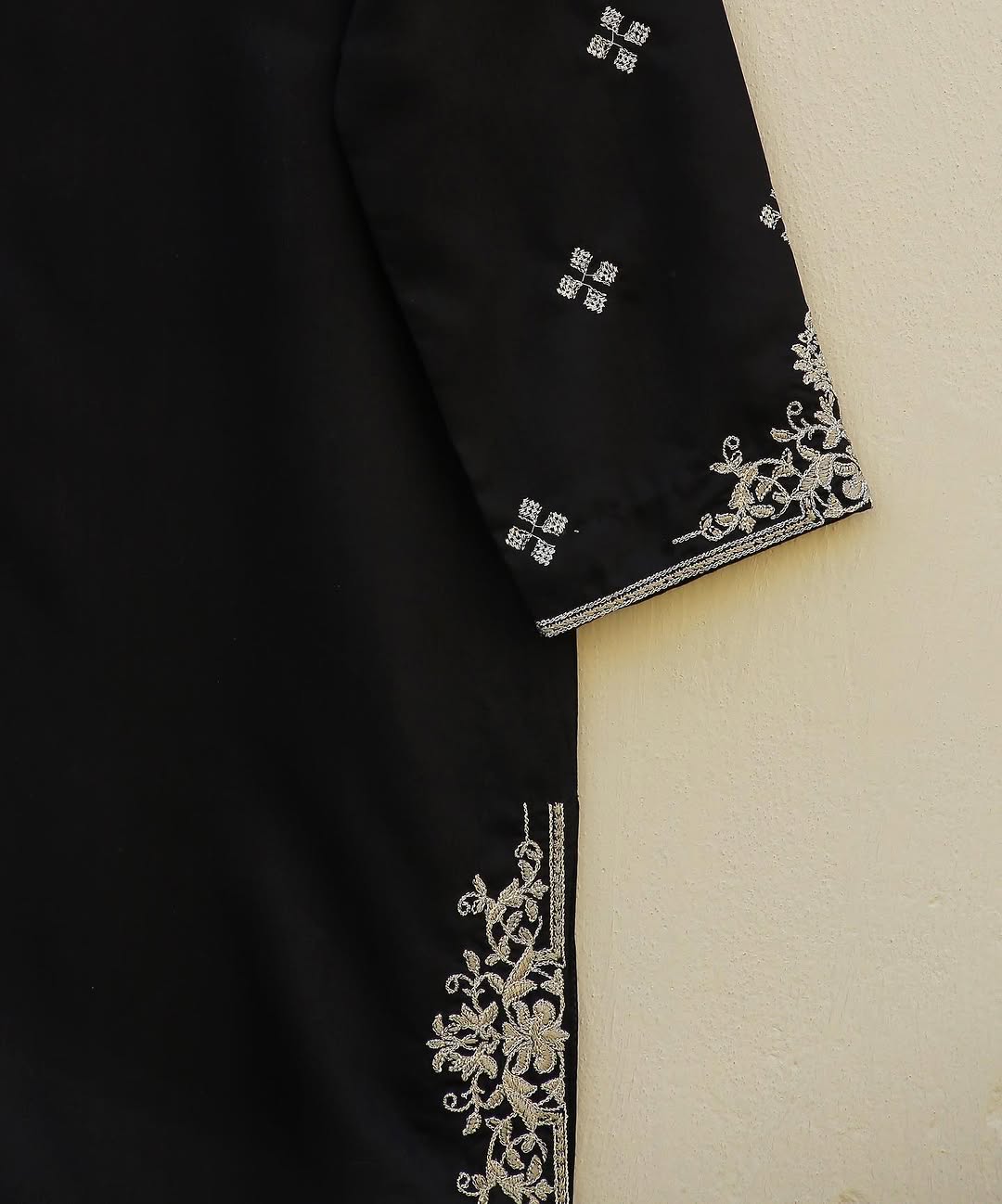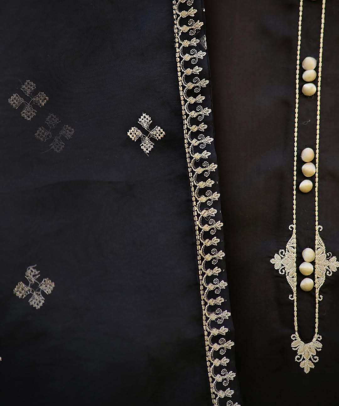 This fascinating outfit is perfect for formal or semi-formal occasions. Crafted in black, this chic 3-piece suit features a contemporary A-line shirt comes with an appealing tilla embroidery on it’s neckline, hem and sleeves. Paired with a matching cigarette pants and an organza embroidered dupatta with captivating embroidered borders. It’s the perfect blend of classy and chic for a stylish statement look.