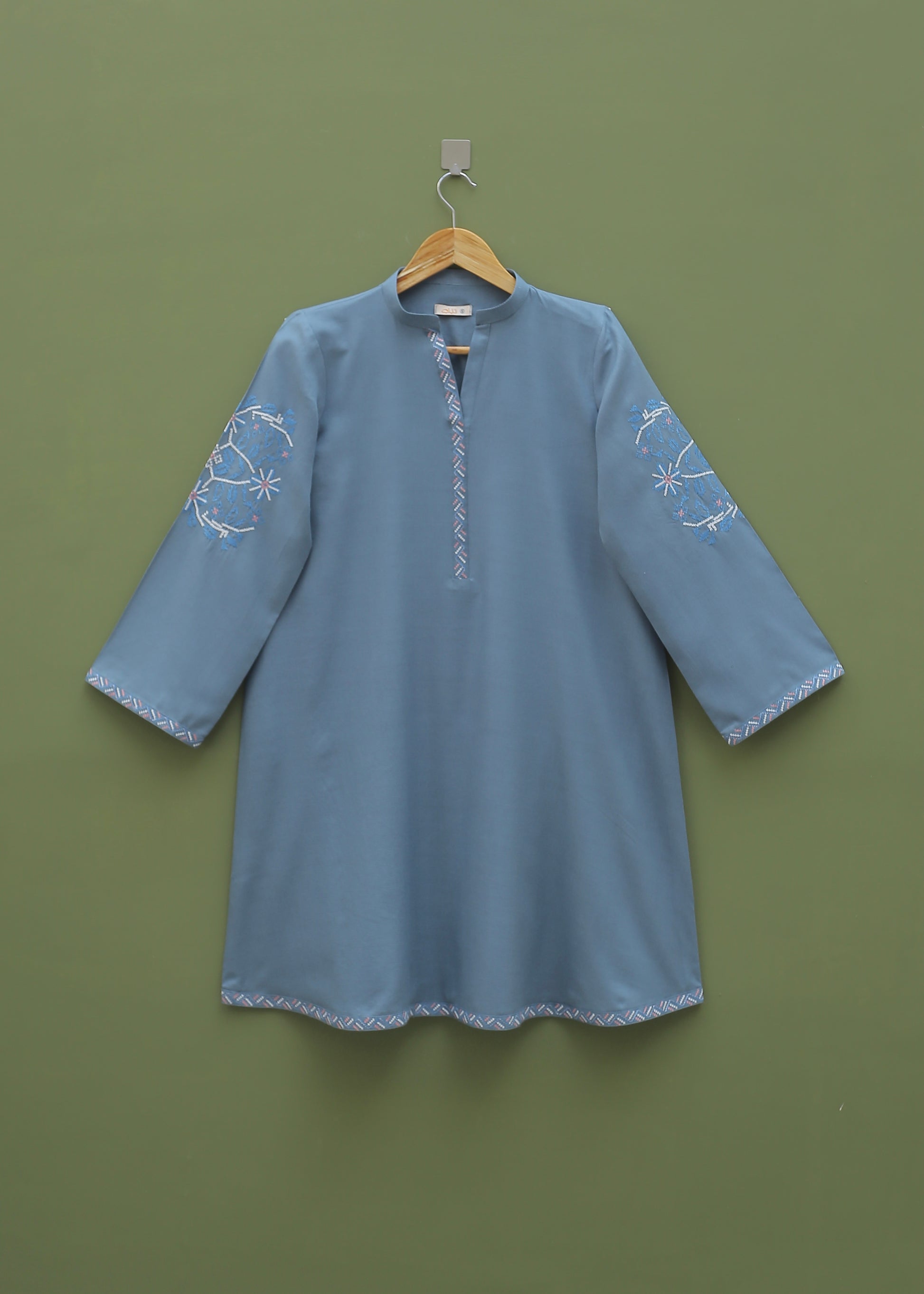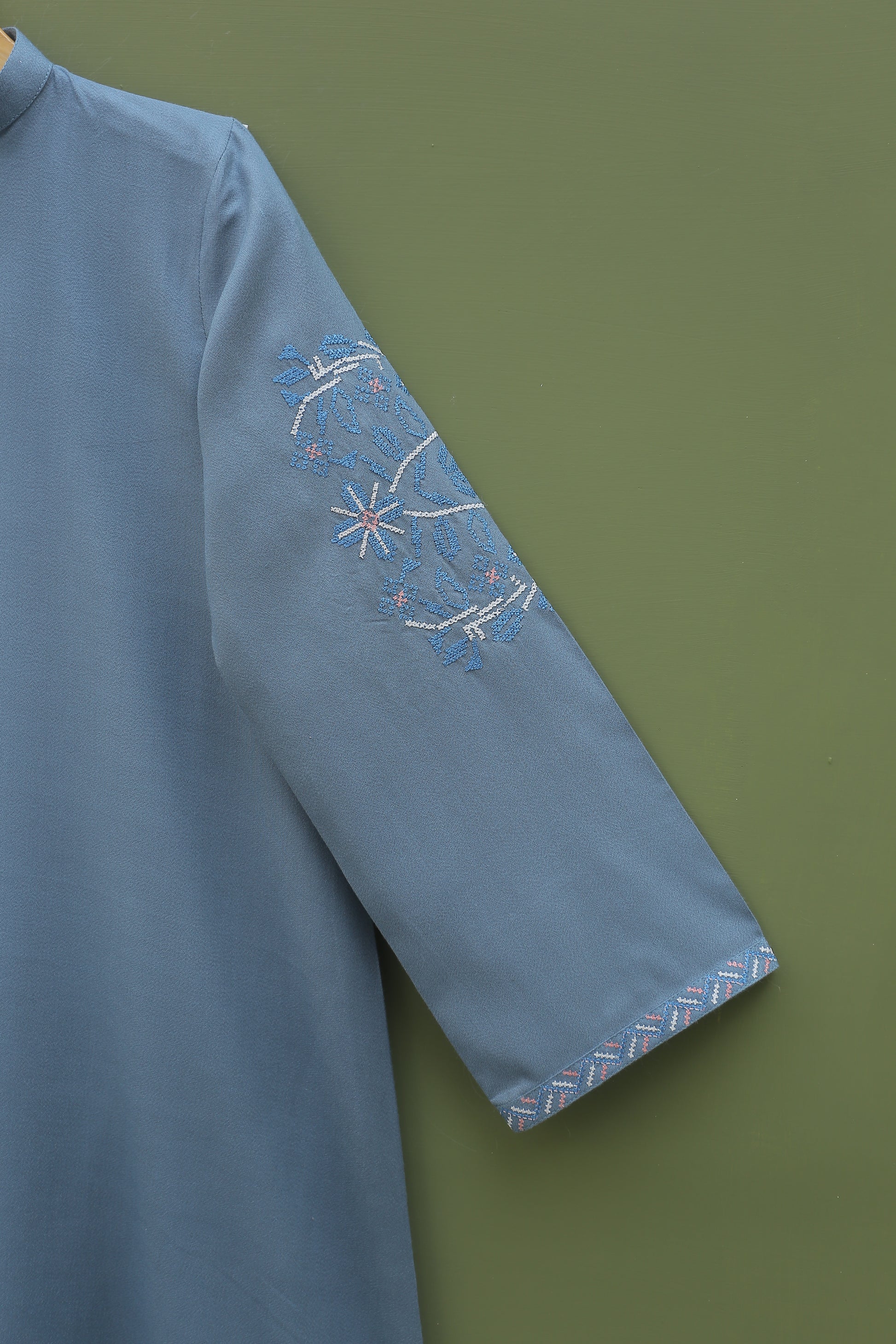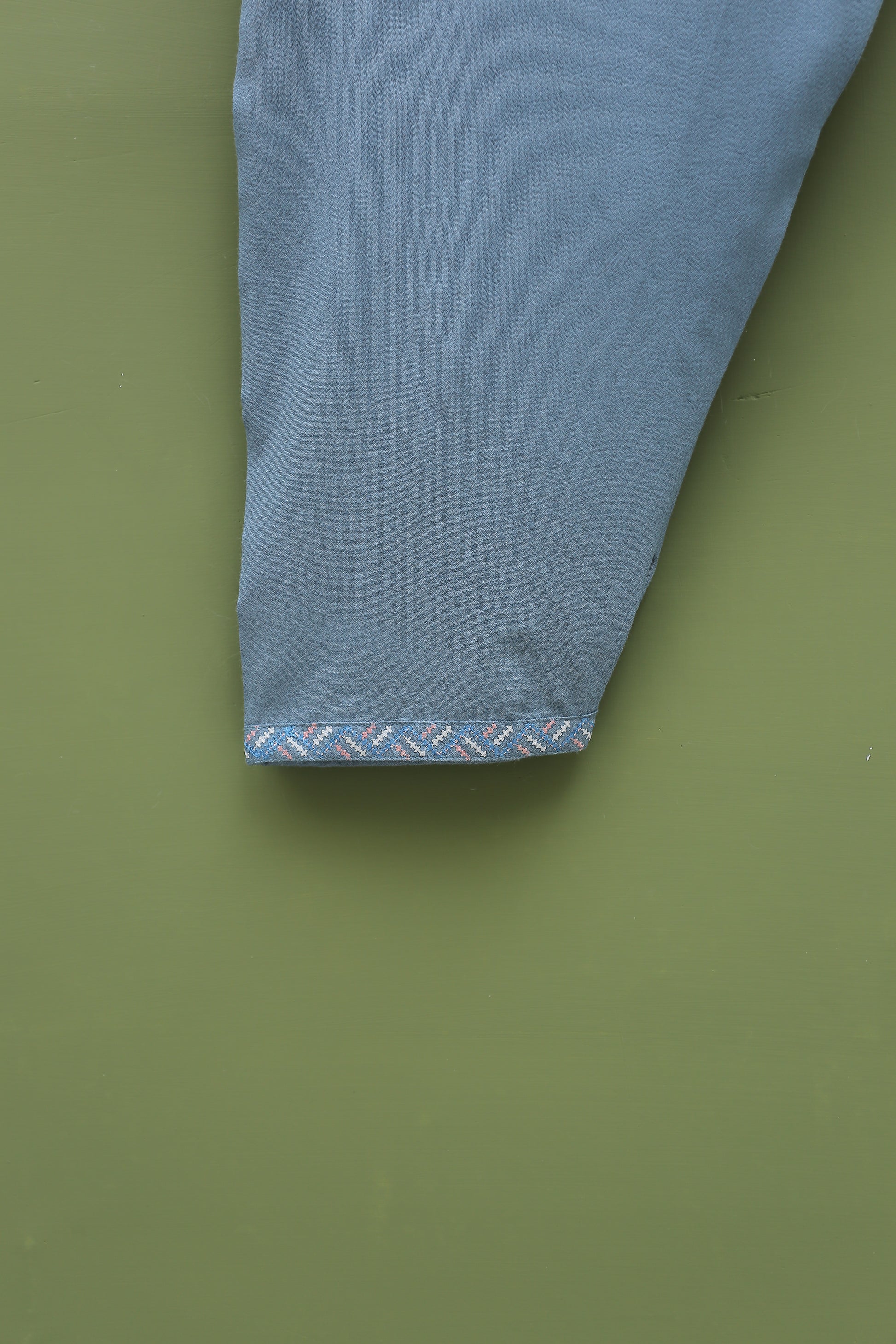 This stylish grey embroidered shirt features a minimal embroidered neckline and a chic border on its hem. The embroidered sleeves add a refined touch, and it pairs beautifully with a shalwar that also has an embroidered border, making it a perfect choice for any elegant occasion.