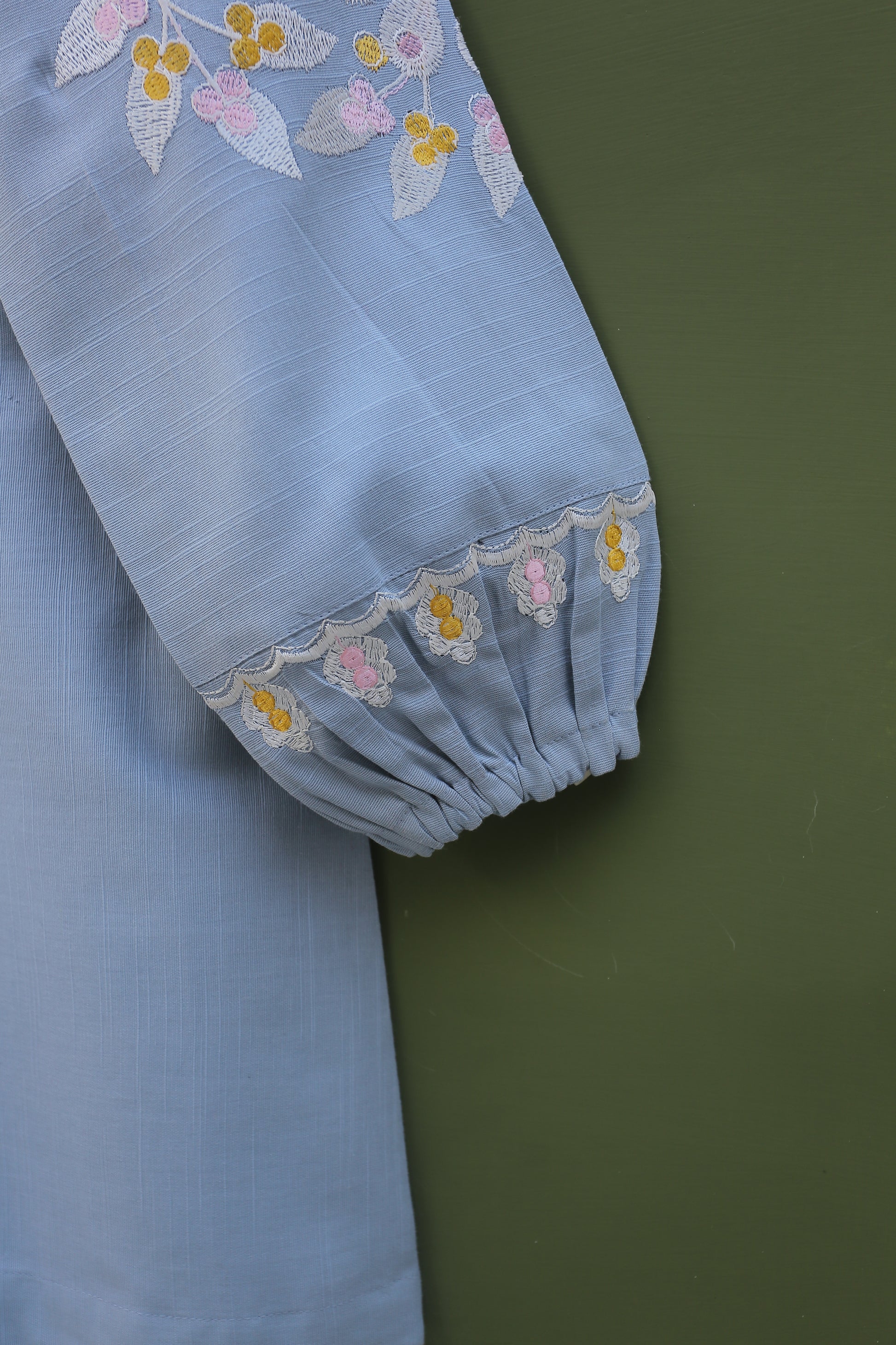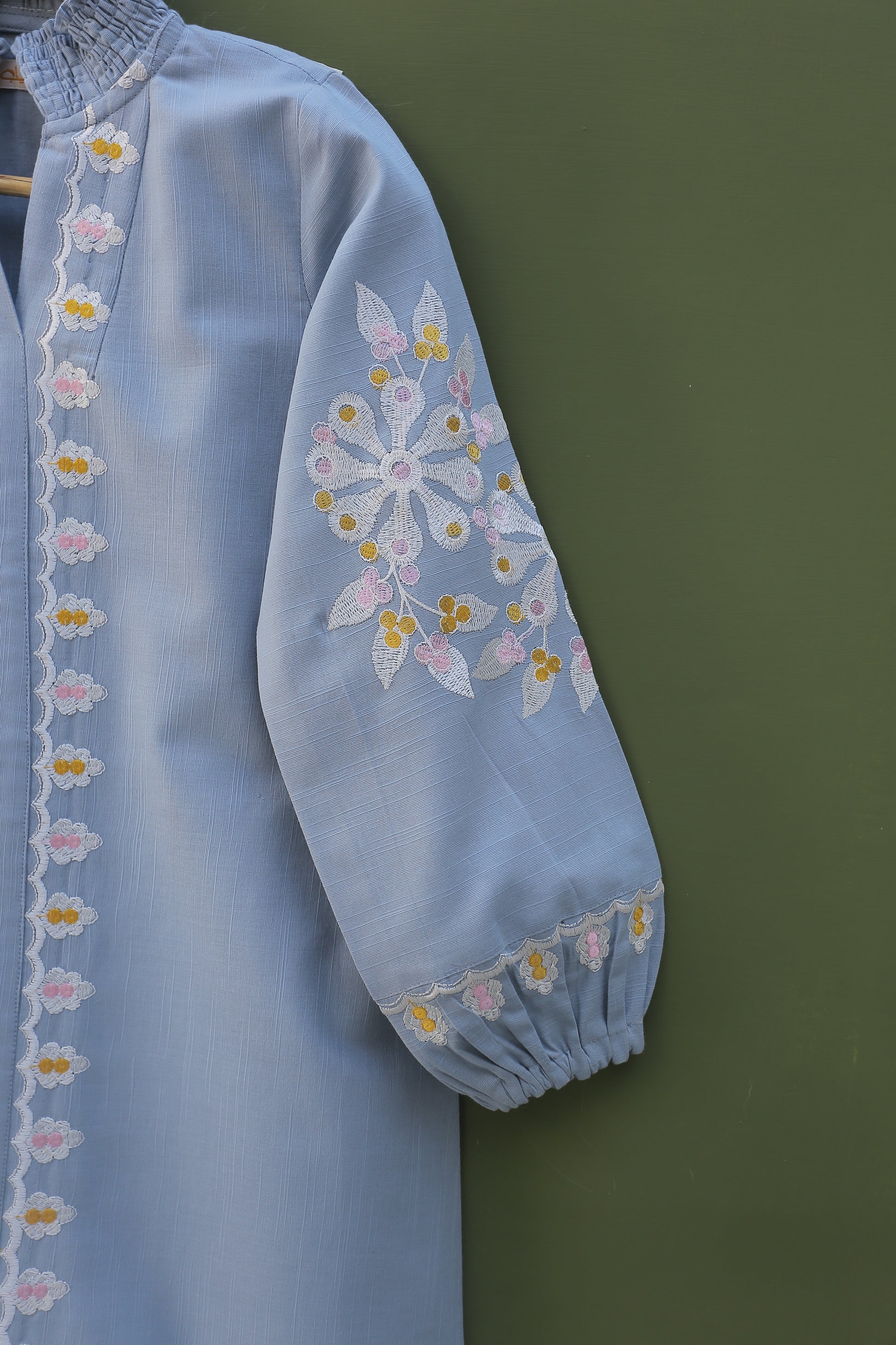 This stylish grey embroidered top features intricate embroidery on the front and a high neck elastic collar for a comfortable fit. The sleeves are adorned with beautiful embroidery motifs and have an embroidered border with elastic openings, adding a chic touch to the design. This top is a perfect choice for any occasion.