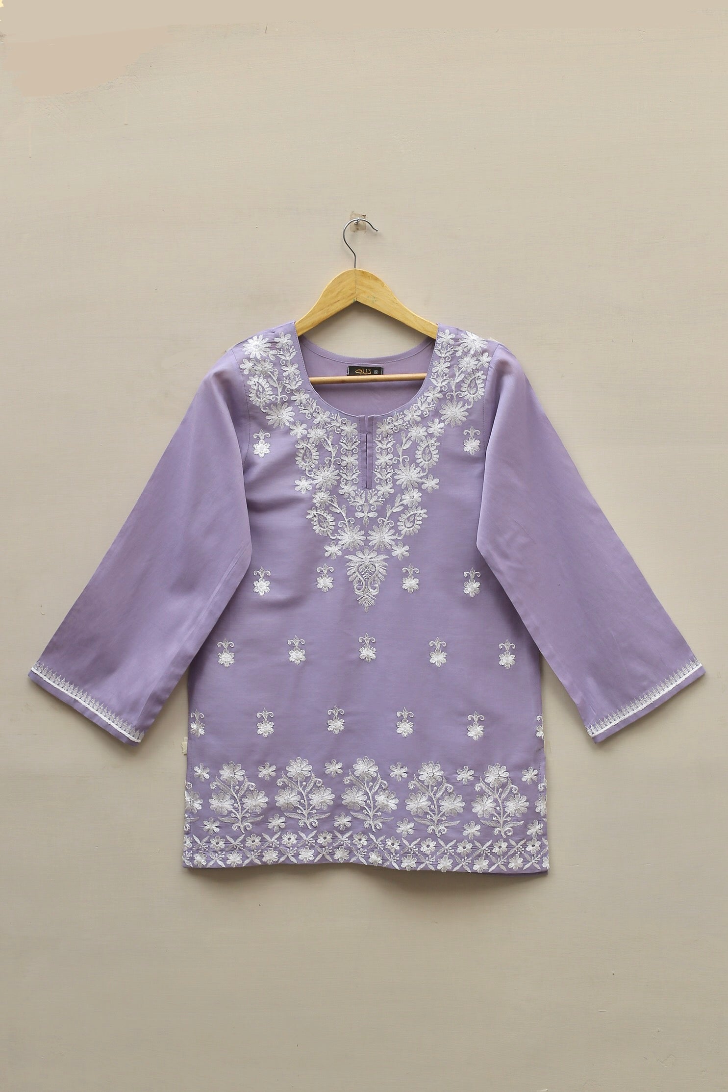 Elevate your summer wardrobe with this elegant lavender Chickenkari top, crafted from breathable and lightweight lawn fabric — perfect for warm-weather wear. The design features a delicately embroidered neckline that adds a touch of refinement, while subtle motif spray embroidery is scattered across the front, lending it a timeless, graceful charm. Whether styled casually or dressed up with accessories, this versatile top is a chic staple for effortless summer elegance.