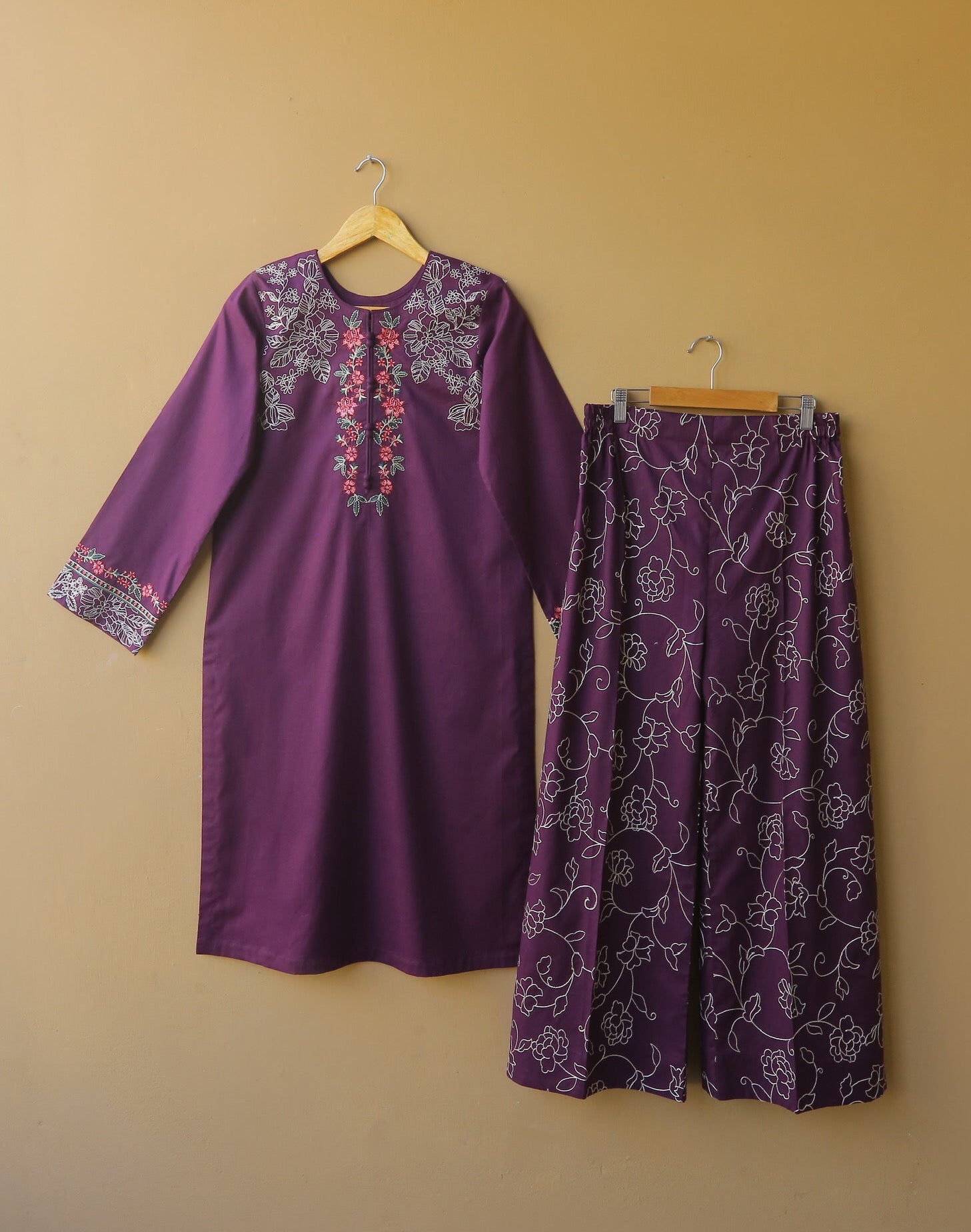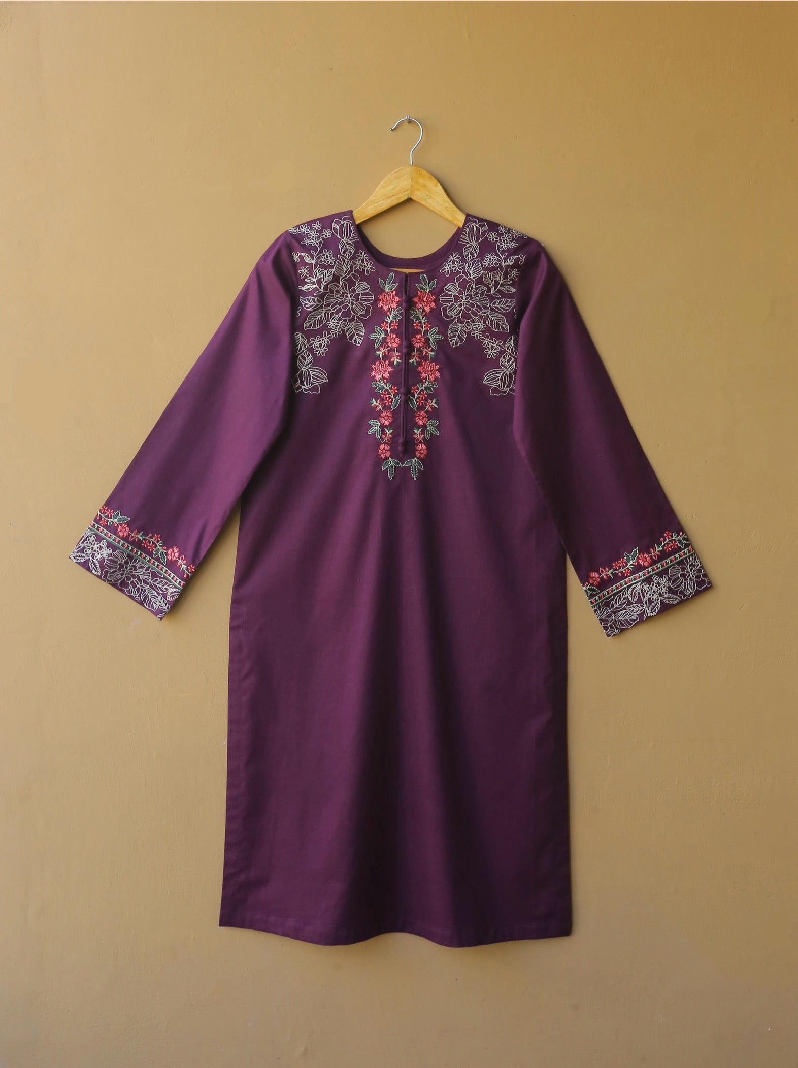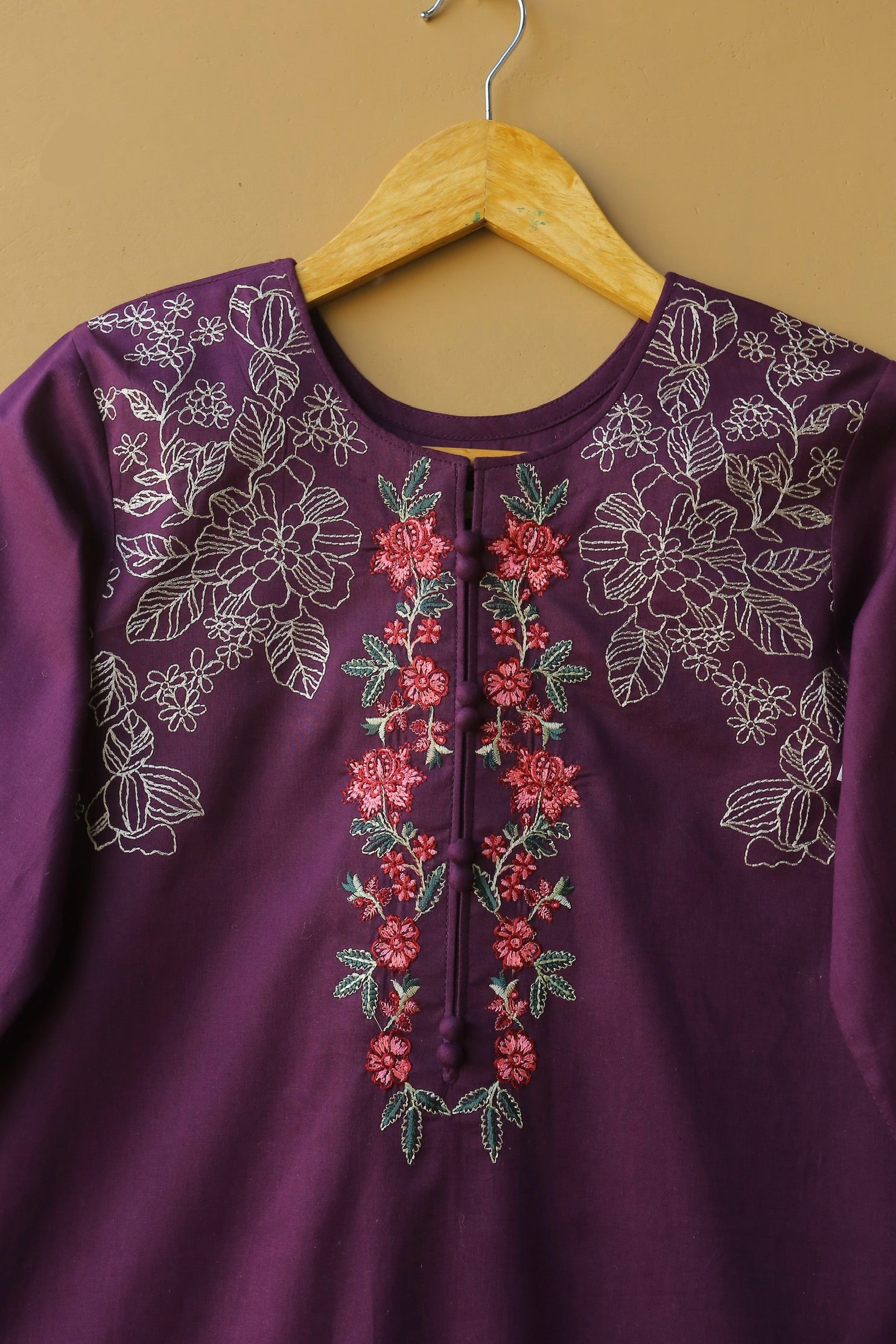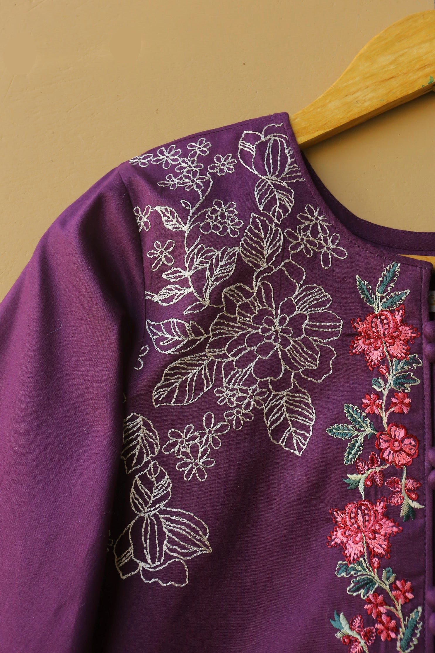 - Rich purple cotton kurta featuring intricate floral embroidery on the neckline and front