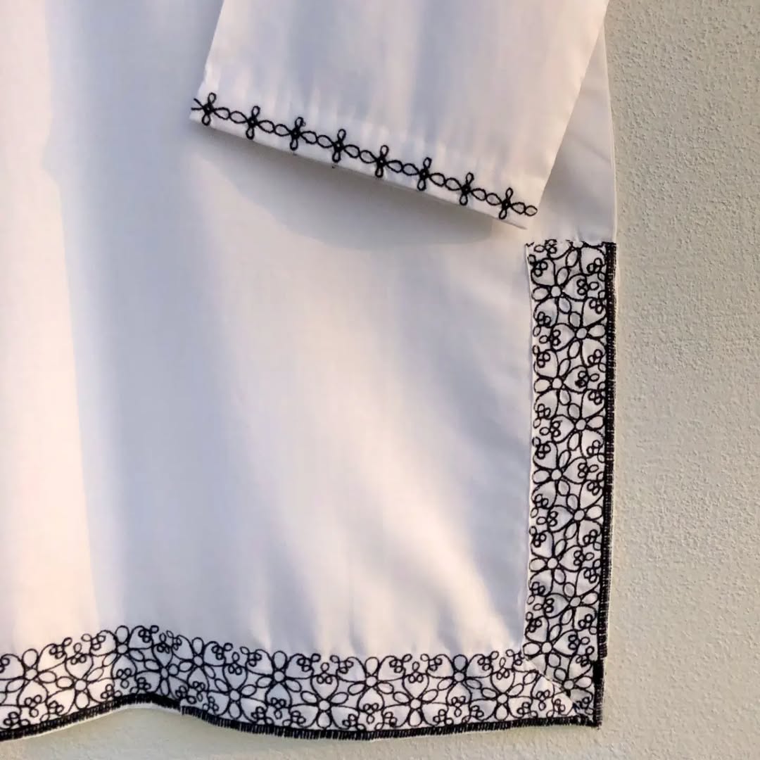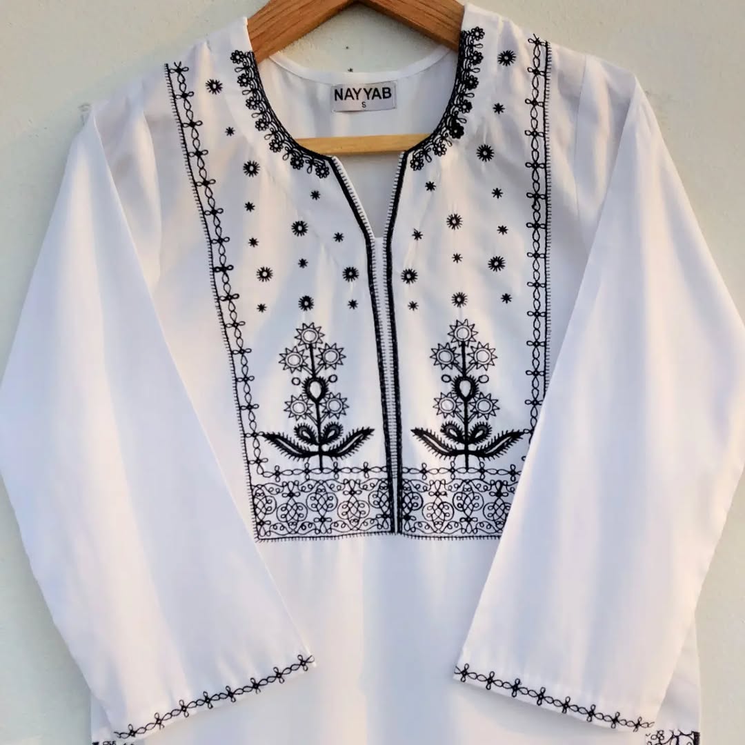 A graceful white kurti serves as a canvas for a fascinating white composition. Featuring a mesmerizing embroidery on the neckline and sleeves, this straight kurti will definitely add a bit of sophistication to this look. Kurti is paired with black cotton pants.