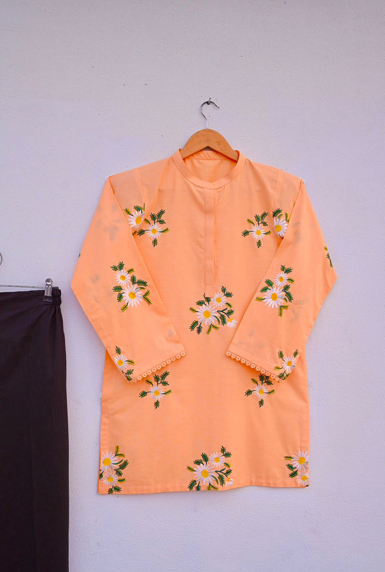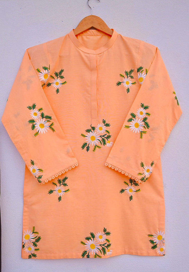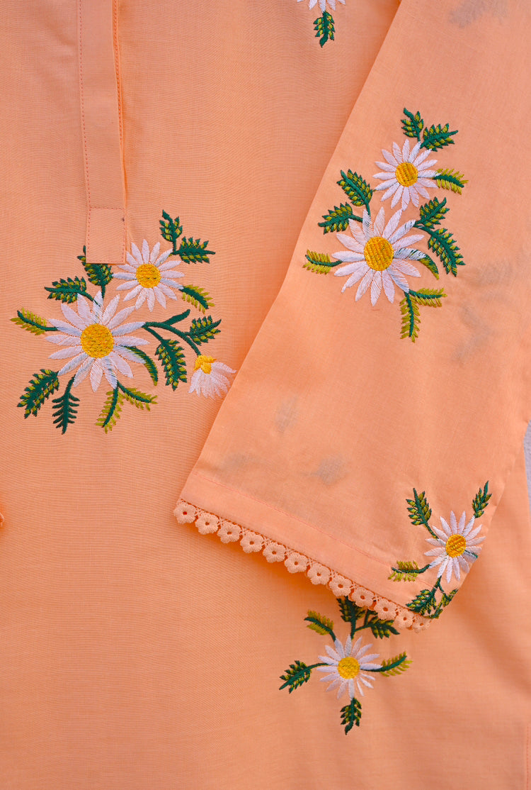 A cool and breezy design is layered over this soothing peach-hued cambric top. Featuring a double placket, this fully embroidered top entails whimsical daisies composition in abstract patterns. This top will be your go-to top throughout the season.