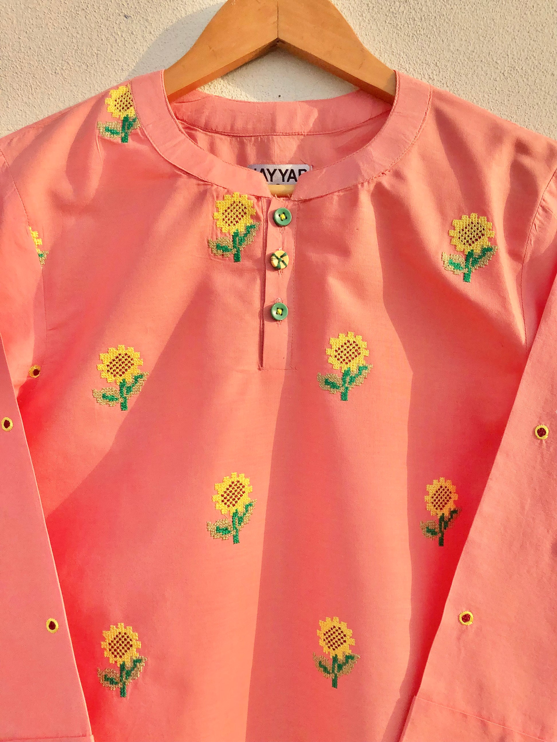 Expertly crafted from soft and breathable cotton, our Peach Top is a must-have for any fashion-forward individual. With a boat neckline and elegant embroidered details, this crop top exudes a sense of sophistication and style. Plus, the front buttons add a touch of charm to elevate your look.