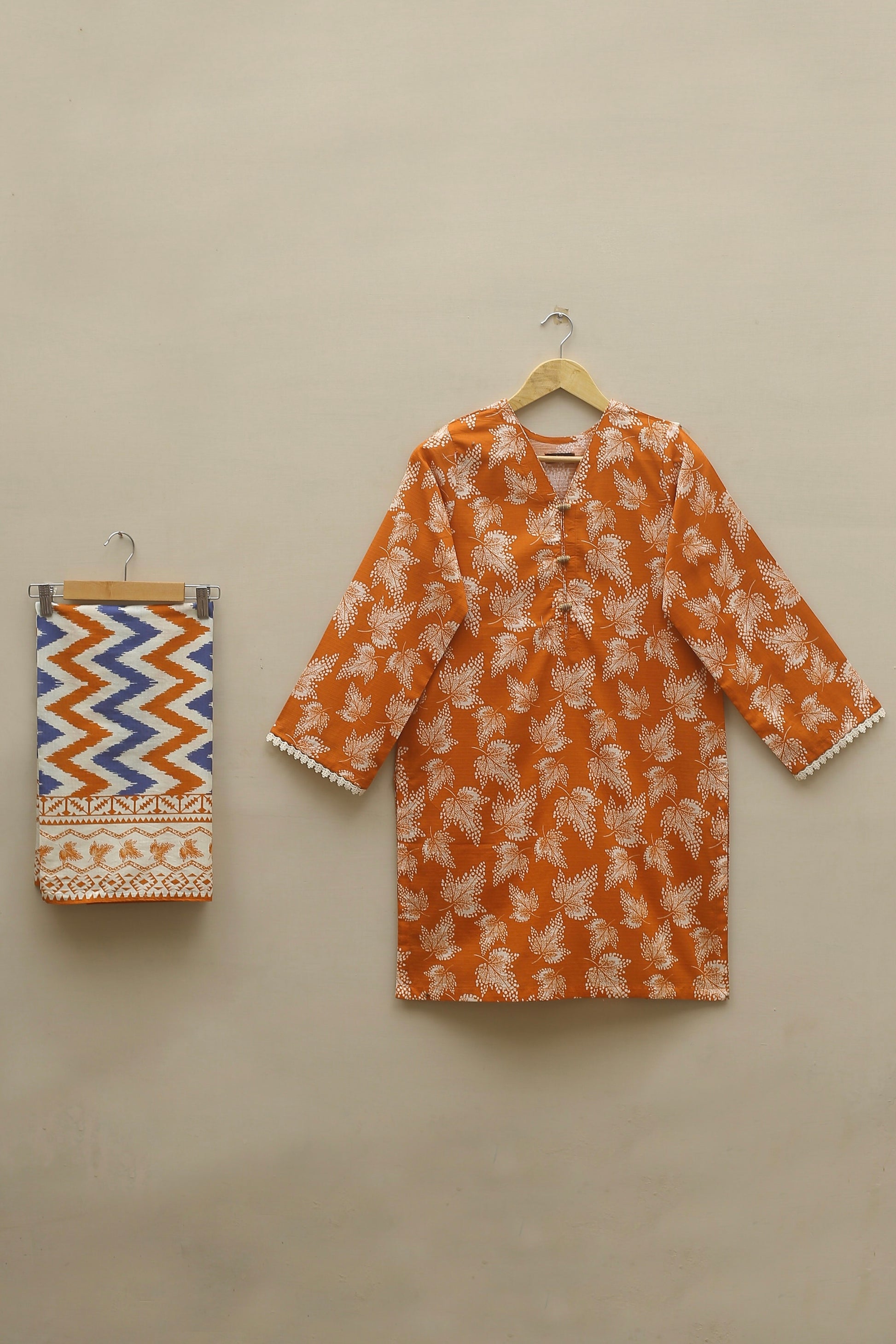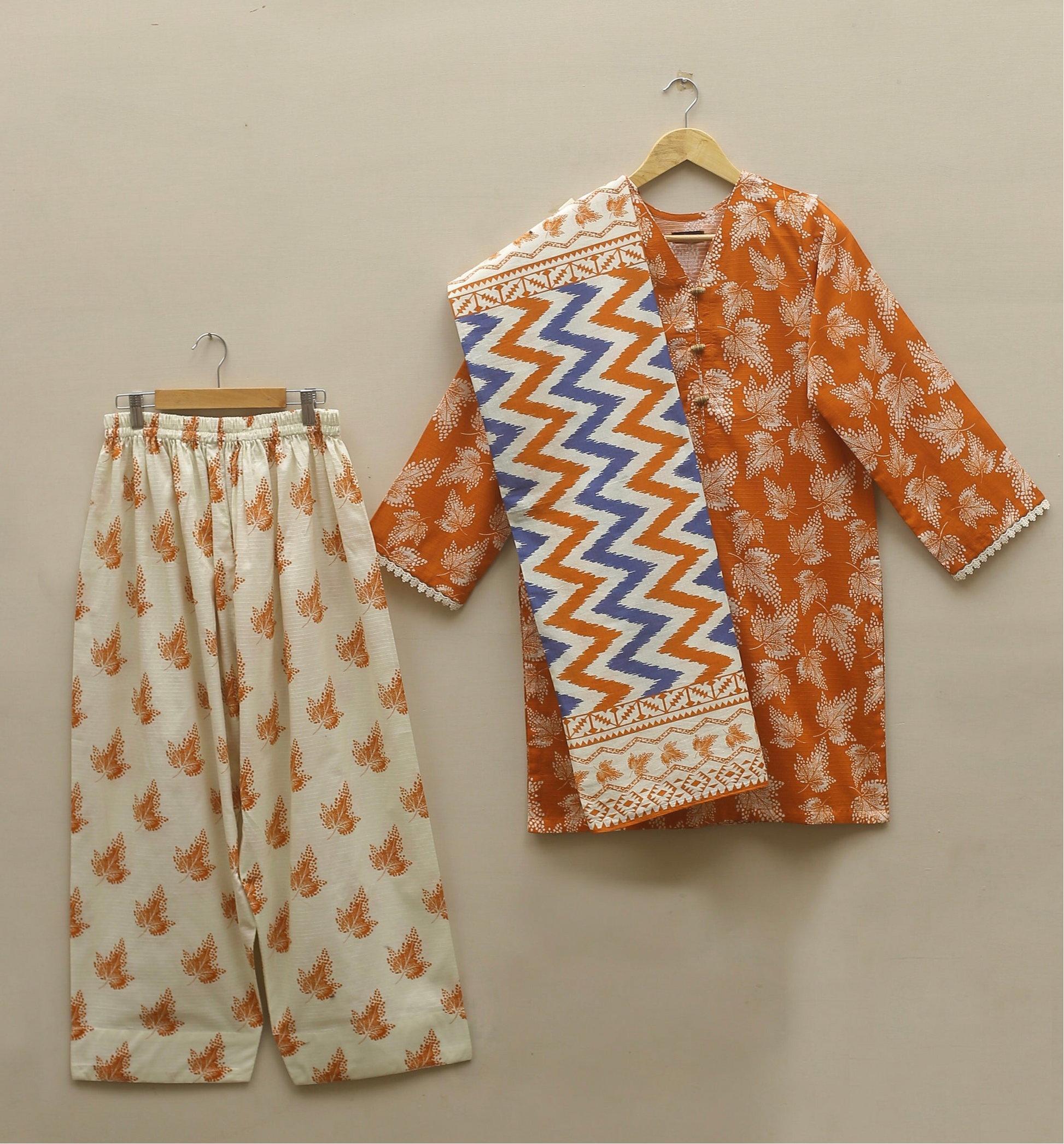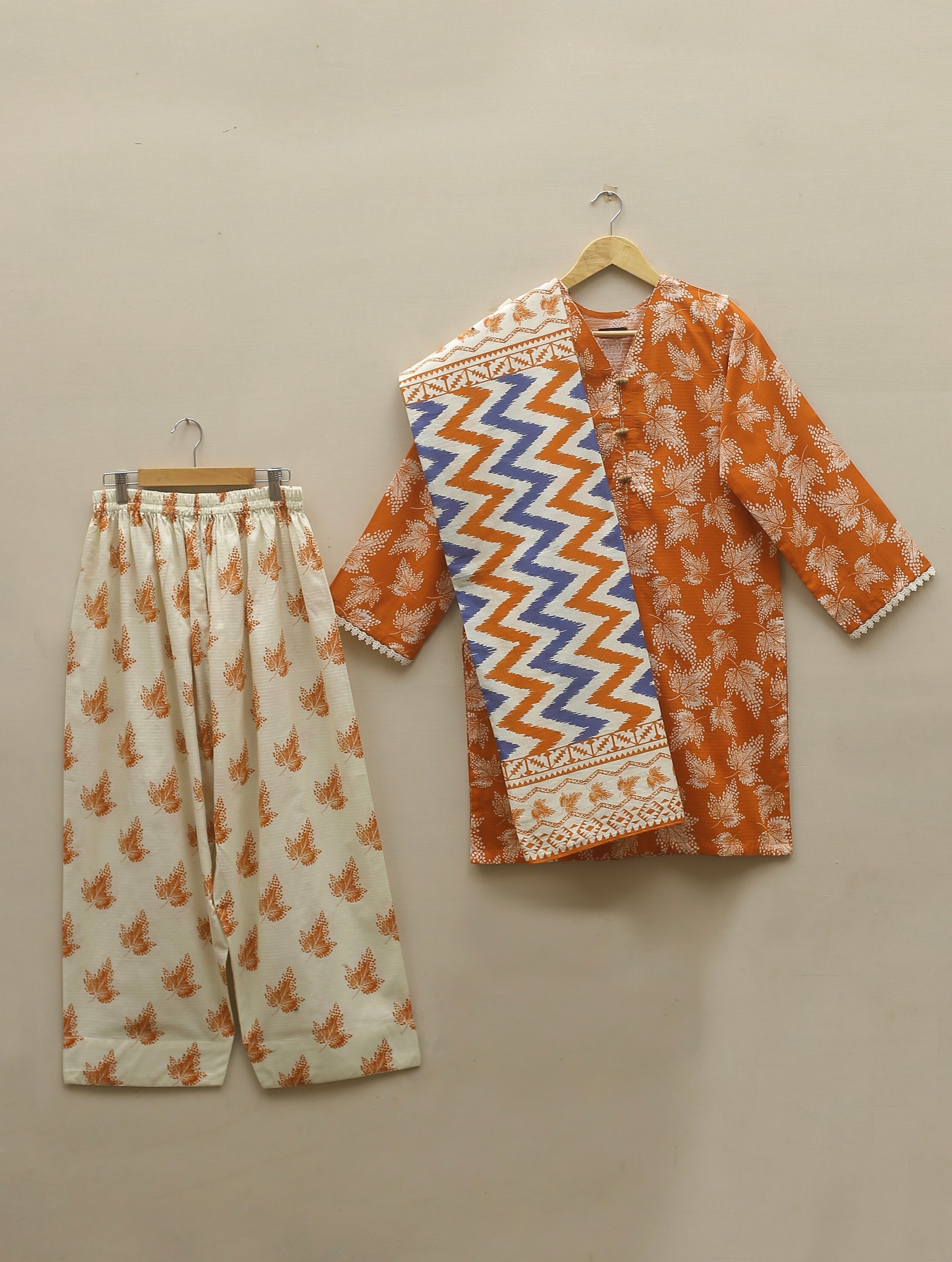This is a 3-piece printed summer suit in breathable bana dora fabric. It features a rust-orange short kurta with white leaf motifs, paired with a cream farshi shalwar adorned with matching prints. The look is completed with a vibrant zigzag patterned dupatta in orange, blue, and white—perfect for keeping cool in style during warm weather.