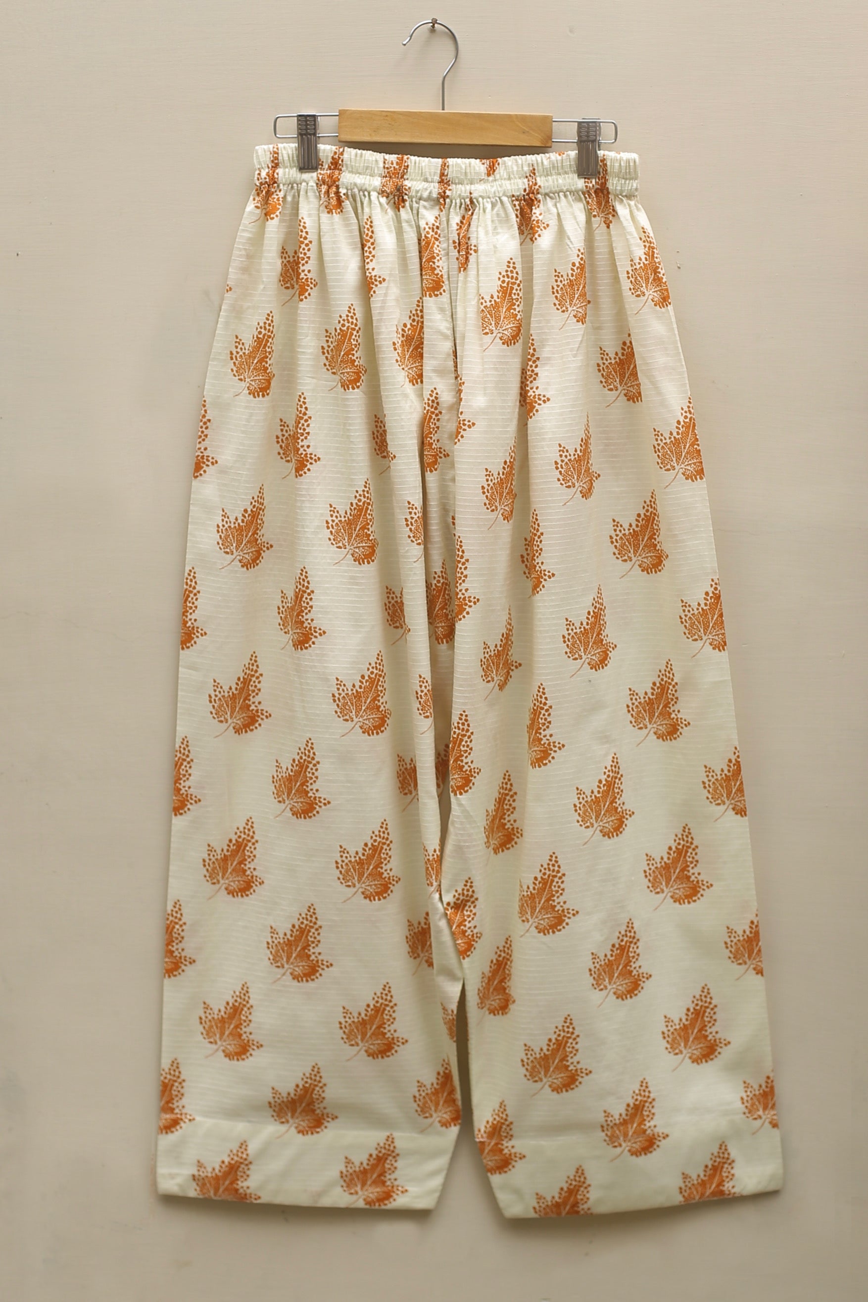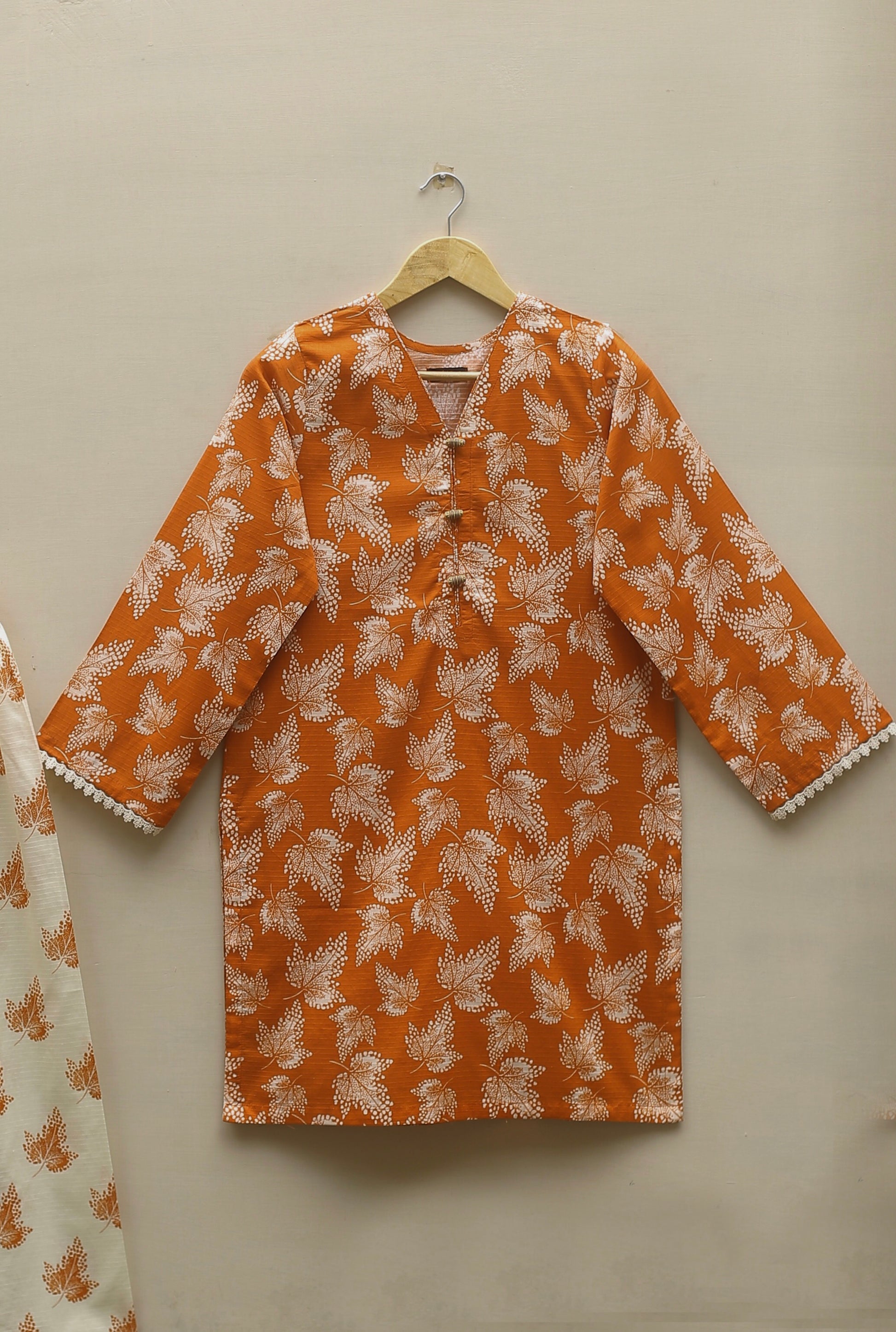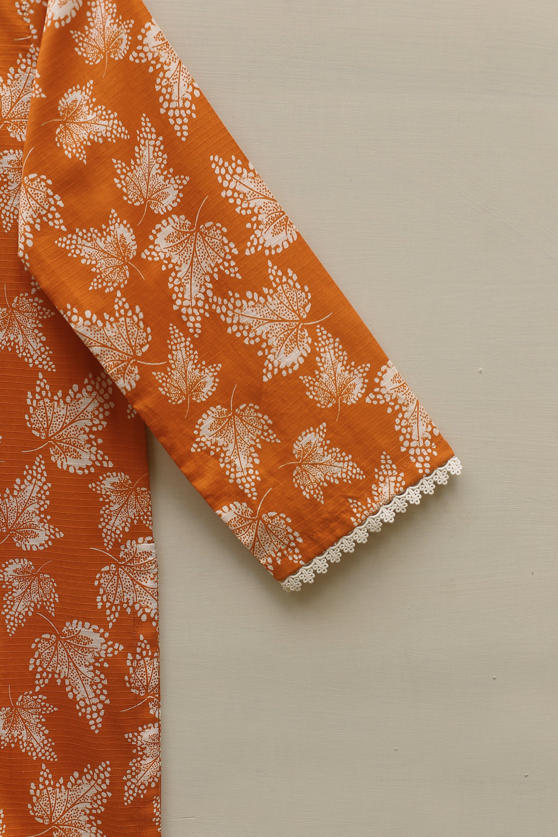 This is a 3-piece printed summer suit in breathable bana dora fabric. It features a rust-orange short kurta with white leaf motifs, paired with a cream farshi shalwar adorned with matching prints. The look is completed with a vibrant zigzag patterned dupatta in orange, blue, and white—perfect for keeping cool in style during warm weather.