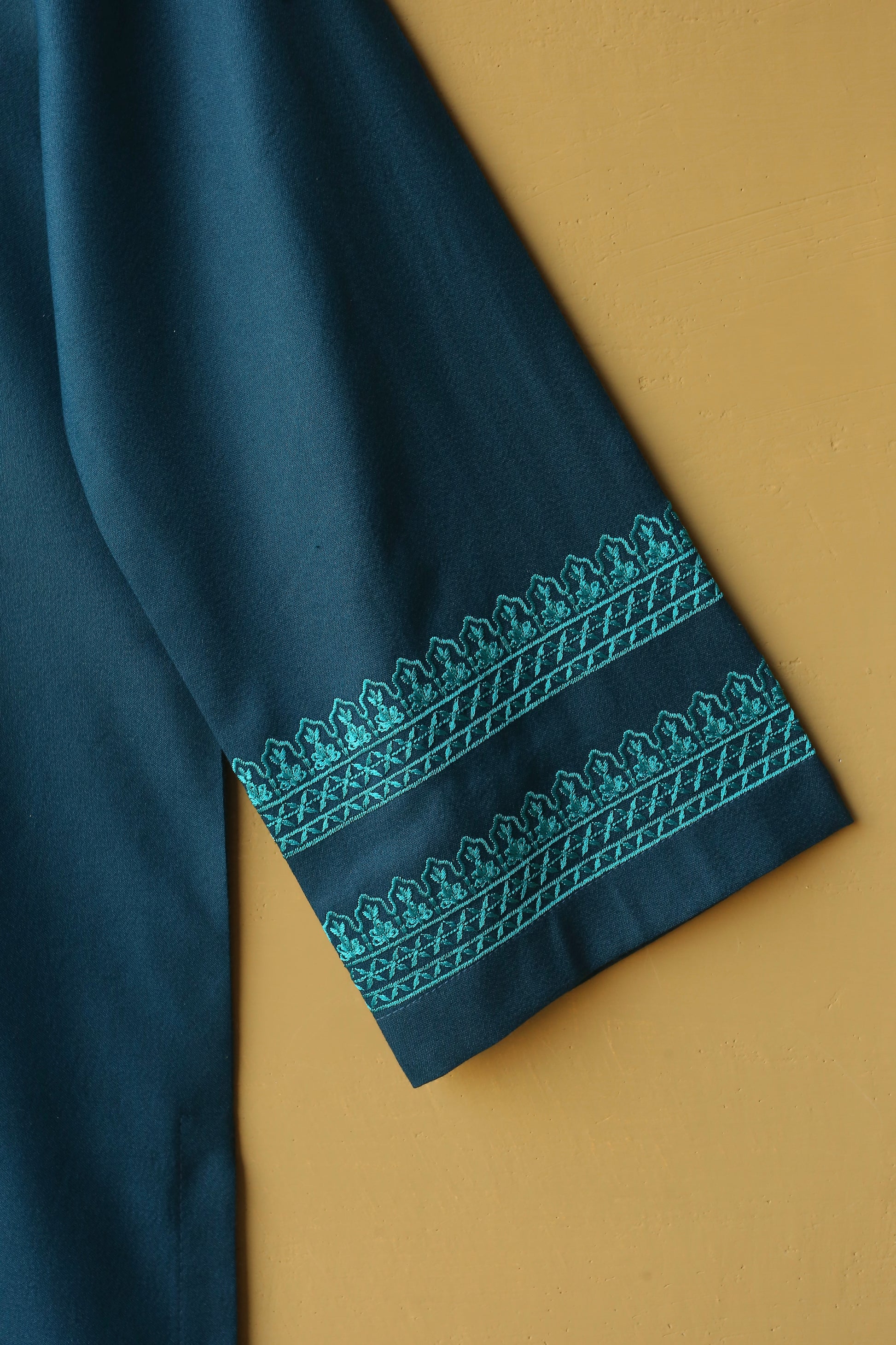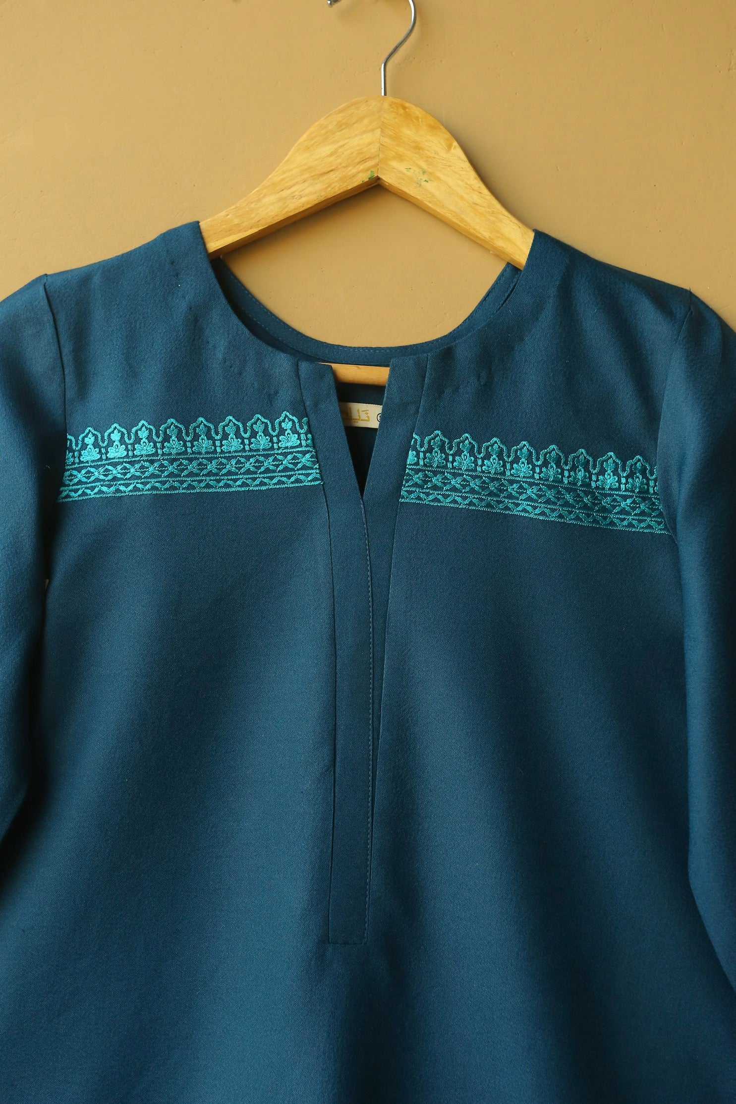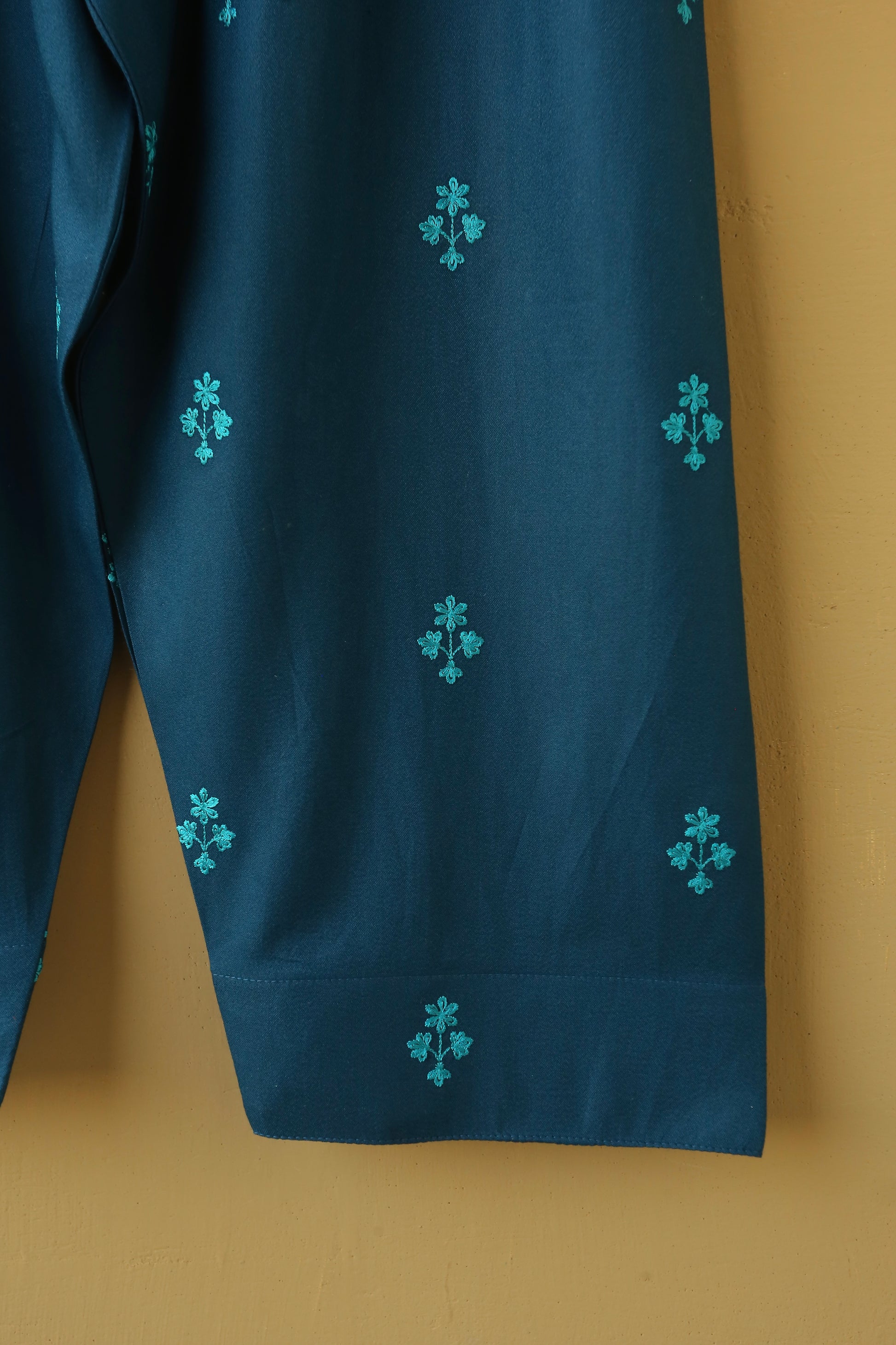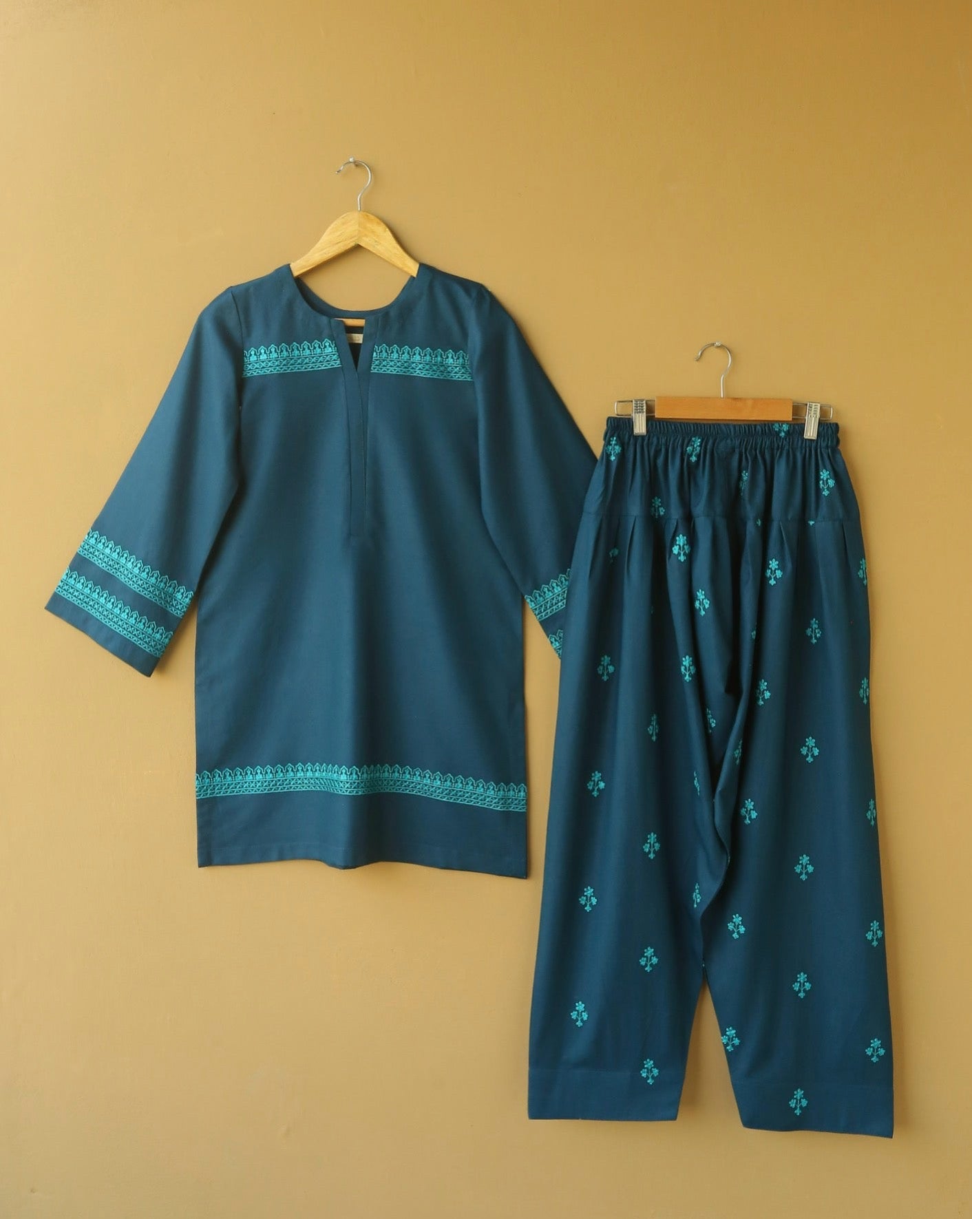 The set features a soft, warm Marina kurta adorned with delicate teal embroidery on the neckline, sleeves and hem, giving it an elegant traditional touch. Paired with it is a matching embroidered shalwar, designed with scattered motifs that complete the look perfectly.