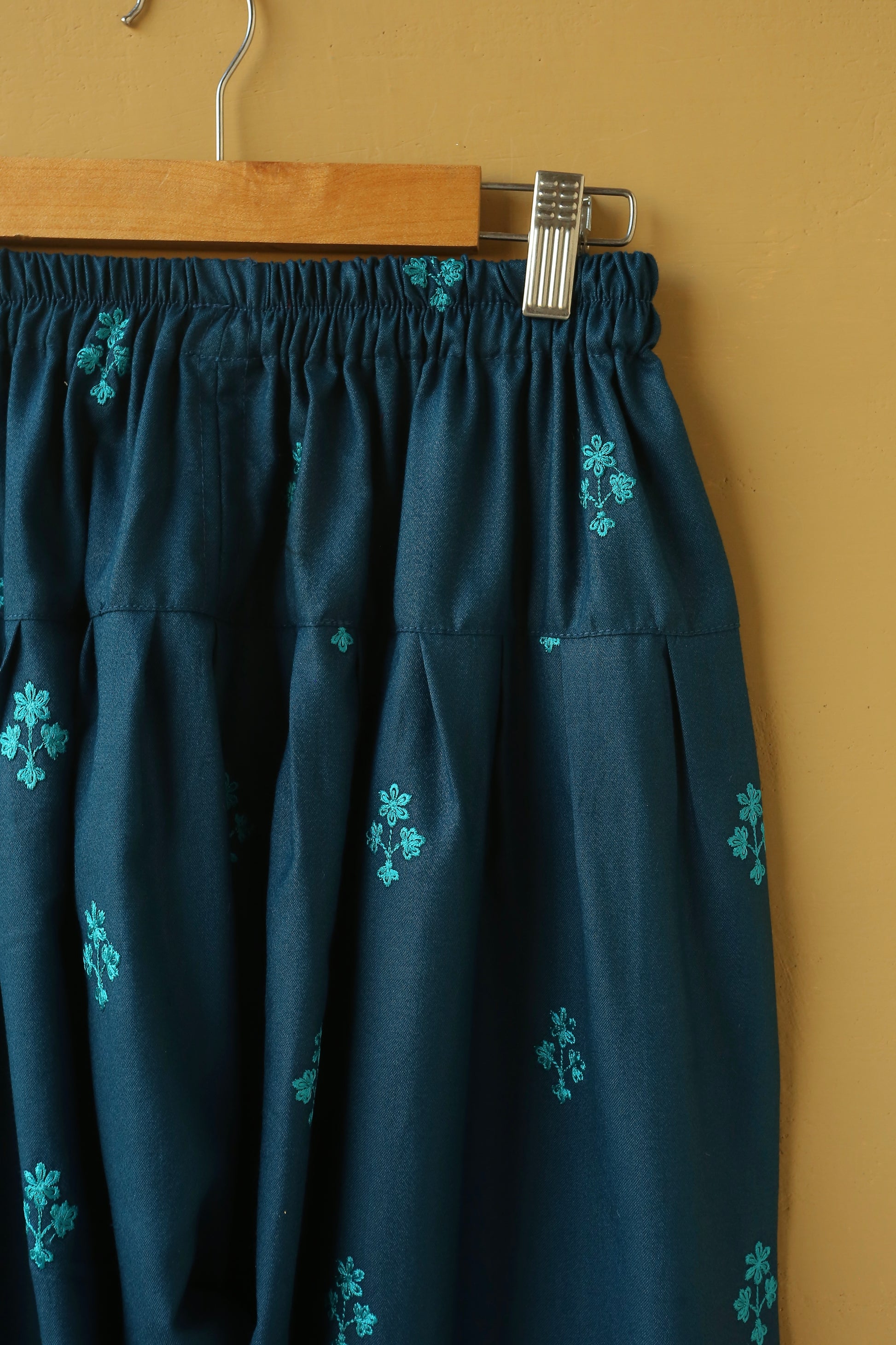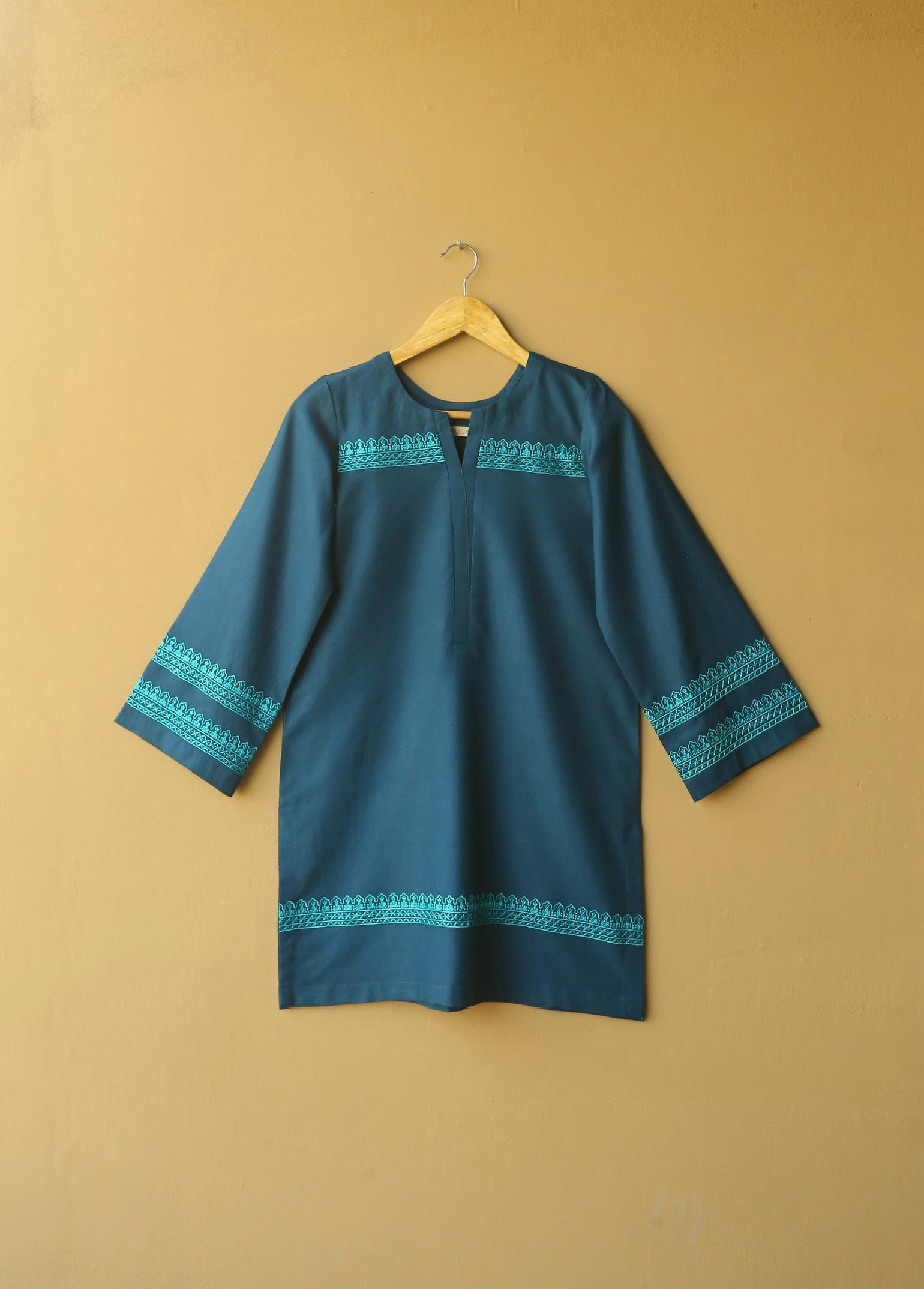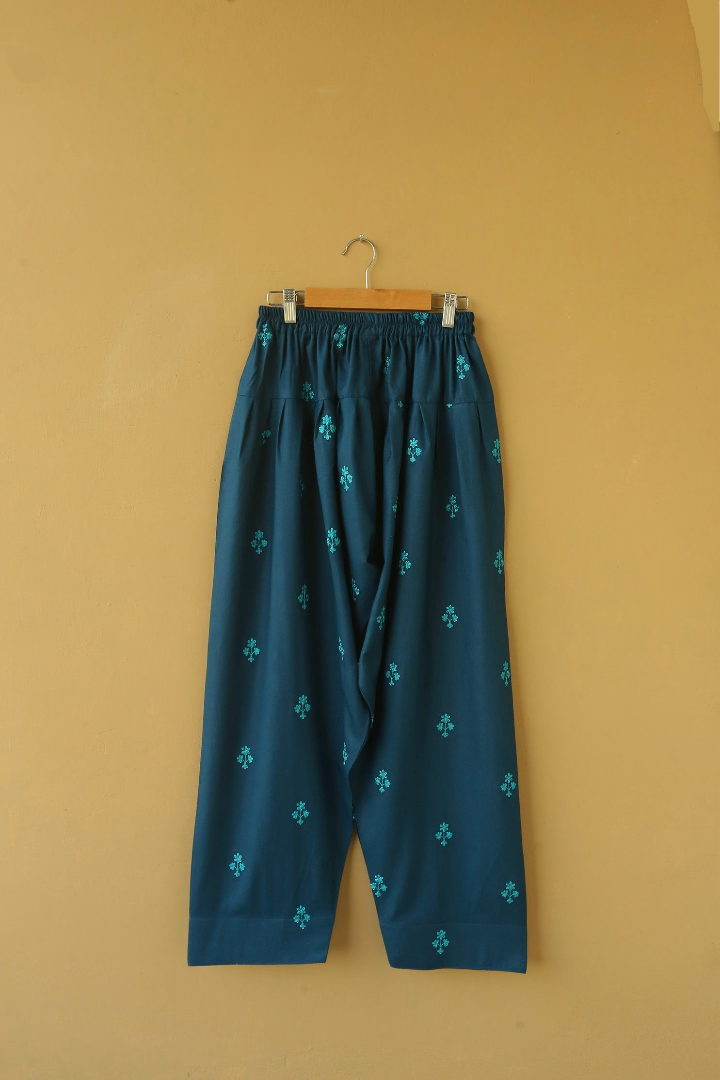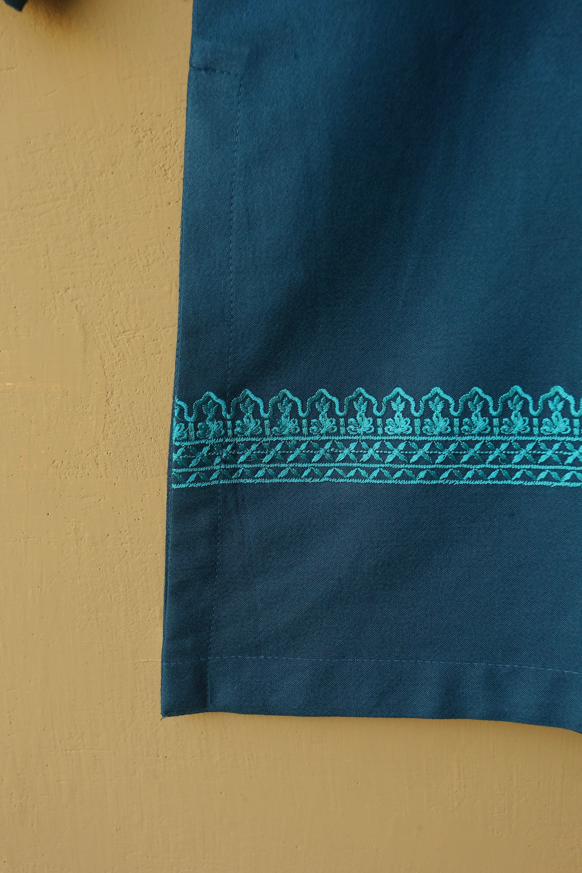 The set features a soft, warm Marina kurta adorned with delicate teal embroidery on the neckline, sleeves and hem, giving it an elegant traditional touch. Paired with it is a matching embroidered shalwar, designed with scattered motifs that complete the look perfectly.