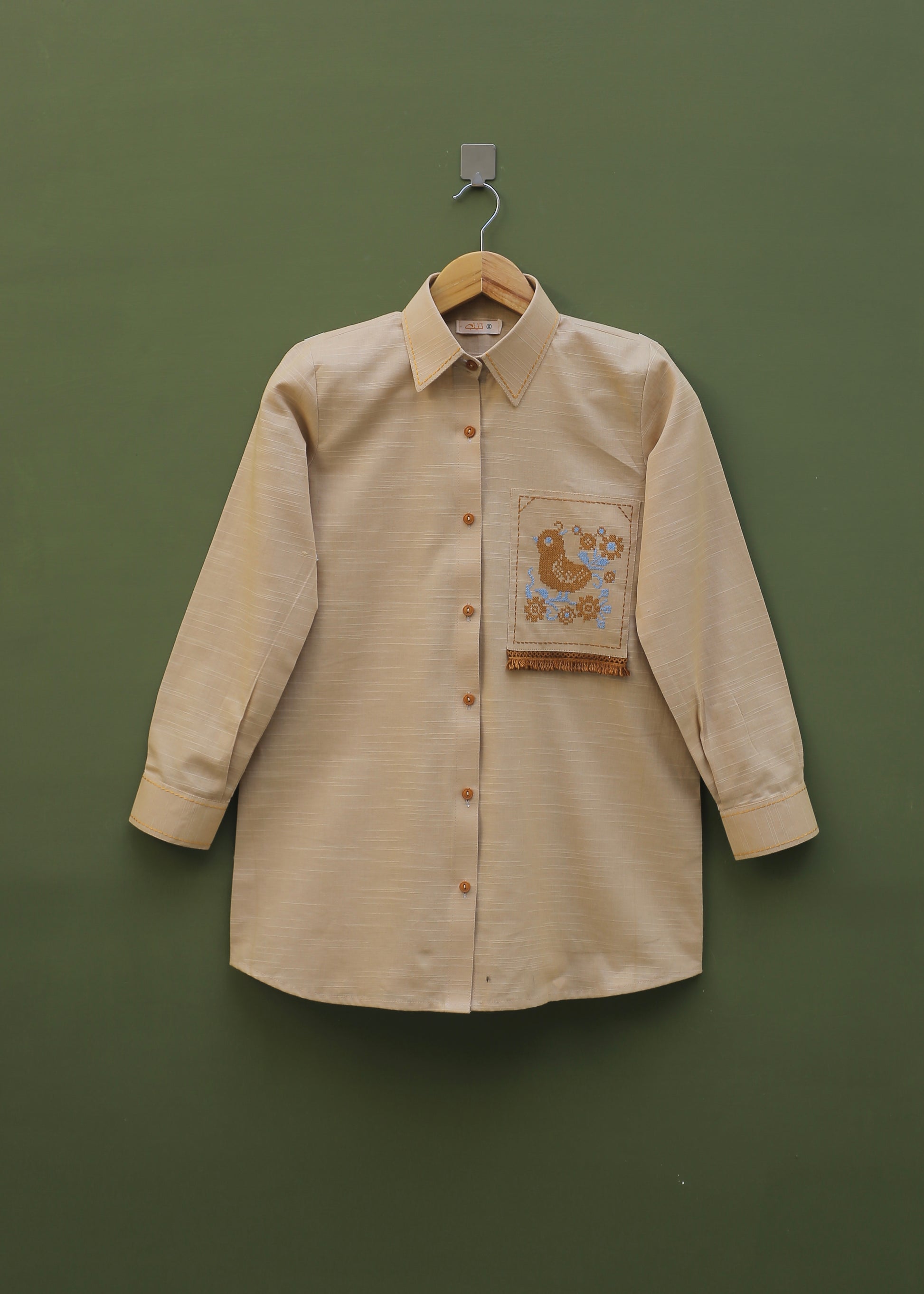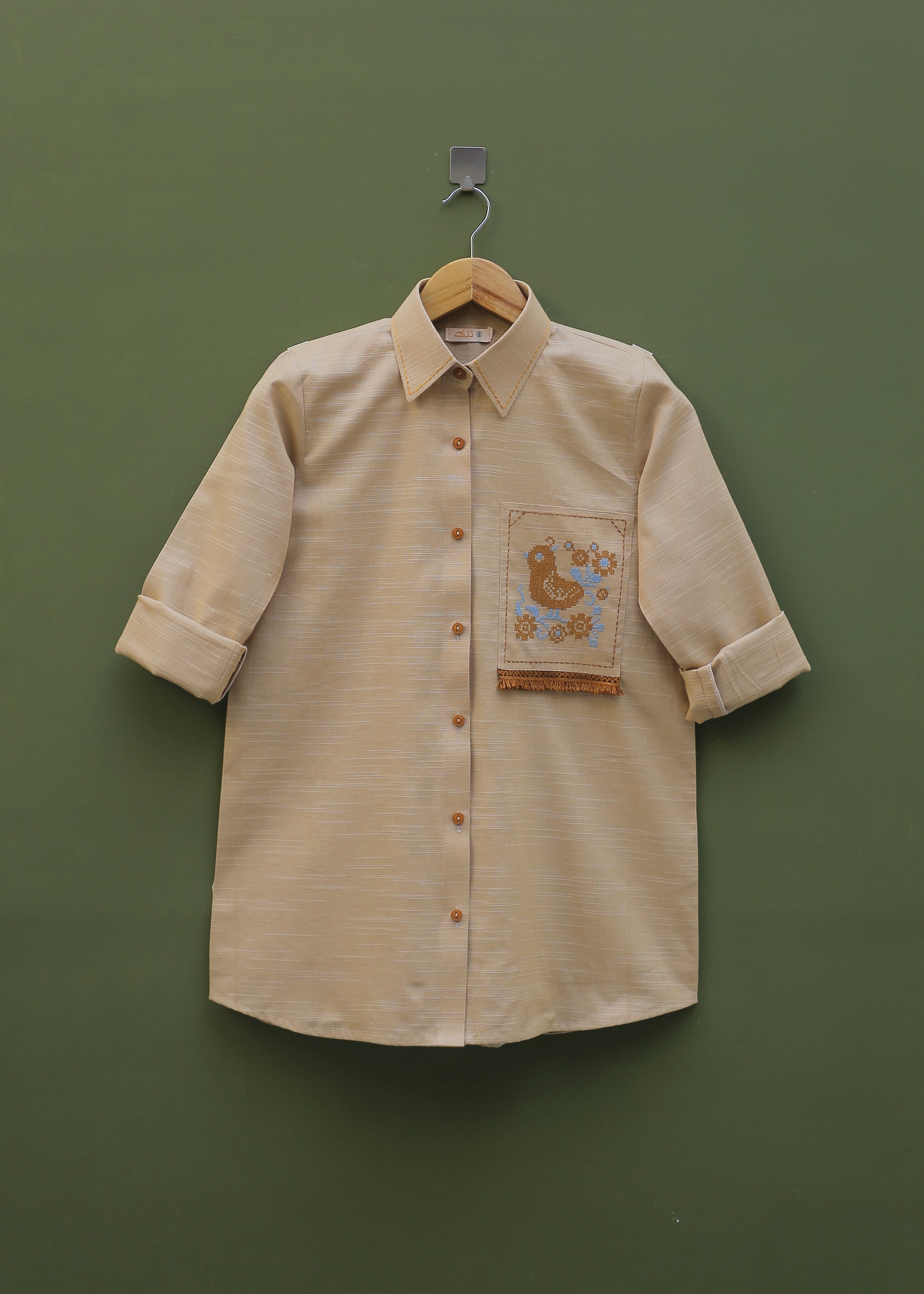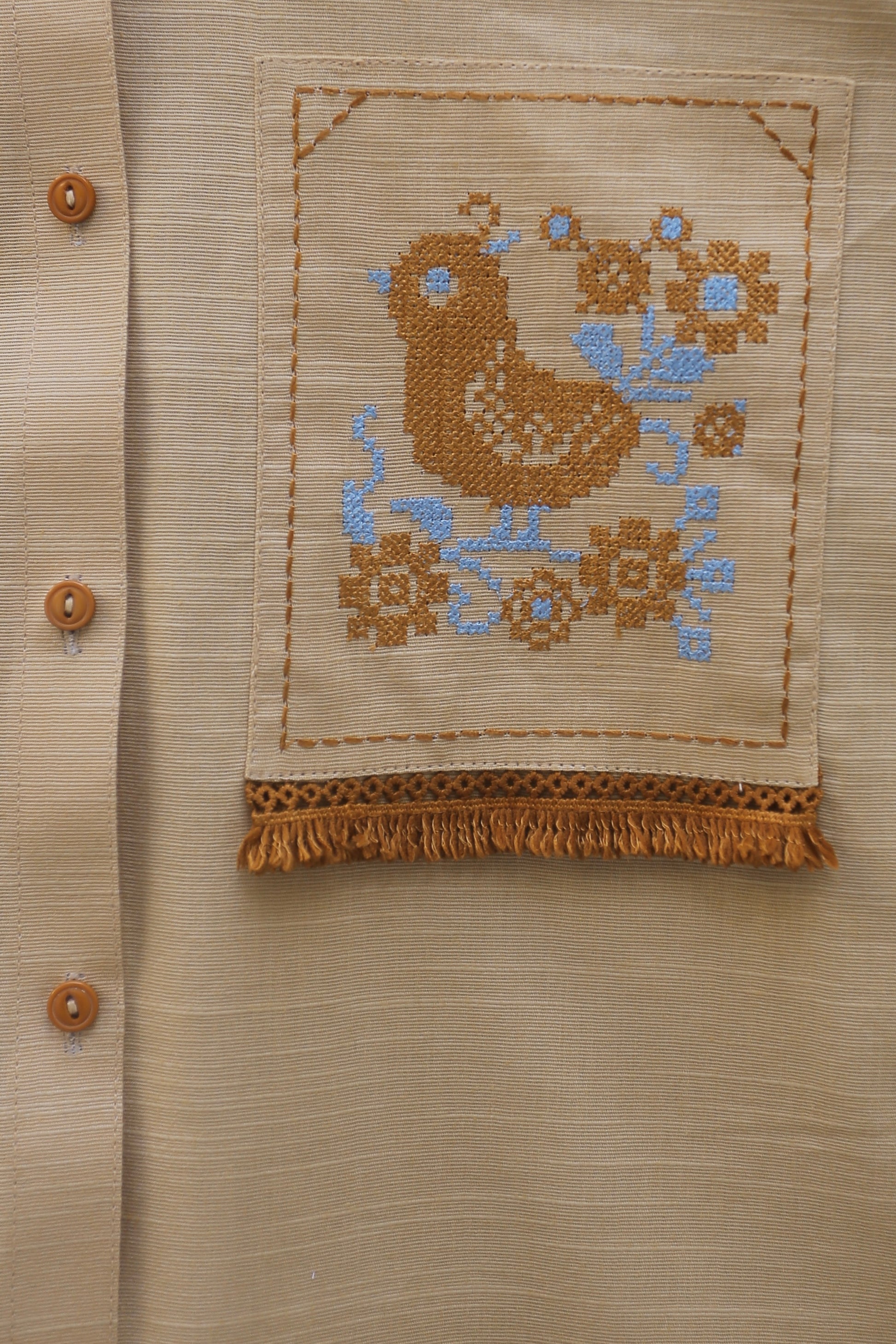 This stylish skin-colored button down top features a unique embroidered pocket created using cross-stitch technique, adding a charming detail. The top is designed with a classic collar and cuff sleeves, both adorned with intricate embroidered stitch techniques. This piece is perfect for adding a touch of elegance to your outfit while keeping it casual.