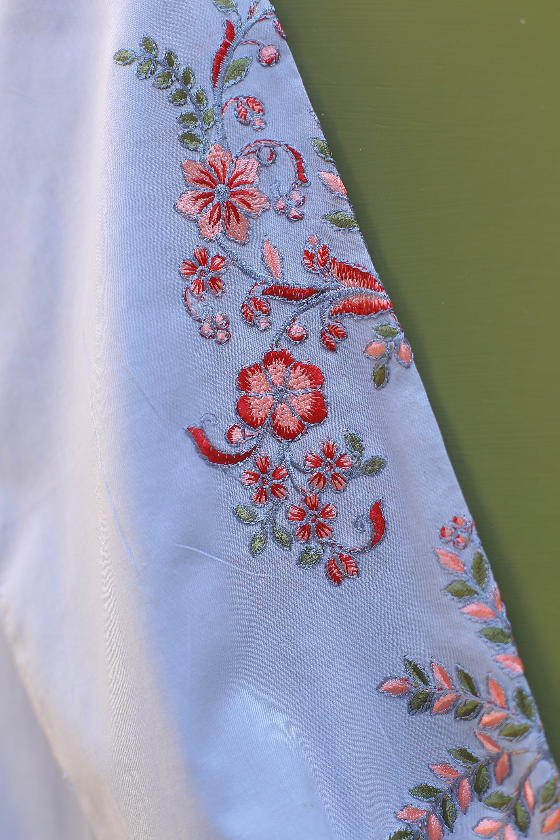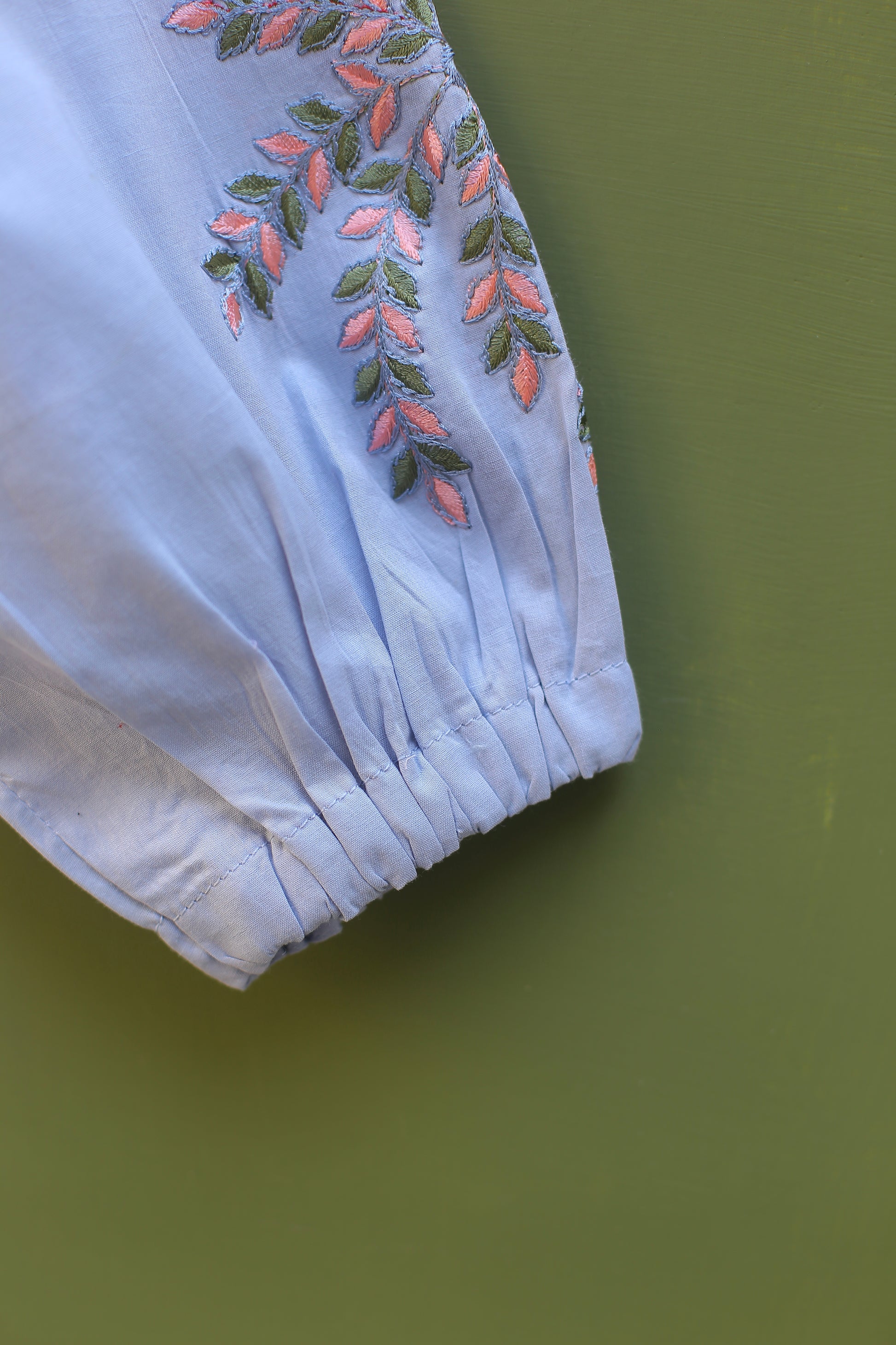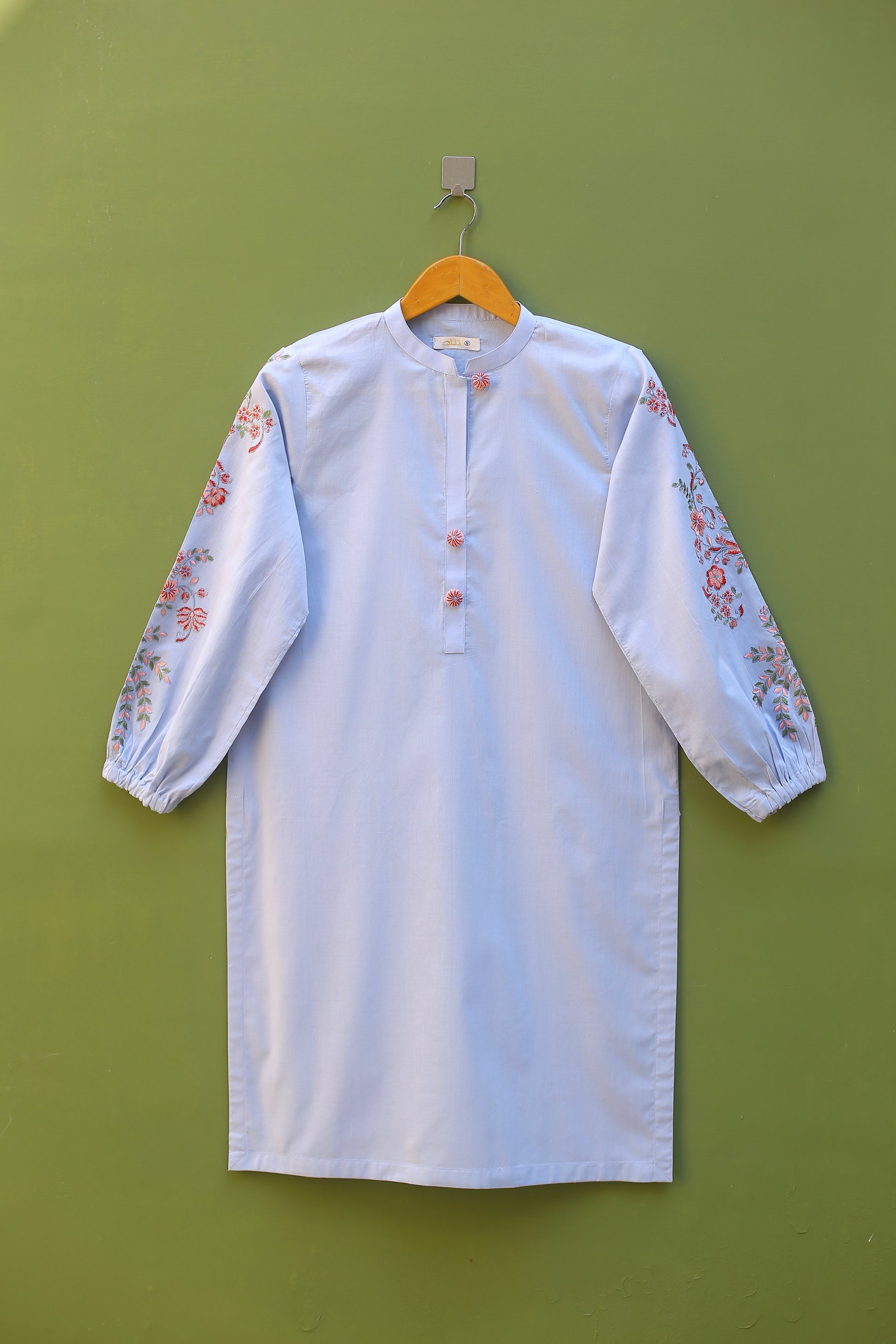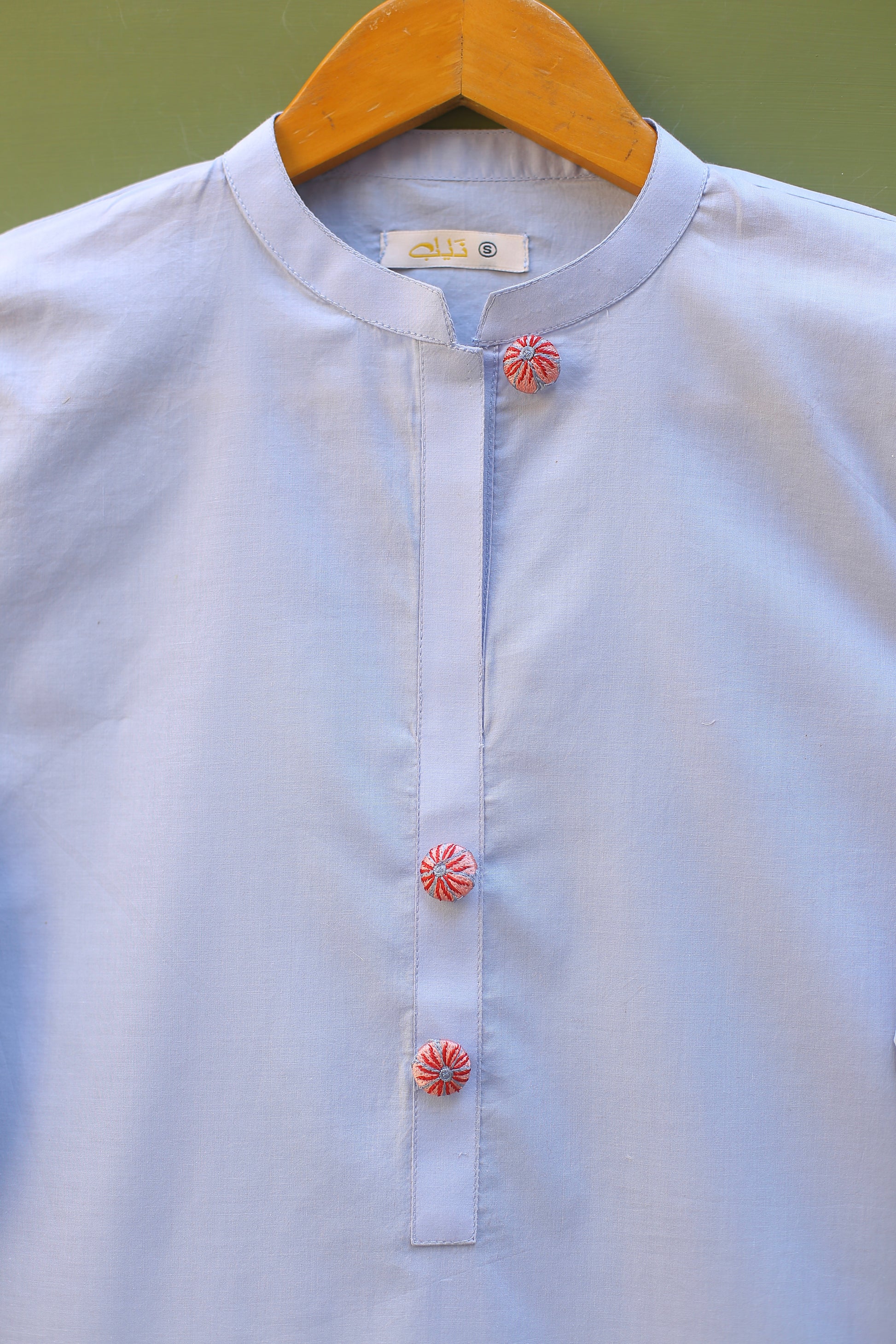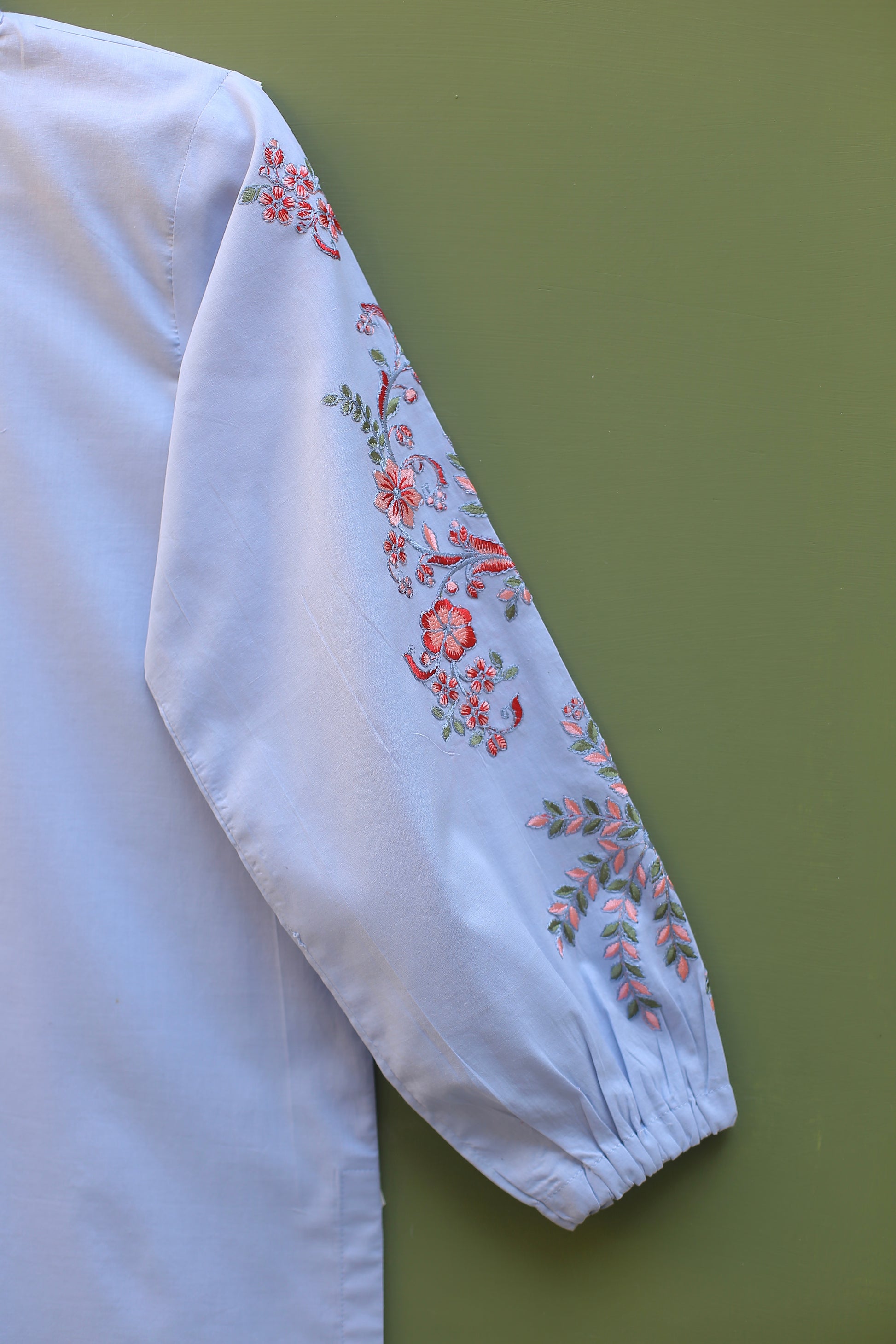 This elegant ice blue kurta features a banned collar, embroidered sleeves, and a ribbed opening for comfort. The neckline is adorned with embroidered buttons, adding a refined touch. Perfect for any occasion!